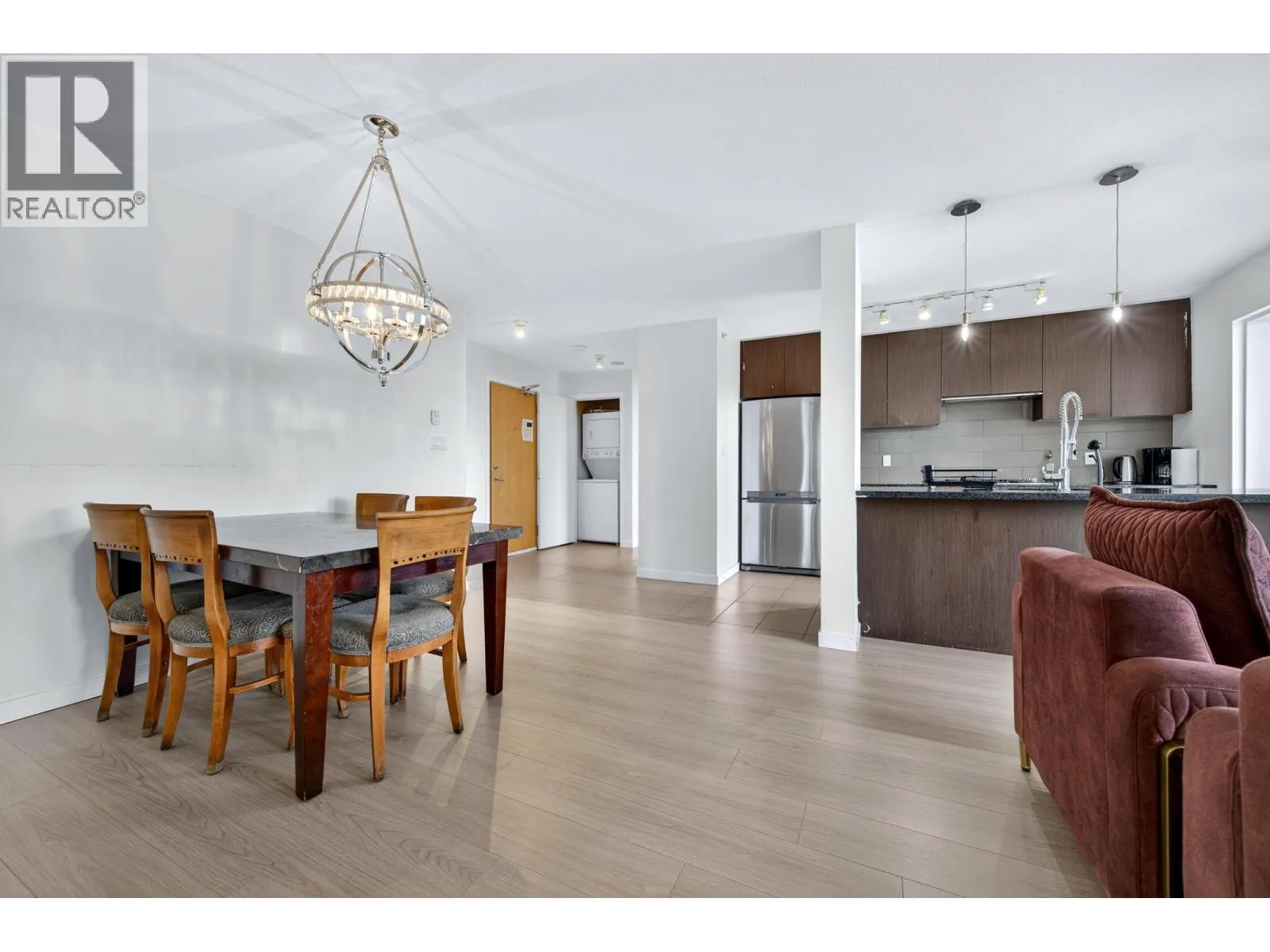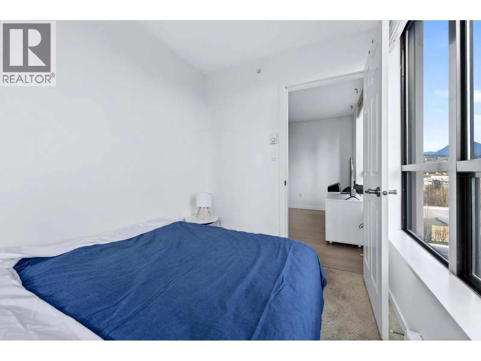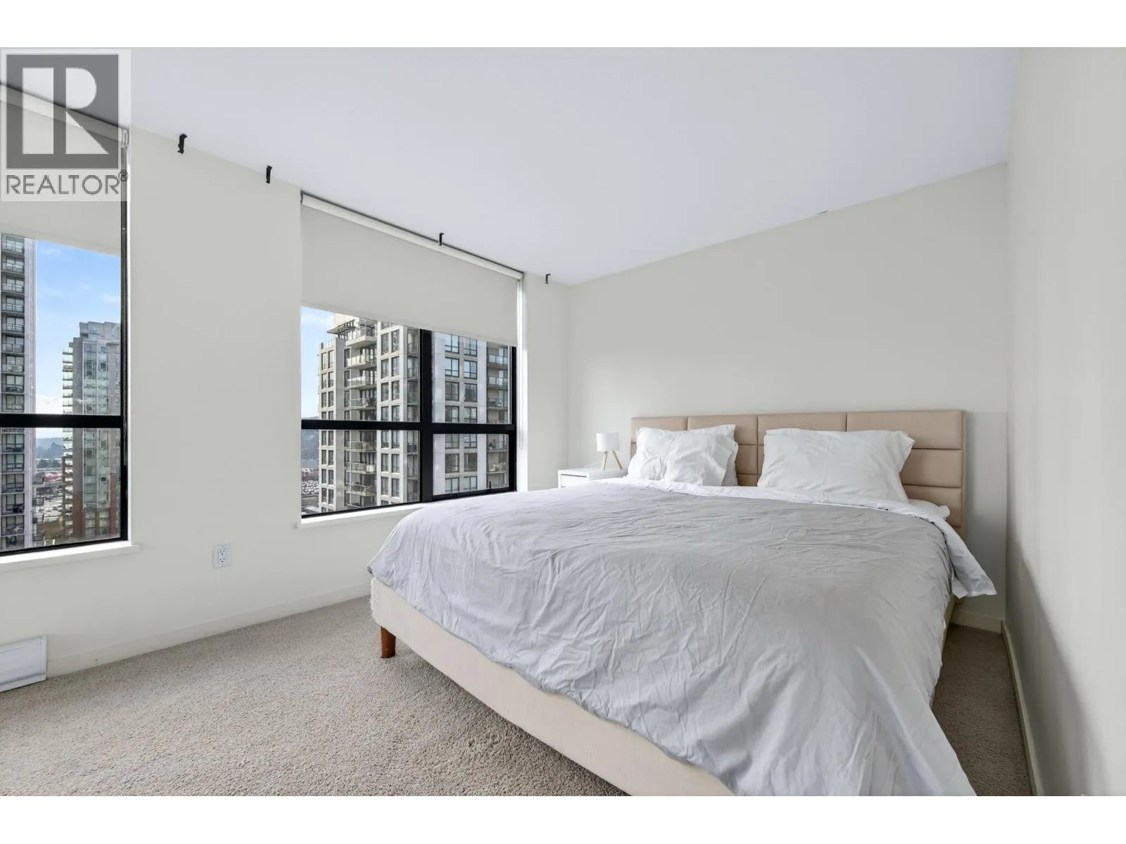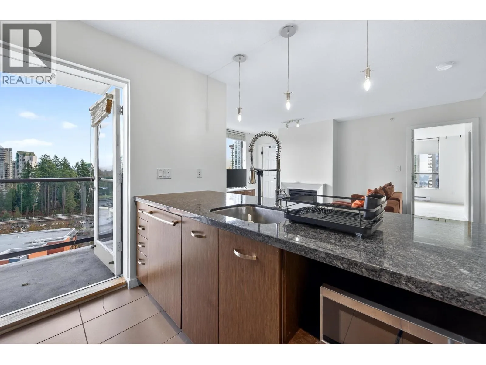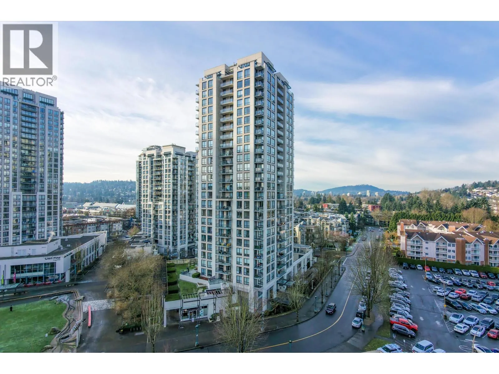 Rarely available Southeast corner unit, bright 2 bedroom + den + 2 bathroom home by BOSA in a concrete high-rise in North Coquitlam. Efficient layout with generous living and dining areas, large windows, and city and mountain views. Primary bedroom with ensuite plus a versatile den ideal for office or guest room. Functional kitchen with ample storage, in-suite laundry, and
