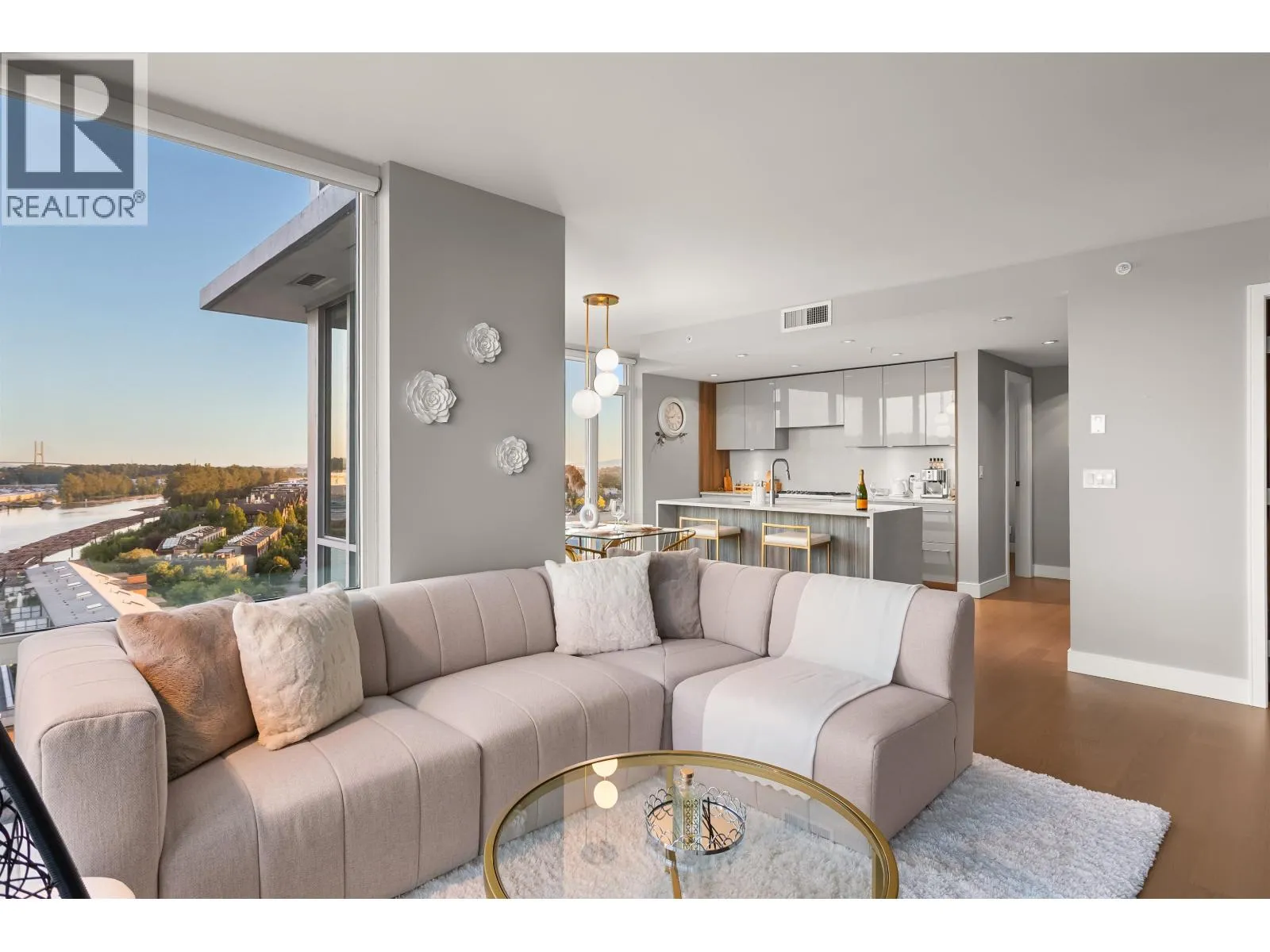 Welcome to The Peninsula, where riverfront living meets everyday luxury. This beautifully maintained CORNER residence is filled with natural light + showcases breathtaking SE views of the Fraser River through bright floor-to-ceiling windows. 2 bed 2 bath 1,104 sf + 72 sf balcony, the home features premium Gaggenau appliances, hardwood flooring, 5-piece ensuite + newer laundry appliances. Enjoy 15hr concierge
