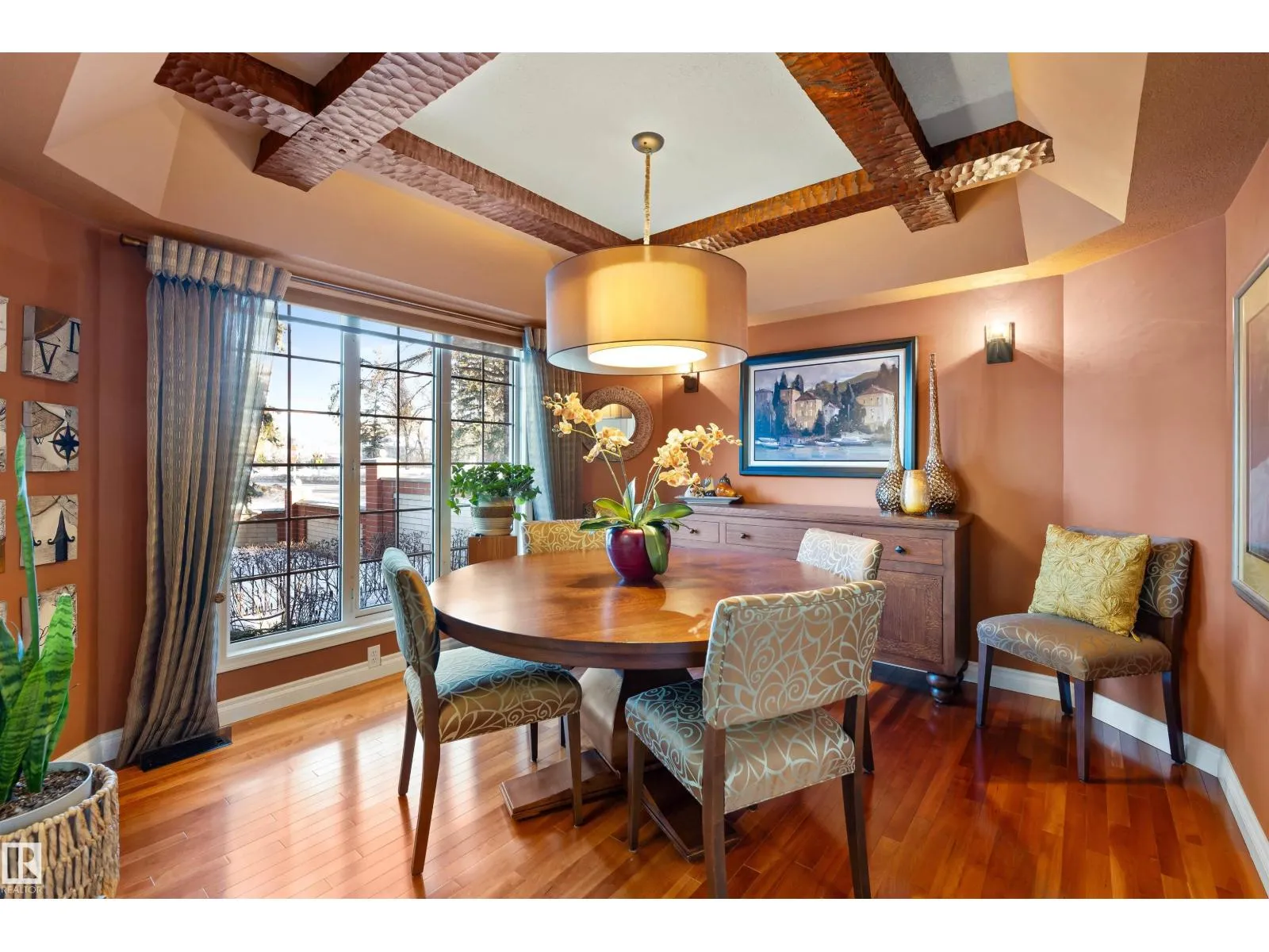 Nestled onto the desirable street of Berrymore Drive, discover this custom built ORIGINAL OWNER EXECUTIVE BUNGALOW. An impressive front courtyard welcomes guests w/ beautiful landscaping & morning sun exposure. The foyer has newer oversized tiles & opens into SOARING VAULTED CEILINGS. The dining room has a coffered ceiling w/ beams & Canadian cherry HARDWOOD FLOORING. The renovated kitchen has white