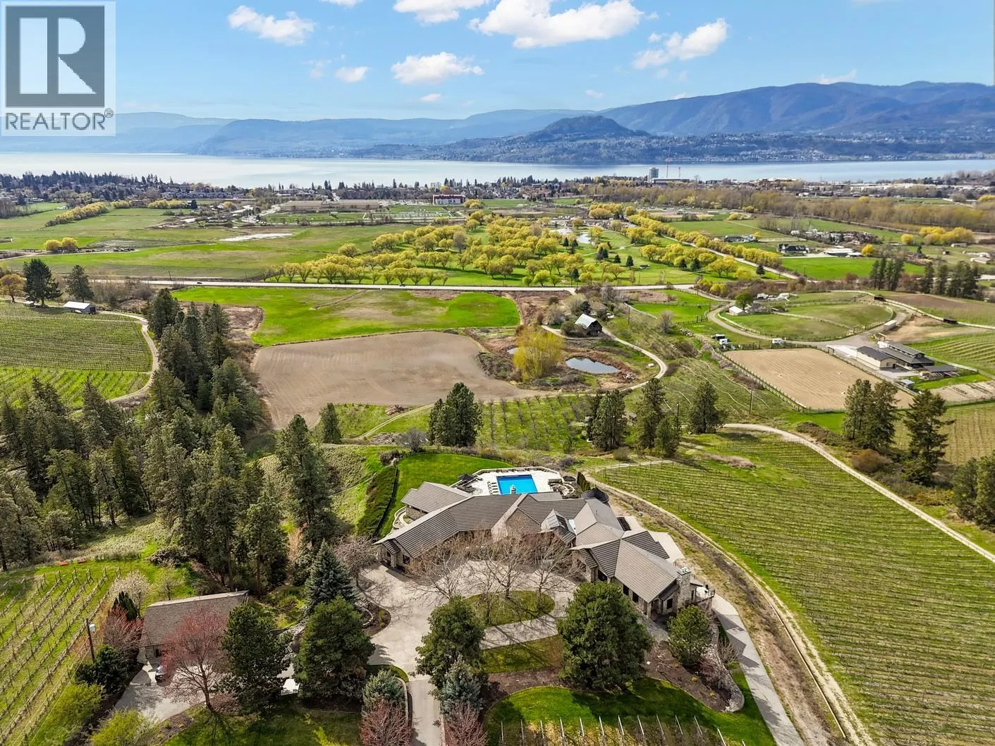 A rare and remarkable estate opportunity, this scenic 9.23-acre property is set just 10 minutes from the heart of Kelowna, offering privacy, scale, and breathtaking lake and city views. Surrounded by manicured gardens, the main residence is thoughtfully positioned to overlook rolling farmland below, with a poolside setting designed to capture the beauty of the Okanagan landscape. The luxury home