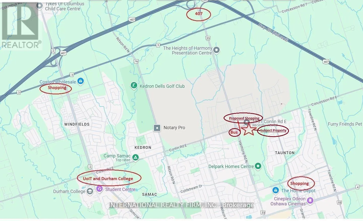 Excellent opportunity to purchase one of the last few infill development sites in North Oshawa. Proximity to UoIT, Durham college and Hwy 407 and numerous other amenities. Approximately 1 acre with bungalow near the intersection of Harmony and Conlin Rd. Situated immediately adjacent to proposed central neighborhood shopping area. Potential to develop into either stacked townhomes or retail