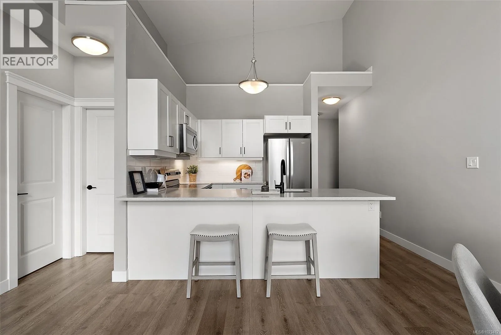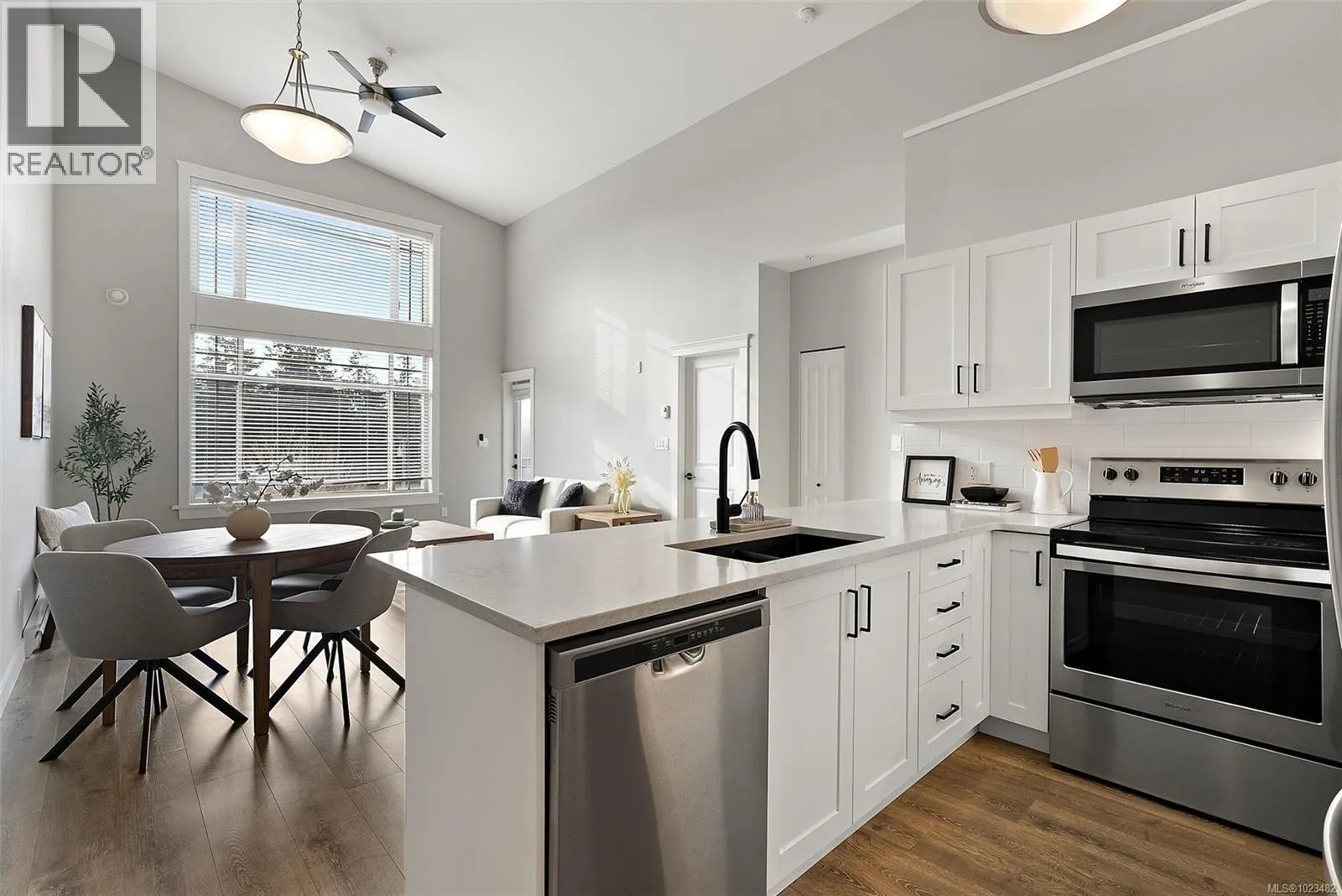 OPEN HOUSE | SUN JAN 25 | 1–3 PM Top-floor and one of the largest units in the building, this 2-bedroom, 2-bathroom condo at 844 Goldstream Avenue is located in the heart of Langford and showcases impressive 17-foot vaulted ceilings with a bright, open-concept living, dining, and kitchen layout. Large windows flood the home with natural light, creating an airy
