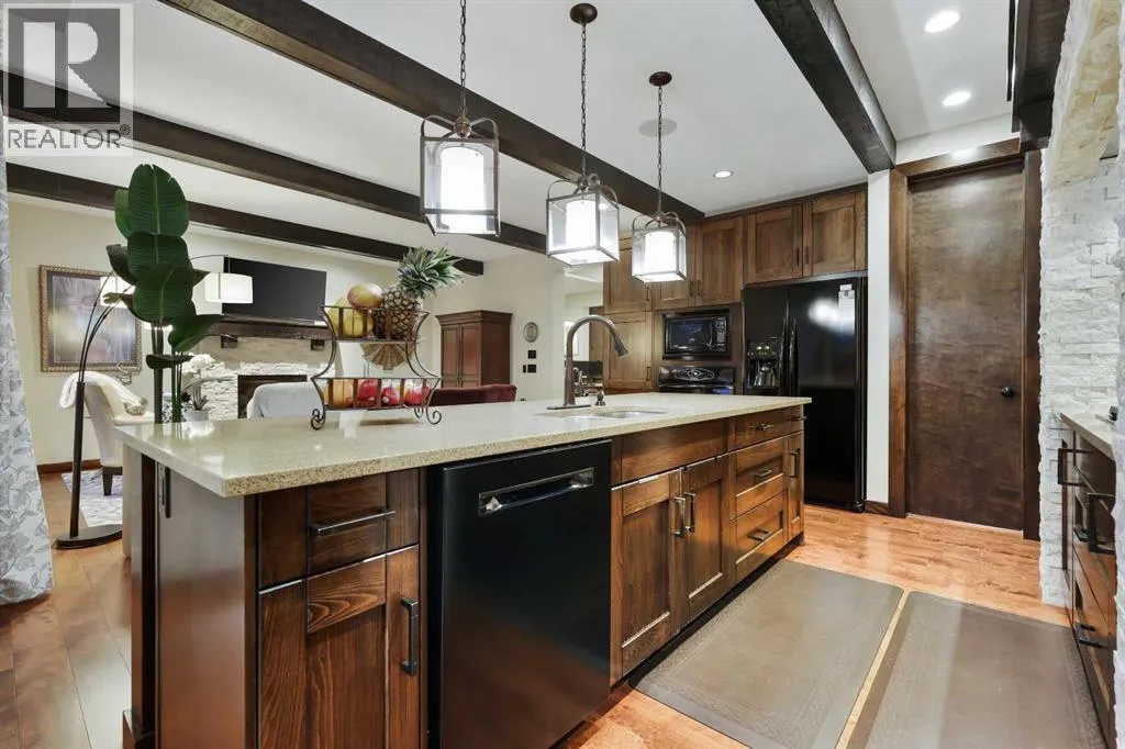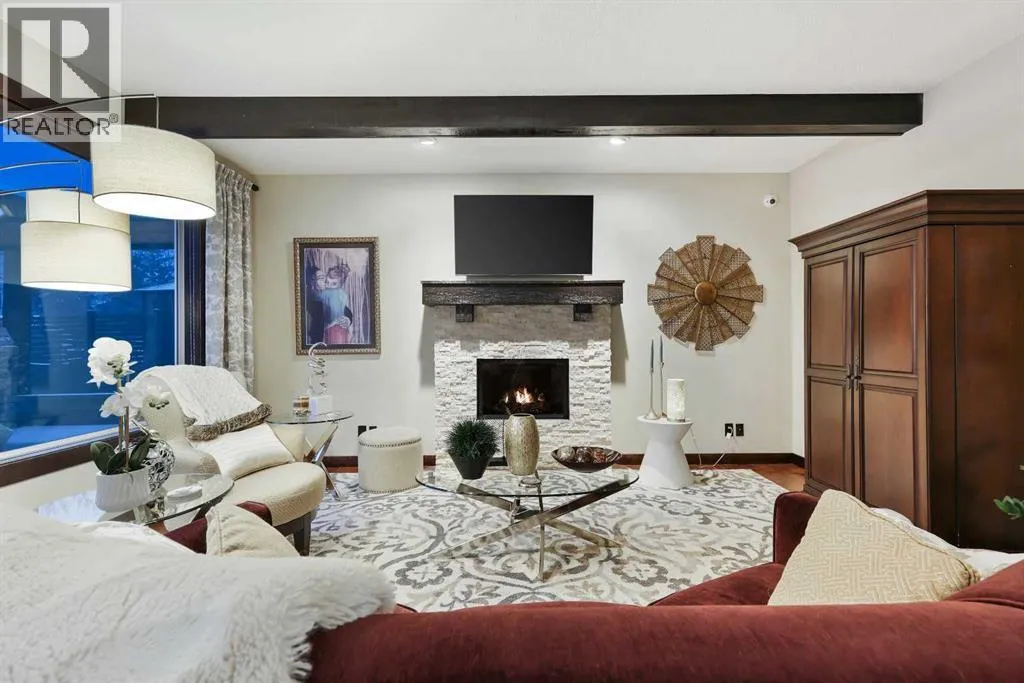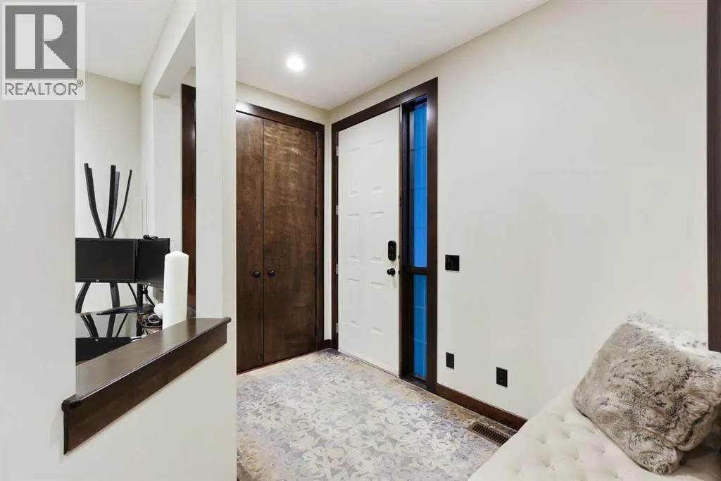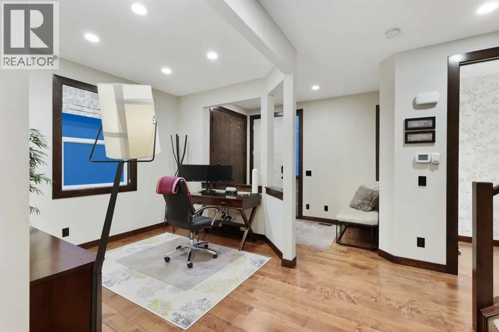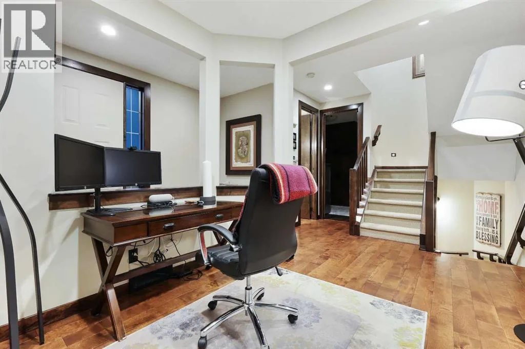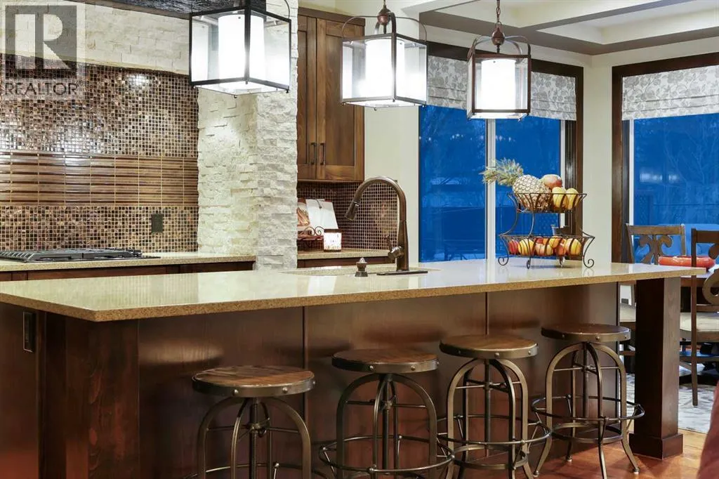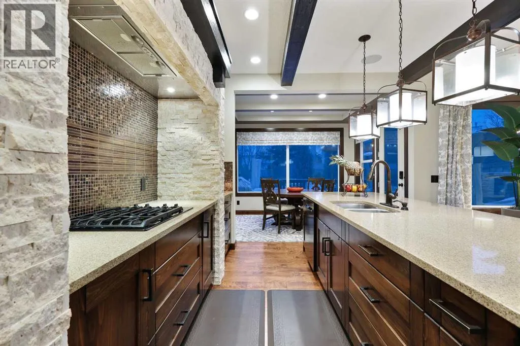 a front-yard patio, framed by maintenance-free front landscaping(2024). The fully landscaped backyard (2018) features patios, walkways, greenscapes, and sod replacement, all supported by a full irrigation system and enhanced by Kichler outdoor lighting (2024). BriteHouse permanent full-perimeter lighting (2025) adds year-round curb appeal and convenience. Outdoor living is elevated with a custom cedar deck and pergola, complete with privacy screens, integrated lighting, and a natural gas fireplace mortared in place. The chef-inspired kitchen blends warmth, craftsmanship, and function with rich cabinetry, stone detailing, exposed beams, and an expansive island with seating. A walk-through pantry adds exceptional storage and seamless flow, keeping the main kitchen beautifully organized. The large bonus room provides the perfect family space, while the upper-floor recessed balcony offers an elegant retreat to enjoy a glass of wine while watching the sunset. The fully finished, insulated double attached garage features in-floor radiant heating powered by the tankless hot water system, MotoFloor garage tiles, full-length shelving, and impressive vertical storage—delivering year-round comfort and exceptional functionality. Inside, architectural details and premium finishes continue with 9’ ceilings and 8’ doors, vaulted and beamed elements, and birch hardwood flooring throughout the main floor (2021). Custom Calgary Window Fashions drapery and valances (2022), custom laundry cabinetry (2021), and Spectra Light window film—tin ted in the bonus room and frosted on the main floor (2020)—add tailored sophistication, privacy, and comfort. Extensive mechanical upgrades provide peace of mind, including flood-proofing measures suitable for flood-fringe areas, a suspended furnace, sump pump, and a tankless hot water heater supplying both domestic hot water and the garage’s radiant floor heating. Notably, no homes in Quarry Park sustained water damage during the 2013 floods. The home is fully integrated with Control4 smart-home automation, professionally installed and supported by smartSPACE Solutions, with optional ADT/Telus security integration. Steps from river pathways, parks, schools, and shopping, this meticulously upgraded residence delivers an exceptional luxury lifestyle in one of Calgary’s most desirable communities. (id:62650)