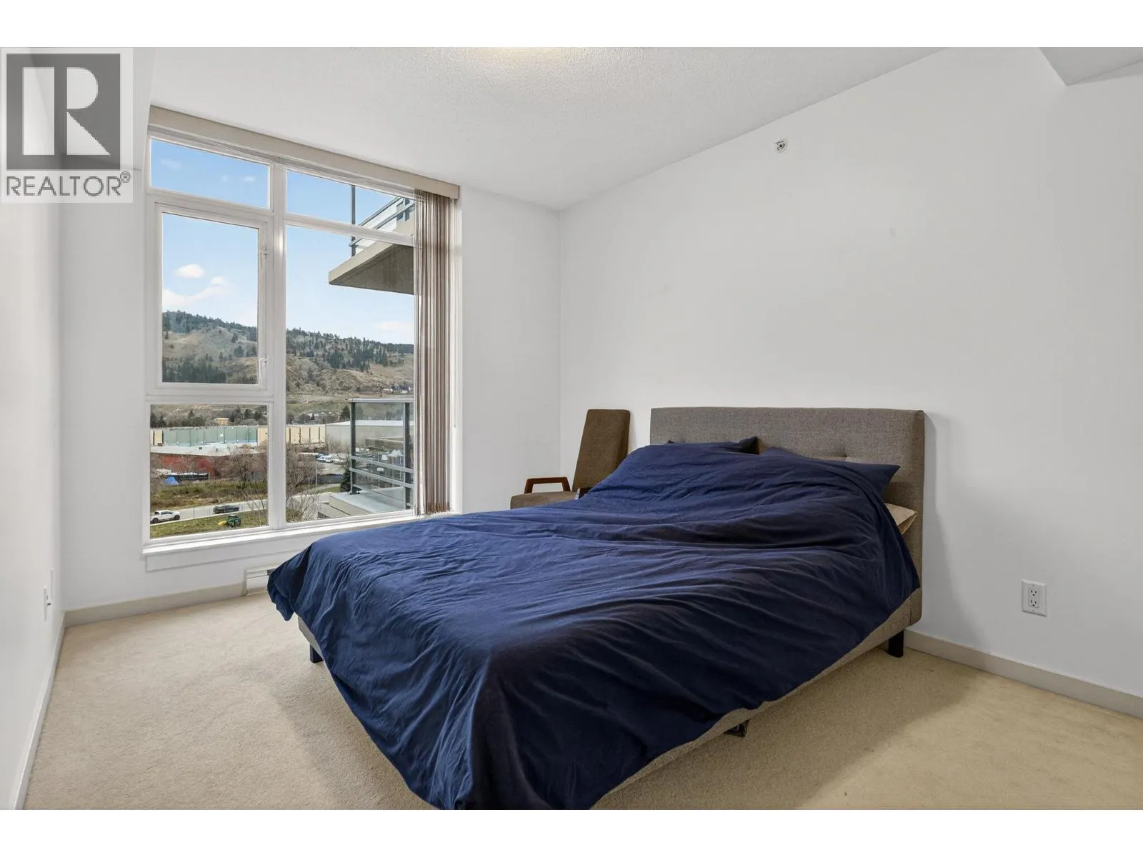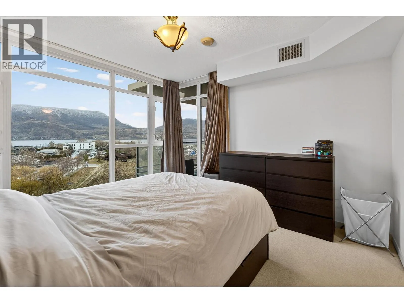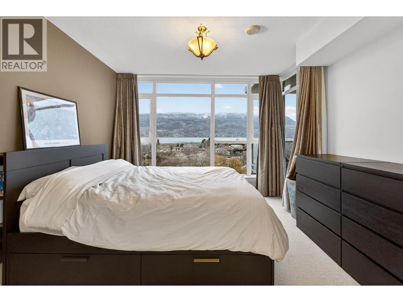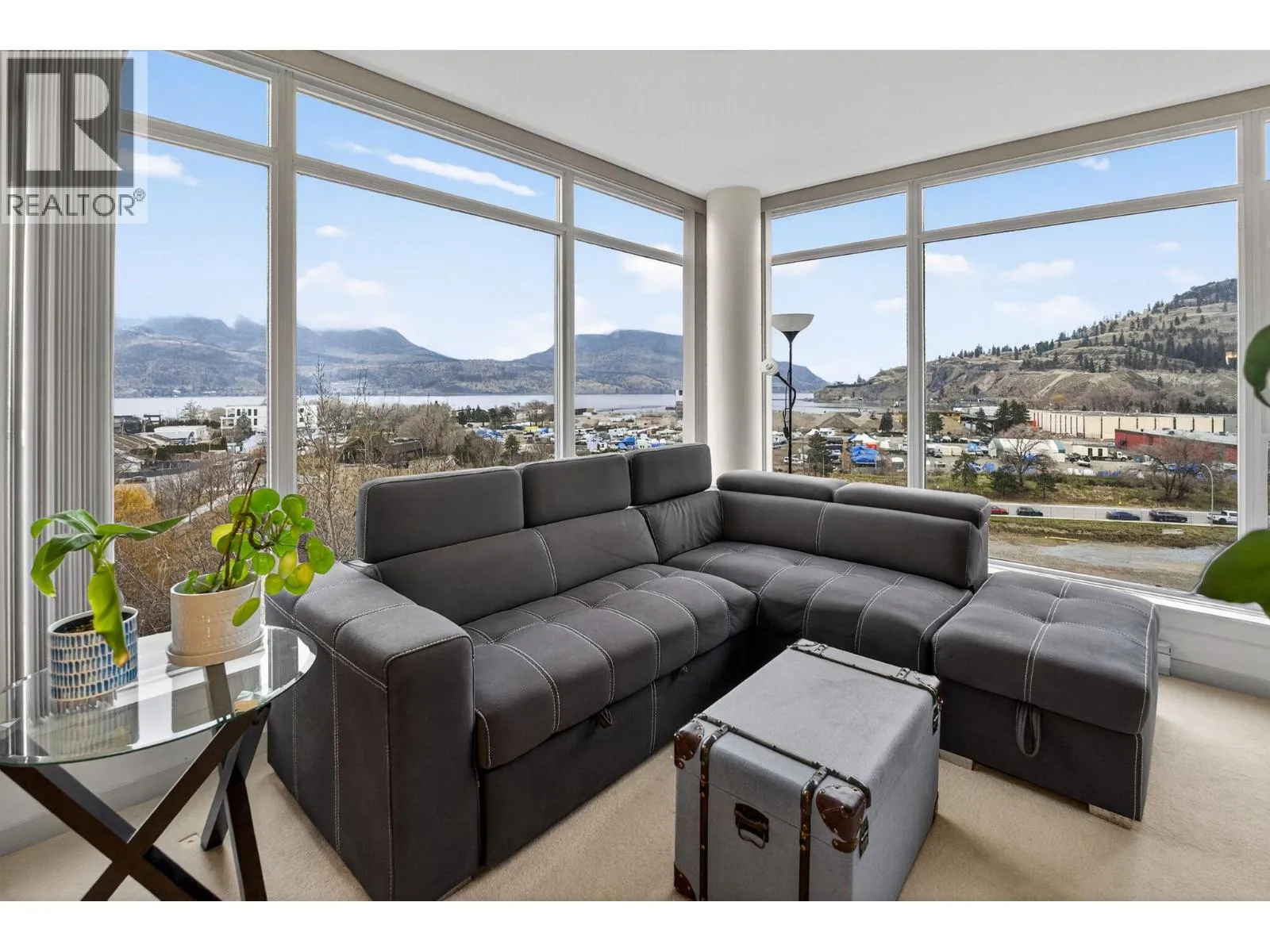 Gorgeous 8th-floor condo in the Skye Tower at Waterscapes. This 2-bedroom plus den, 2-bath home offers a sought-after layout with Okanagan Lake and mountain views. Floor-to-ceiling windows fill the space with natural light, paired with a modern kitchen featuring granite countertops, stainless steel appliances, a gas stovetop range, and peninsula seating. The living room includes a built-in electric fireplace and