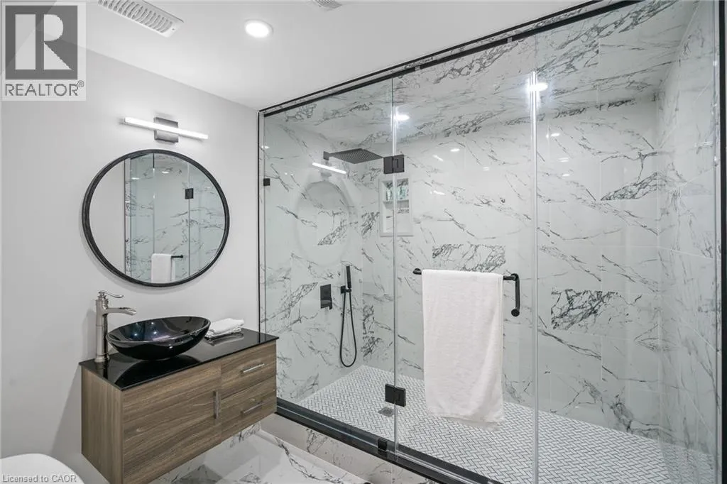 As you drive up to the home you will notice the new deck, custom entryway, stamped concrete, elegant marble and granite walkways, complemented by a lush lawn and modern updates. Upon entering, take a moment to appreciate the designer touches throughout, such as engineered hardwood floors, custom feature walls, bespoke doors, pot lights, cove lighting, and so much more. The kitchen features Samsung S/S appliances and quartz countertops. 3 bedrooms, each with custom feature walls and built-in closets, and a modern 3-pc bath completes the main floor. As you enter through the separate entrance, the glass railed sensor-lit staircase descends to the modern finished lower level. The open concept living space includes a contemporary kitchen with waterfall island, S/S appliances and bright living room. The lower level is complete with 2 bedrooms, each with its own ensuites, along with a convenient laundry room. The backyard is huge, perfectly designed for relaxation and entertainment, featuring a pergola with swings, cozy firepit, and an outdoor kitchen. A short walk to Virgil town centre with shopping, coffee shops & restaurants. Only a 5 min drive to Old Town Niagara-on-the-Lake where you can experience world class theatre, restaurants, wineries & shopping. (id:62650)