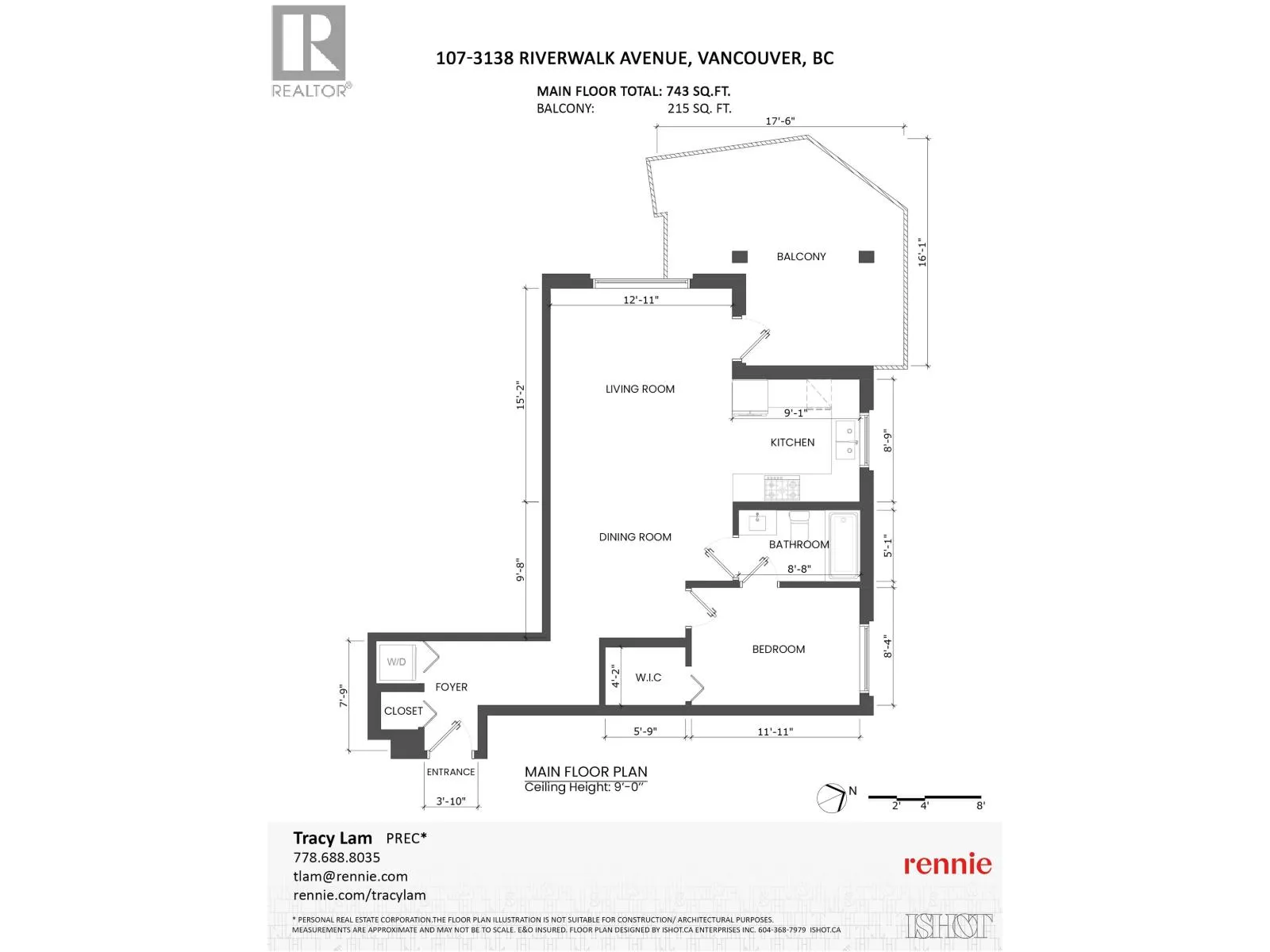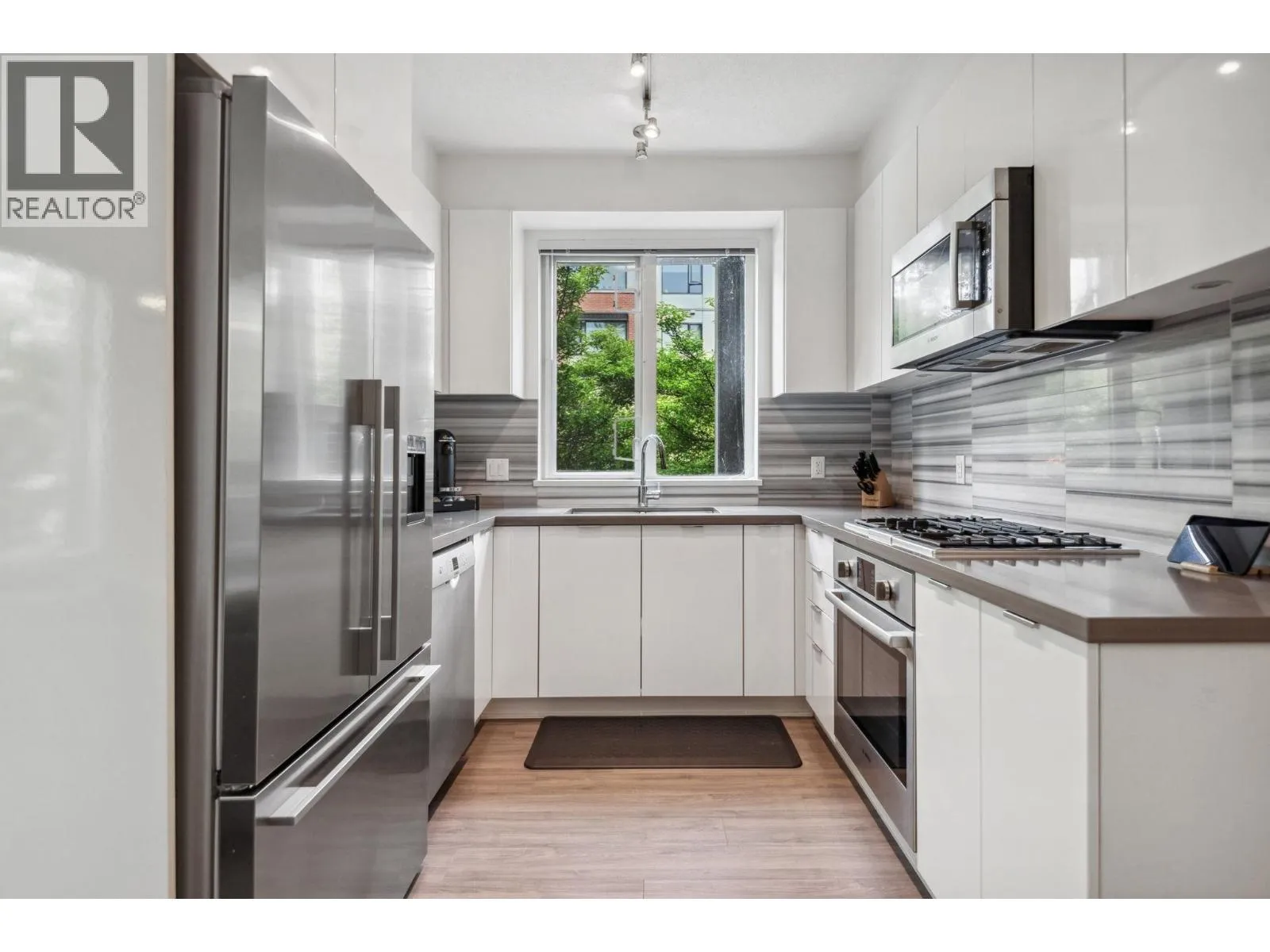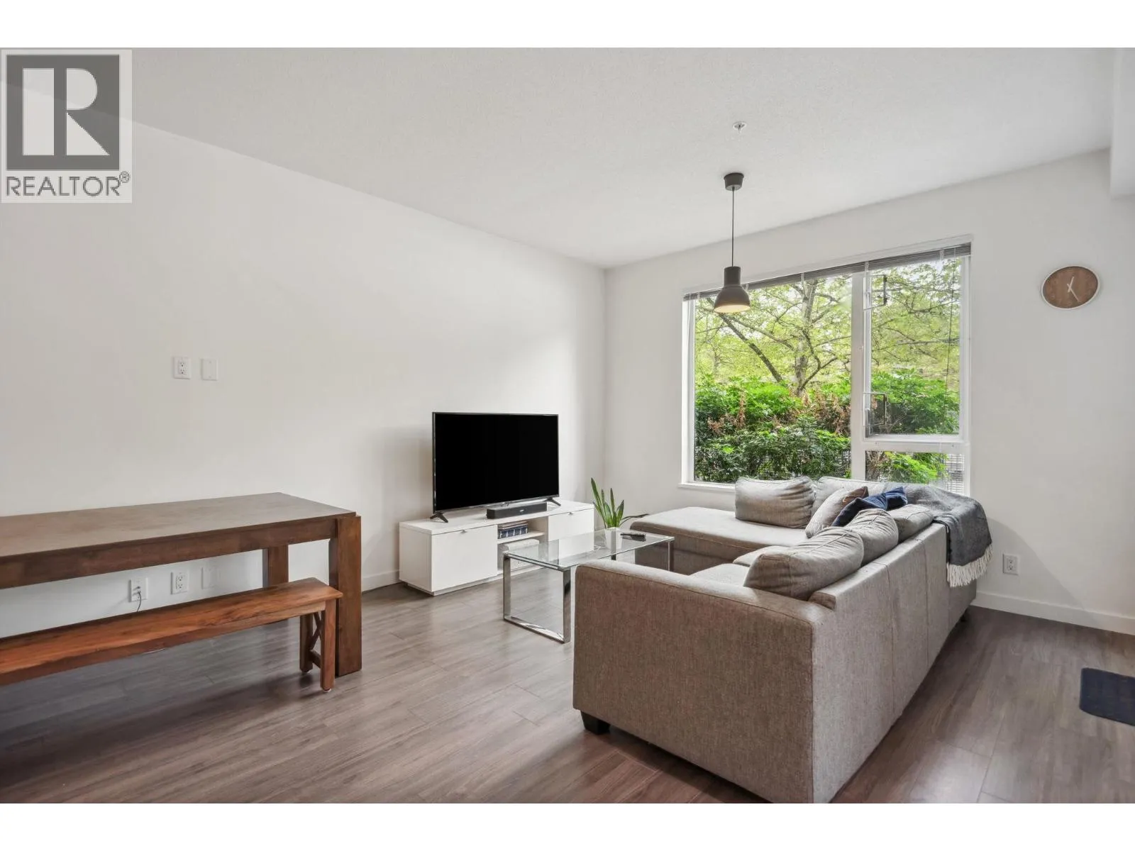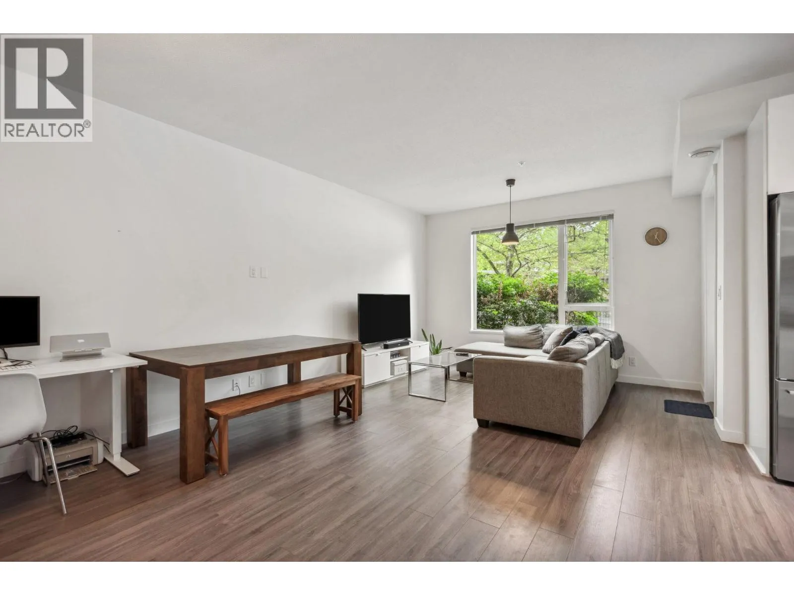 Welcome to River District living! This bright and spacious 1 bed, 1 bath corner home offers 743 square ft of modern comfort. Featuring 9ft ceilings, in-floor radiant heating, durable laminate flooring, and premium Fisher & Paykel & Bosch appliances, this home blends style and function. Enjoy a large covered walk-out patio with semi water views of the Fraser River-perfect for