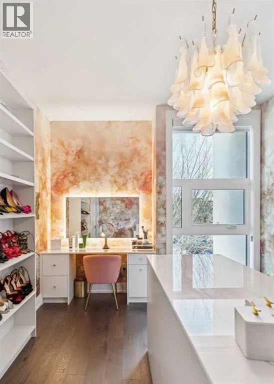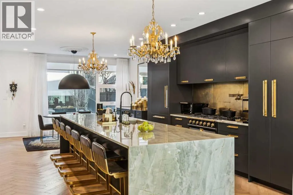 with bespoke architecture by Marvin DeJong and an incredible array of upgrades. Brick, metal, and stucco create a striking curb appeal punctuated with a custom 2.5” solid oak and glass front door. Over 3,096 sq ft of developed living space including 4 bedrooms and 3.5 bathrooms. The totally open-concept main floor features high ceilings, exceptional natural light from the oversized front and rear windows and custom herringbone hardwood floors. The living room is anchored by a custom-panelled fireplace with “frame” television and soft floor-to-ceiling sheers. Truly incredible chef’s kitchen with extensive custom cabinetry, quartzite counters and a massive “waterfall” island with seating. Top appliances include: a La Cornue gas stove, Subzero fridge plus 2 fridge drawers, 2 Subzero freezer drawers, 2 Subzero wine fridges, 2 dishwashers and a custom fabricated quartzite sink. The generous dining area with designer lighting and built-in storage overlooks the rear yard . A heated-floor mudroom with excellent storage and a discreet, elegant powder room complete the main level. Striking staircase with glass wall and solid wood treads leads to the upper floors…no carpet in the home. The primary suite features blackout drapery, wall-mounted TV and a well-organized walk-in closet. The spa-inspired ensuite showcases heated and custom marble flooring, designer lighting, Kateryn cast iron soaking tub, zero-threshold shower with steam, water closet with Japanese bidet toilet and a large double vanity with honed marble counter and Restoration Hardware fixtures. The bal ance of the second level includes two bright bedrooms (one currently used as a dressing room), a spacious family bath and a walk-in laundry room with sink and storage. The top-floor holds a large studio space with amazing light quality. Also an office area with access out to a large and private terrace. The fully finished lower level offers heated hardwood floors, a media space, games room, work station, bedroom and a full bath. Outdoor living is equally impressive, with a front terrace and rose garden and a sunny west-facing and low-maintenance back yard with multiple patios. Additional highlights include a smart home system that will control Lutron lighting, temperature and security. Also irrigation and Gemstone exterior lighting. The fully finished and heated double garage has 2 EV chargers and a paved alley. This exceptional property must be seen to be appreciated. (id:62650)