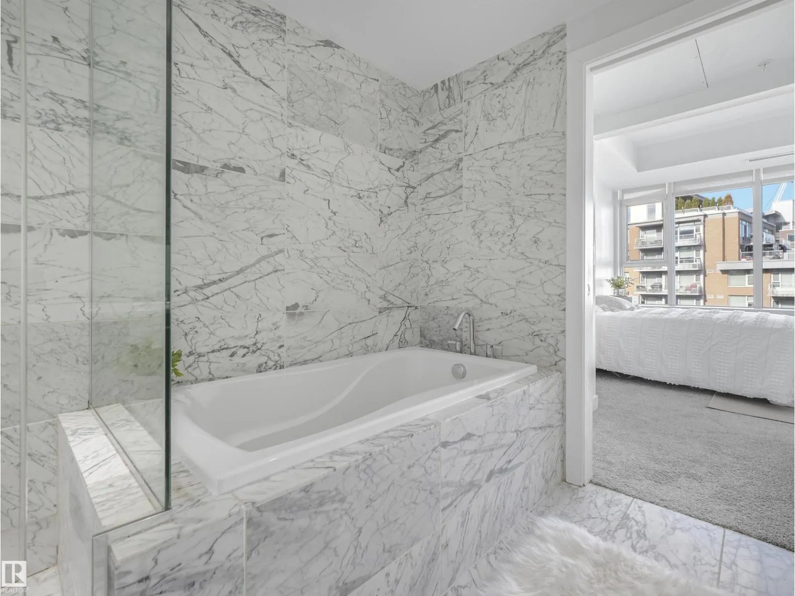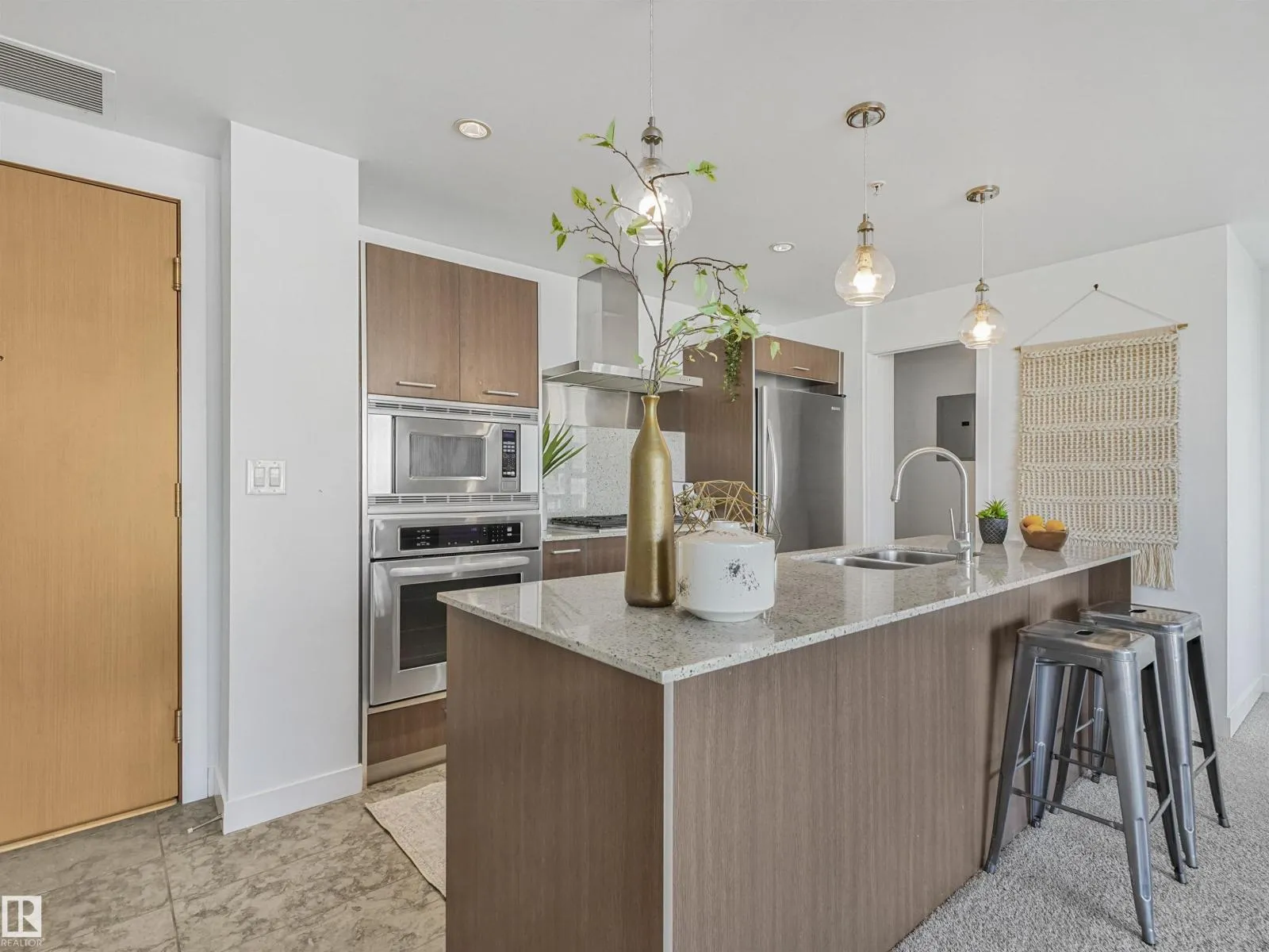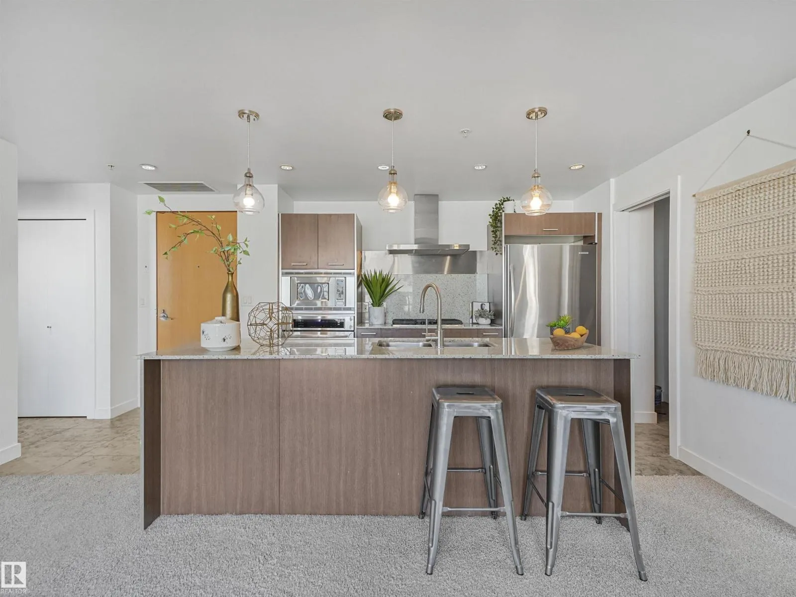 Welcome to this stylish 2 bed, 2 bath condo in the heart of Century Park! This bright, open-concept unit features wall-to-wall windows, a fireplace, and a private balcony with a gas BBQ hookup overlooking the serene courtyard. The gourmet kitchen is a chef’s dream with granite countertops, built-in microwave, oven, gas stovetop, and a large island. The luxurious primary suite