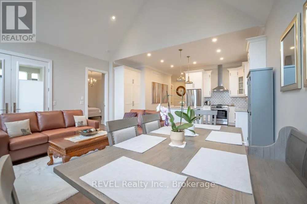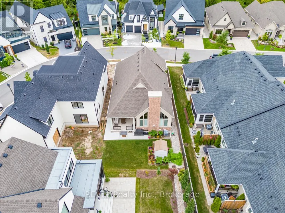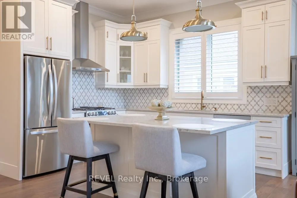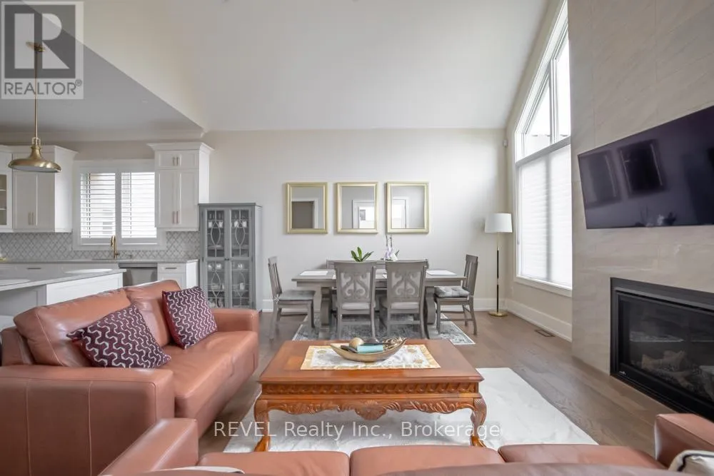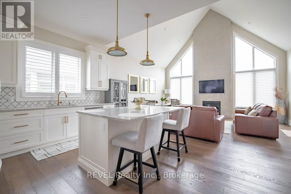Set on a quiet, refined streetscape in the heart of St. Davids, 75 Millpond Road is a custom-built bungalow by DRT Homes offering over 2,700 sq. ft. of finished living space. The grand foyer with wainscoting opens to a soaring great room with 20-ft ceilings and a dramatic tiled fireplace. The main floor features a spacious primary suite with a