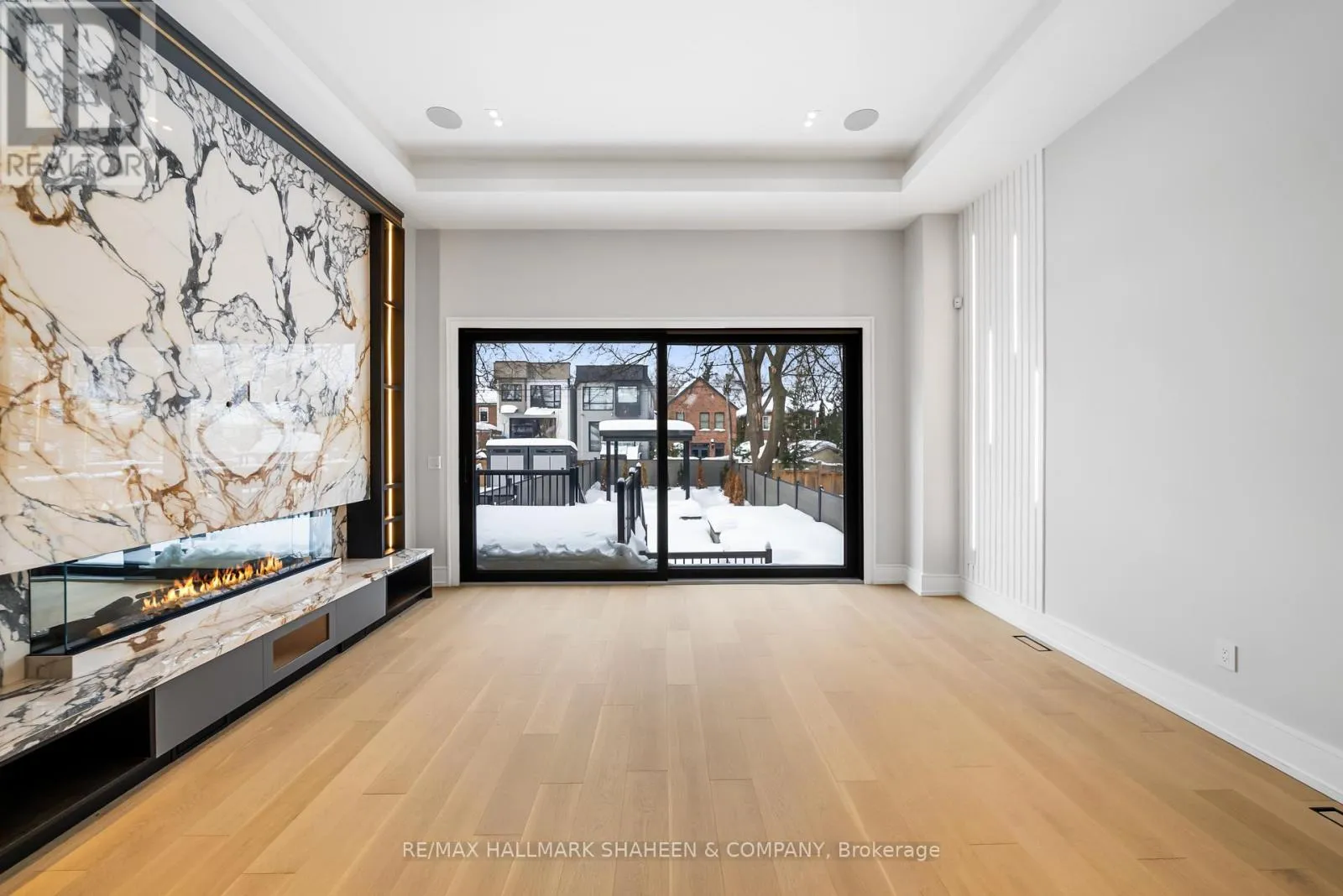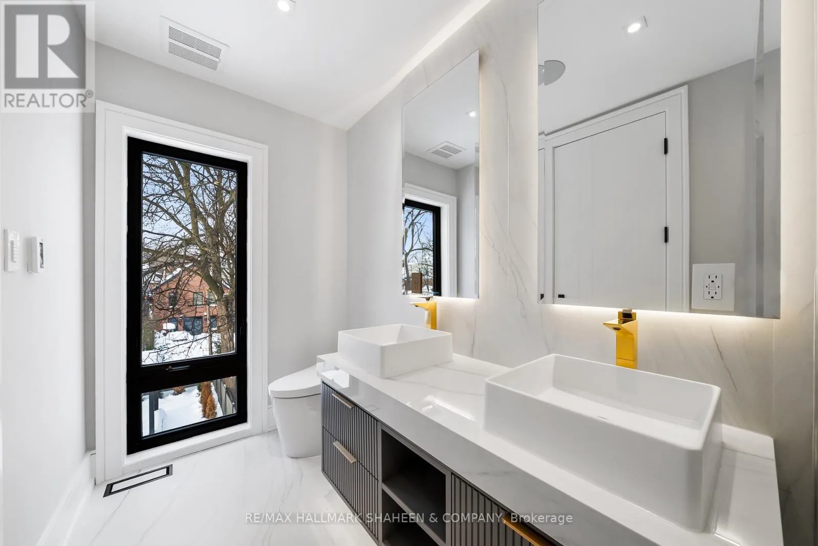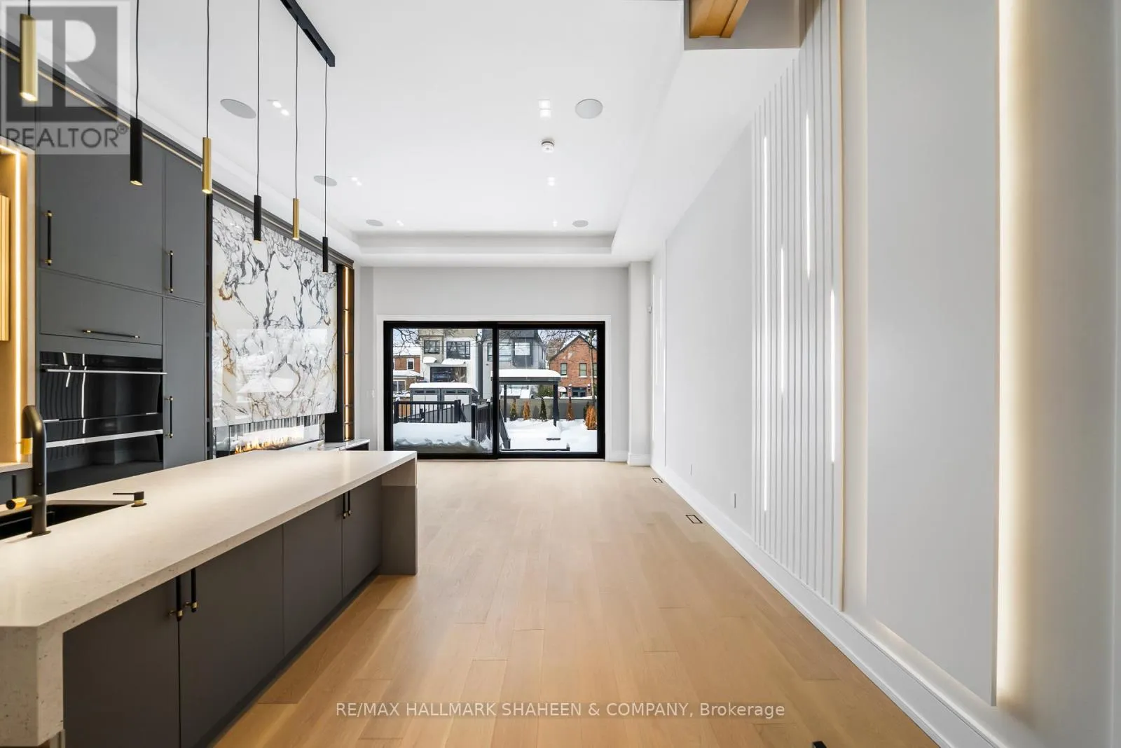 The experience begins on arrival with a heated driveway, followed by 12+ foot ceilings, skylights, and a raised, light-filled living space that set the tone for scale and warmth. The chef’s kitchen is anchored by a large island wrapped in a fluted finish, a design motif echoed throughout the home in Vogt faucets, solid brass hardware, and refined architectural accents.