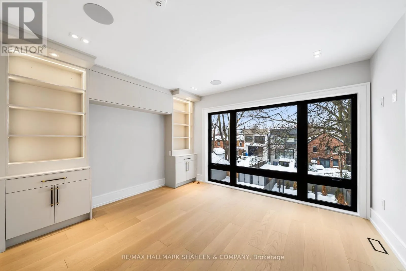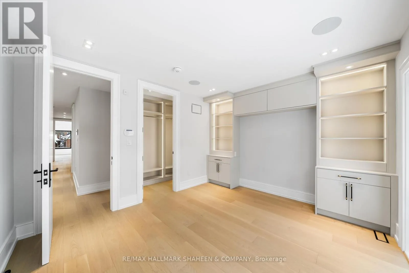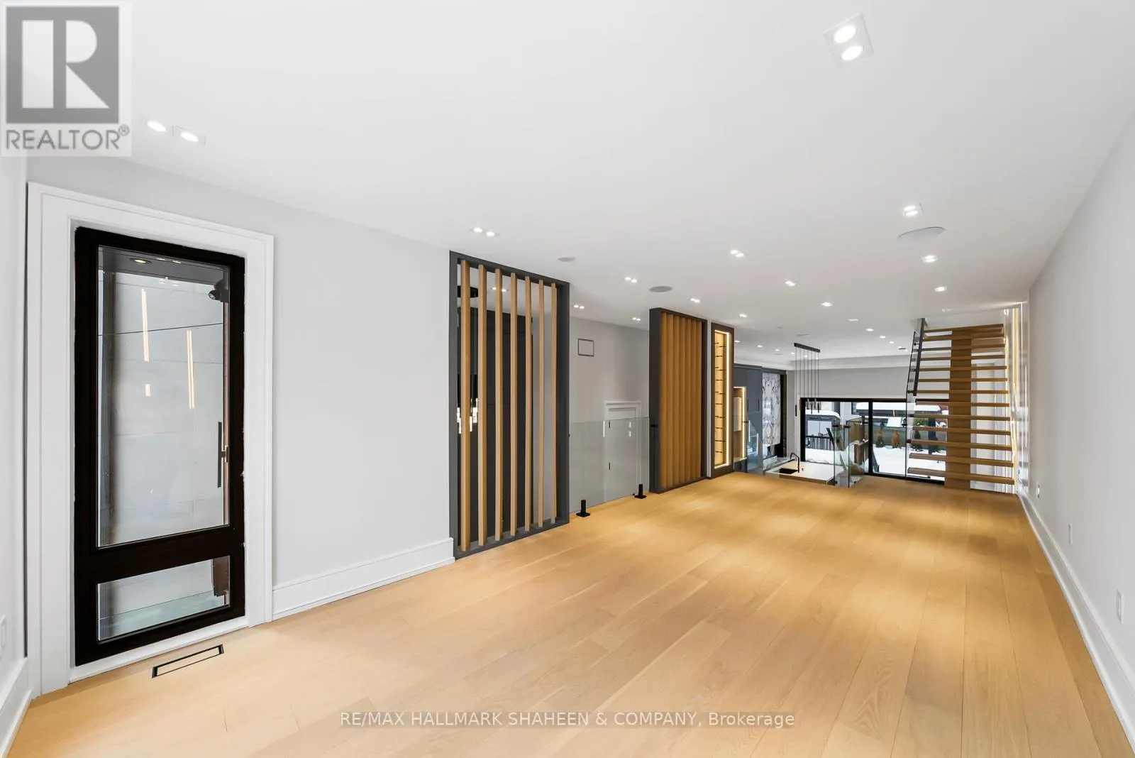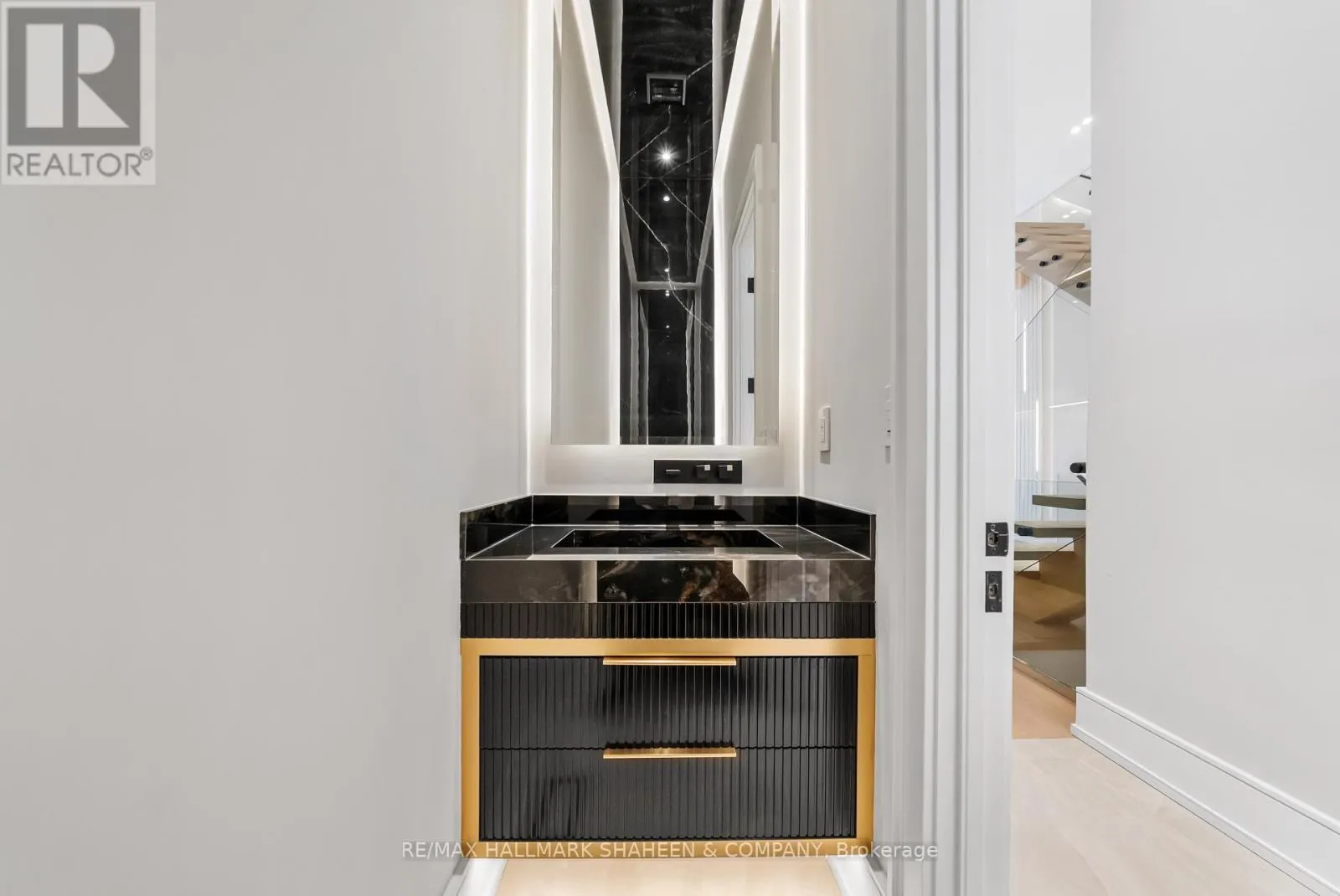 The experience begins on arrival with a heated driveway, followed by 12+ foot ceilings, skylights, and a raised, light-filled living space that set the tone for scale and warmth. The chef’s kitchen is anchored by a large island wrapped in a fluted finish, a design motif echoed throughout the home in Vogt faucets, solid brass hardware, and refined architectural accents.