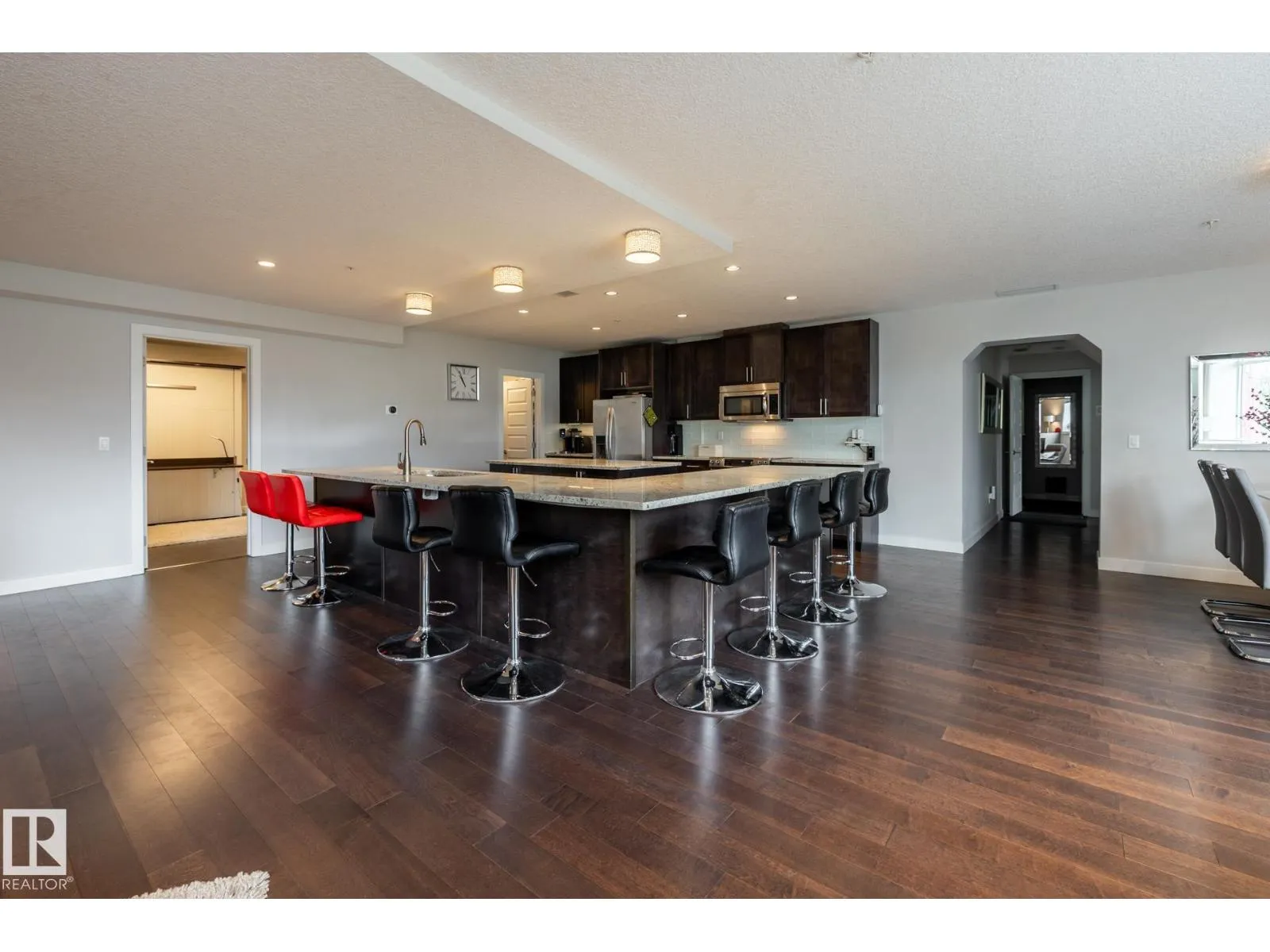 Large Executive 2-storey Townhouse style condo. It has it’s own underground Attached Double Garage (heated). Park your vehicle and walk into your Executive Condo. Three Bedrooms (2 with ensuite bathrooms), 3 full Bathrooms, an office/den on upper level. Laundry room in suite in the upper area. A huge Kitchen will appeal to those who like to entertain. The L-shaped counter