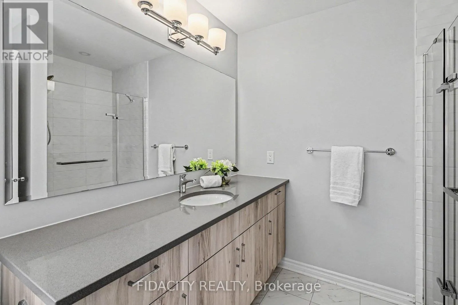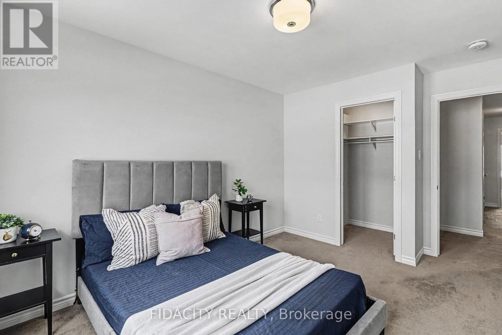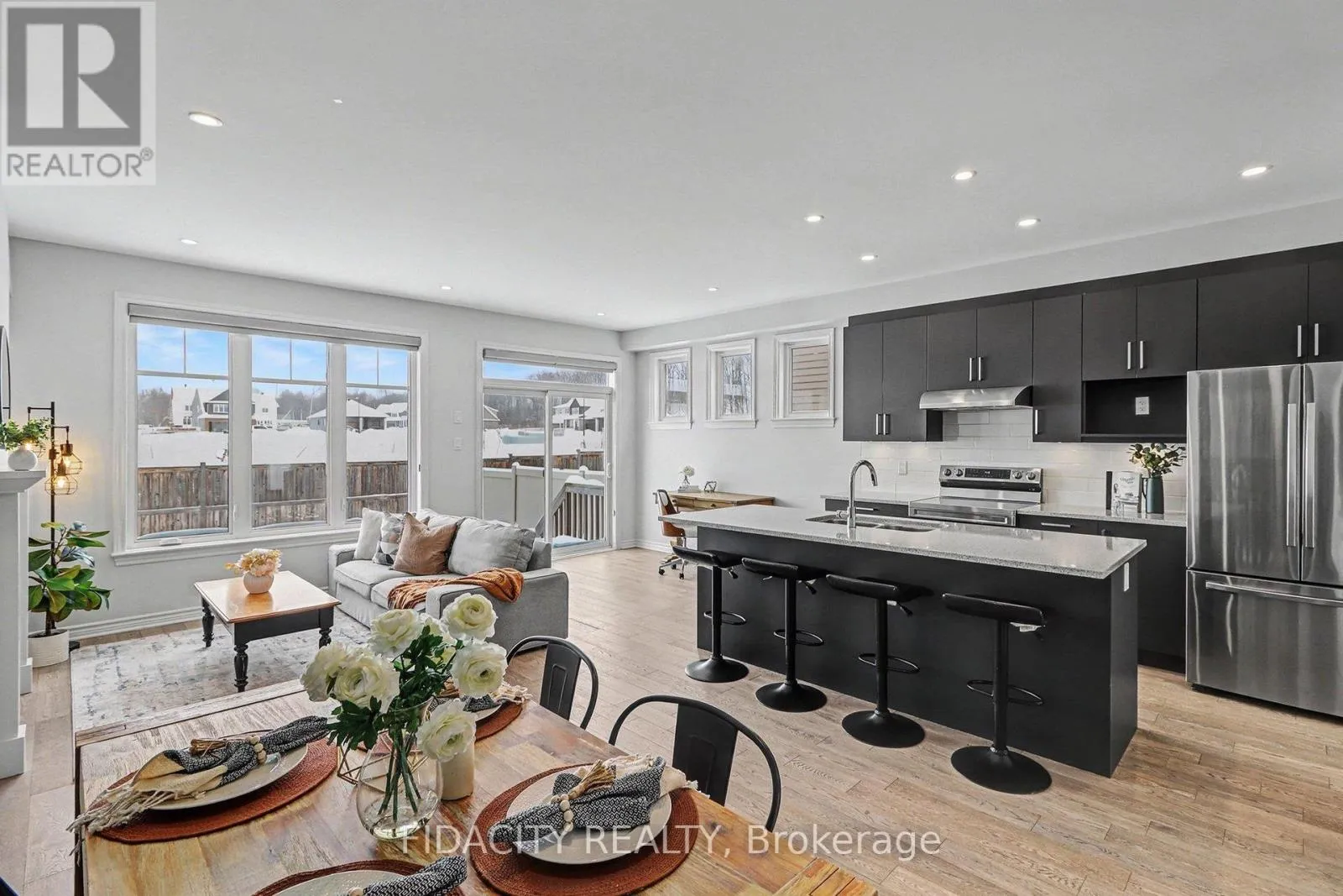 This end-unit freehold townhome (Hudson model) offers a bright, open layout with modern flooring throughout the main level and extra windows that fill the home with natural light. The open-concept main floor is anchored by a modern kitchen featuring quartz countertops, island with seating, stainless steel appliances, ample cabinetry, and a pantry, flowing seamlessly into the living and dining areas.