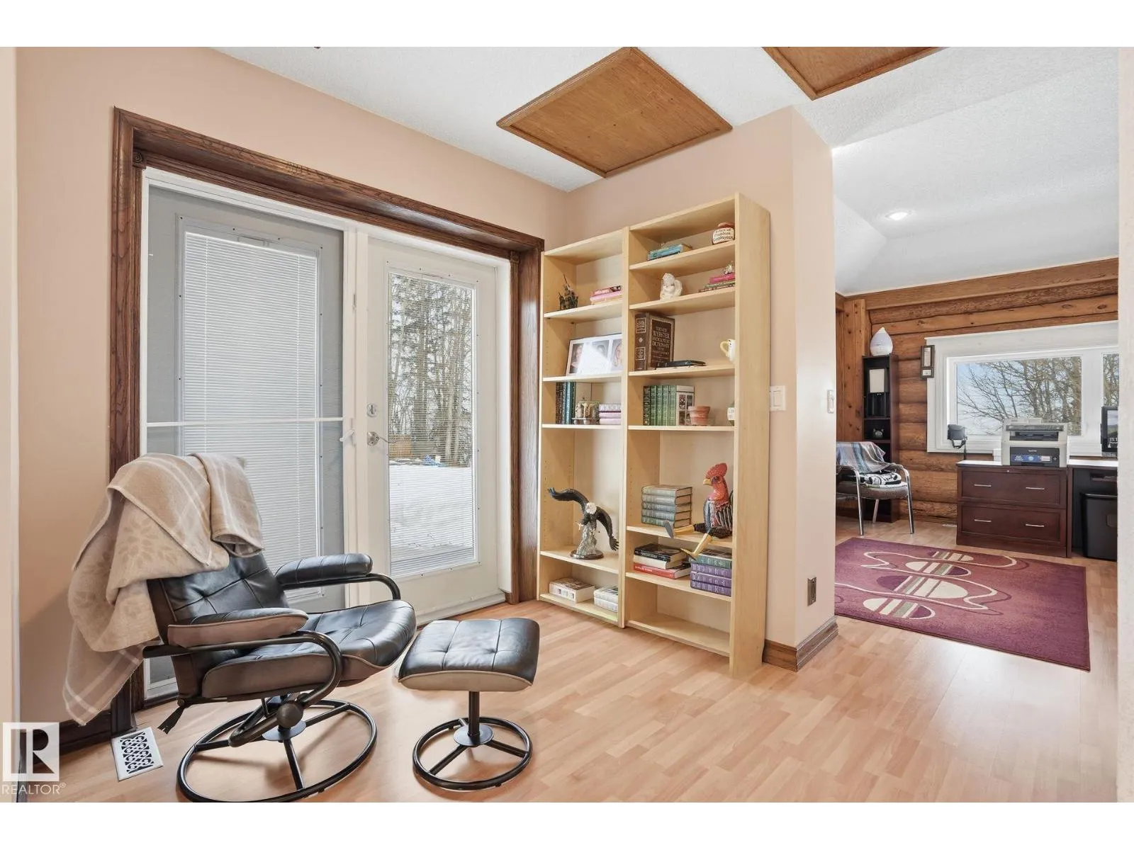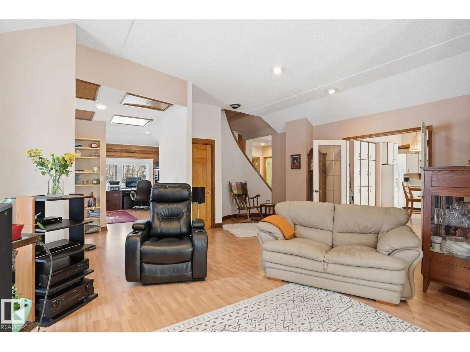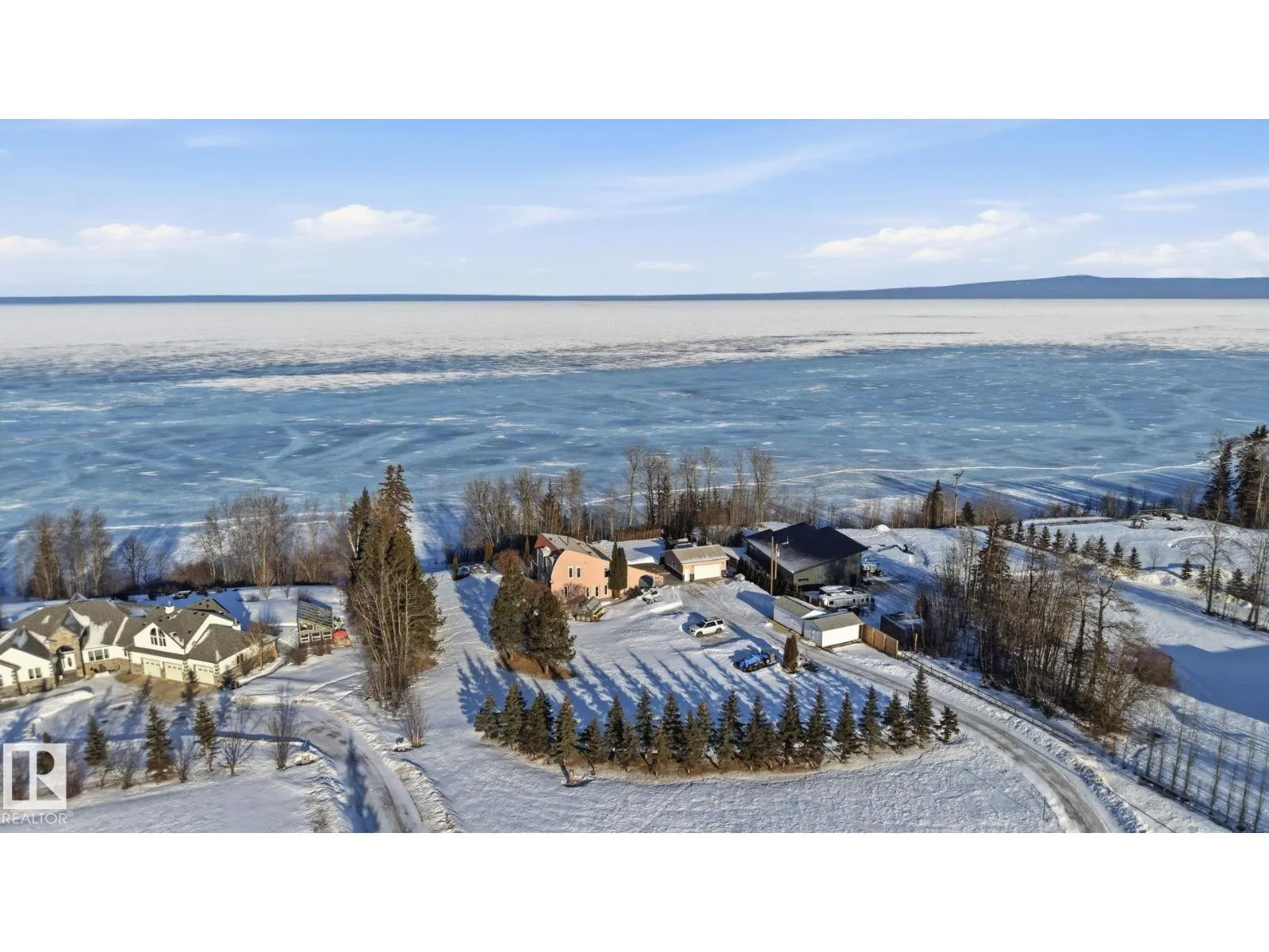 This meticulous, custom-built LAKEFRONT home has 4 BEDS, 2 FULL BATHS and sits on 3.5 ACRES! Architechural style throughout: a swooping facade entrance, metal roof, log construction, stamped concrete patio, vaulted ceiling, tons of windows and a spiral staircase! The main floor is open concept with kitchen and breakfast nook opening directly to dining and living rooms. The kitchen has