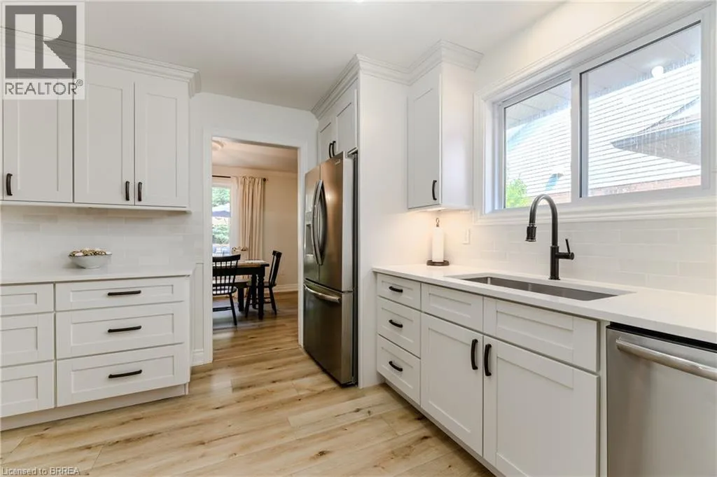 Catch the breeze—lake town living awaits at 5 Newport Lane in Port Dover. Located in the desirable Woodlands neighbourhood, this fully renovated all-brick bungalow blends modern comfort with functional multi-family living. Thoughtful updates throughout make this home move-in ready and designed for family flexibility. The main level features three generous bedrooms, including a primary suite with its own ensuite bathroom,