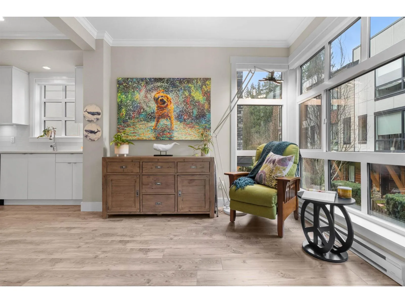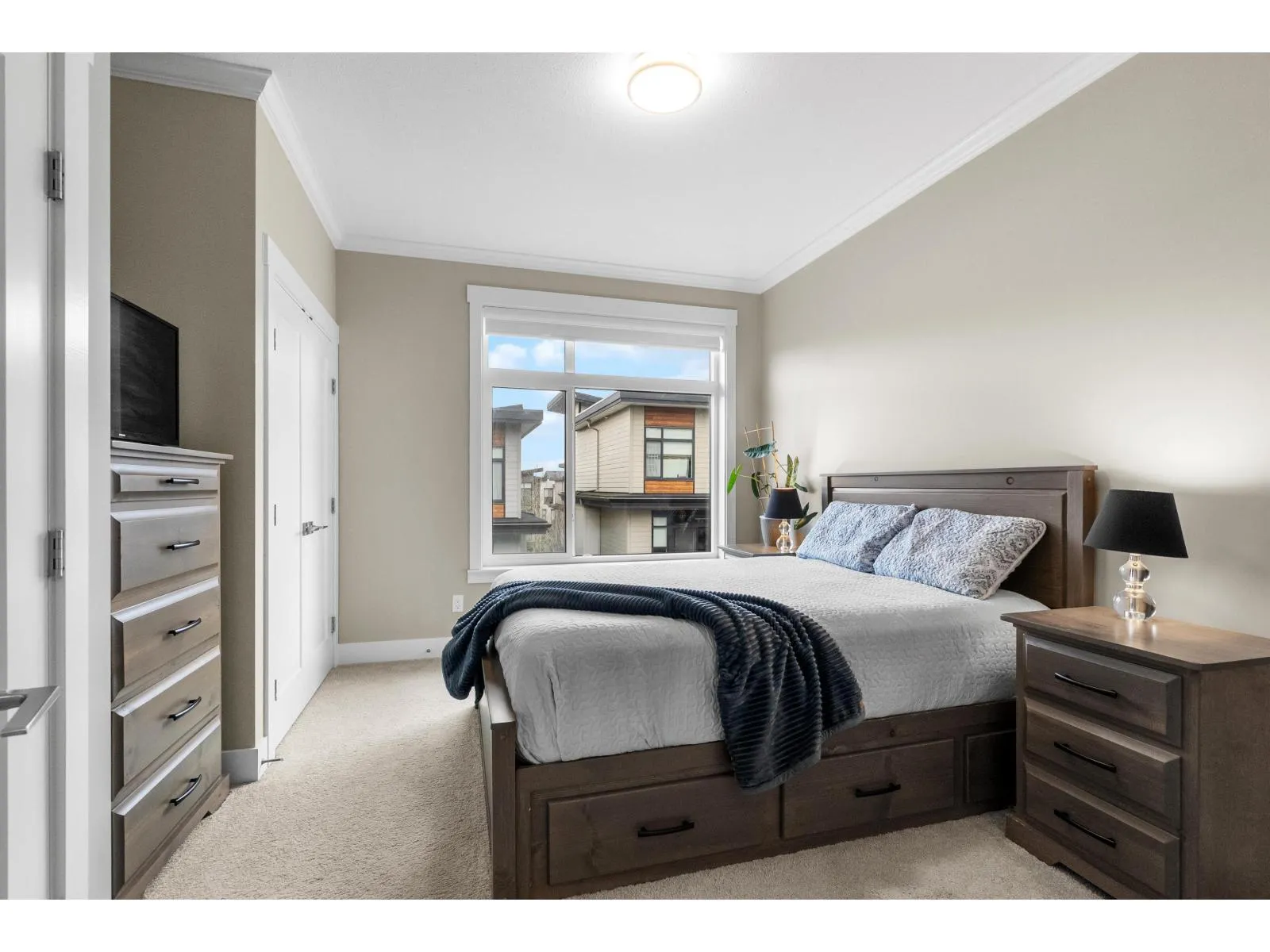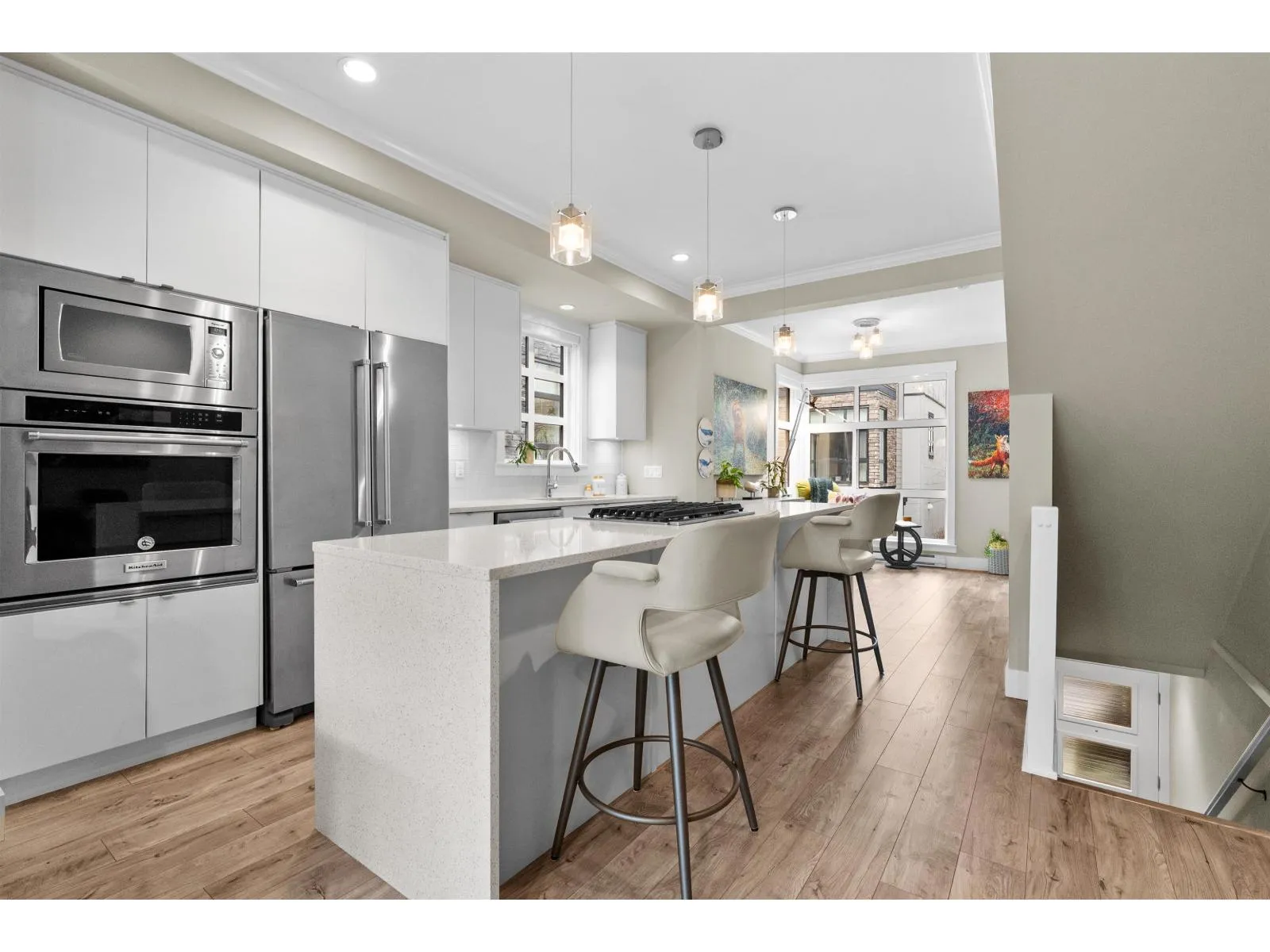 Beautifully maintained end unit at Harvest at Bose Ridge Farm in West Cloverdale! The open concept living space features a gourmet kitchen with quartz countertops, modern cabinetry, stainless steel appliances, gas cooktop, and a striking waterfall island, perfect for everyday living and entertaining. 9 foot ceilings and floor to ceiling windows create a bright, airy feel throughout. A