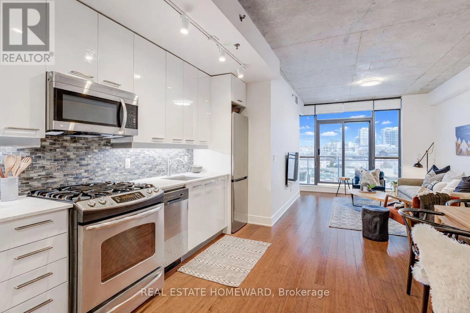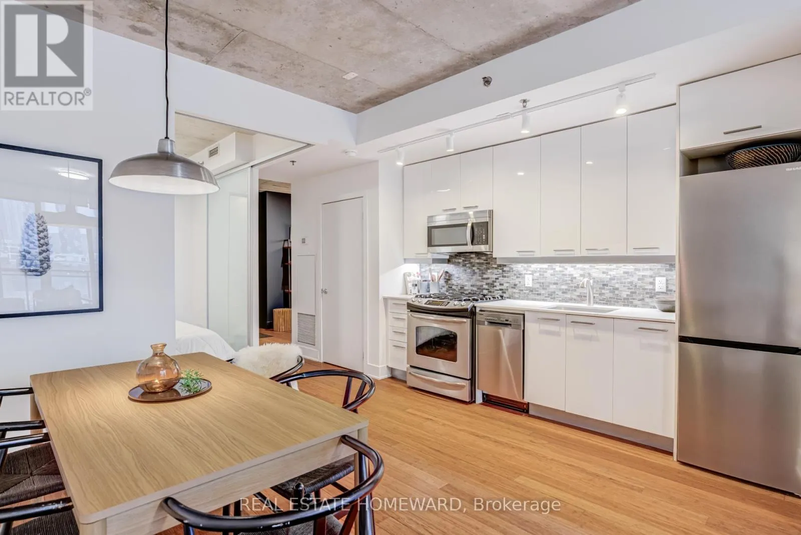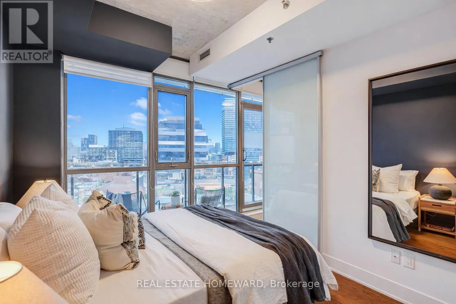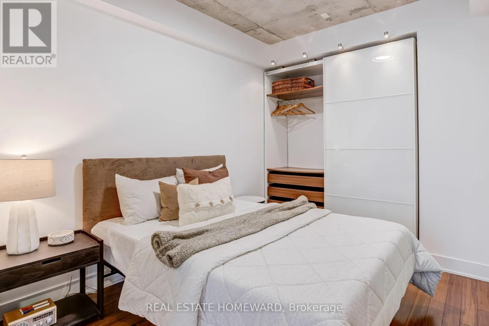 TRINITY LOFTS IN CORKTOWN / Rarely available, sun-filled suite with a highly functional open-concept layout in one of Corktown’s most sought-after boutique loft buildings. Features include outfitted wardrobe closets (included), engineered hardwood floors, and 9-ft exposed concrete ceilings for a true loft feel. Spacious bedrooms with sliding glass doors and wall-to-wall west facing windows with roller blinds throughout. The stylish