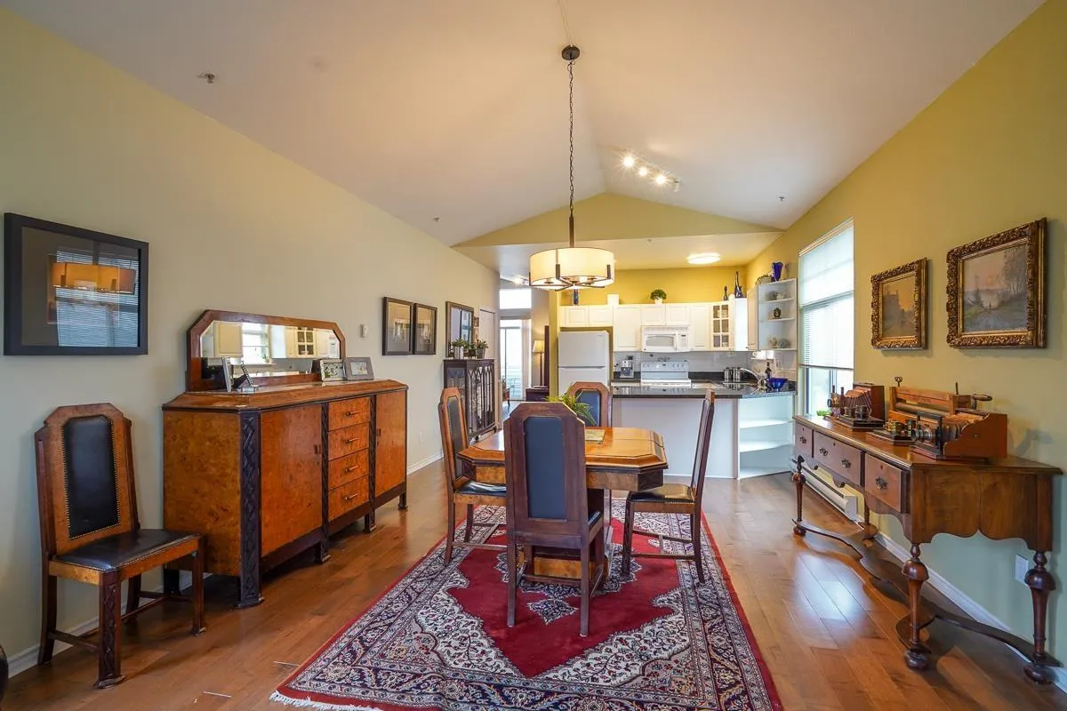 Gorgeous & bright! This airy upper-level unit features 2-beds, 2-baths, vaulted ceilings & big windows. The summer breeze is wonderful with no A/C needed. Beautiful engineered hardwood in all the living areas was expertly levelled when installed. Classic white kitchen with a large, south-facing window right over the sink. Wrap-around bar with updated granite countertops & tile flooring. Spacious bedrooms