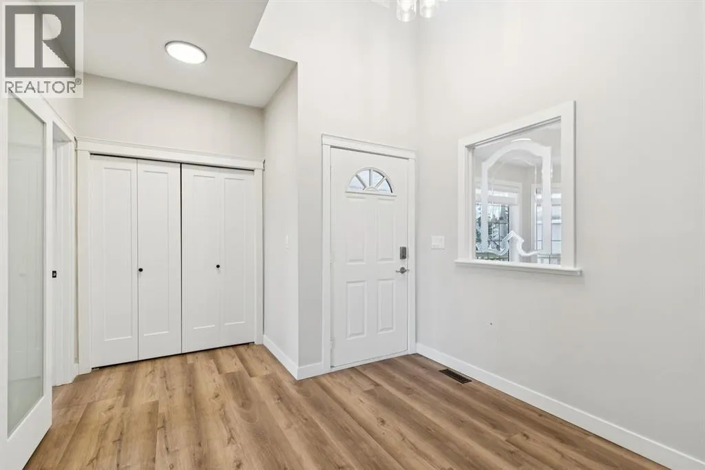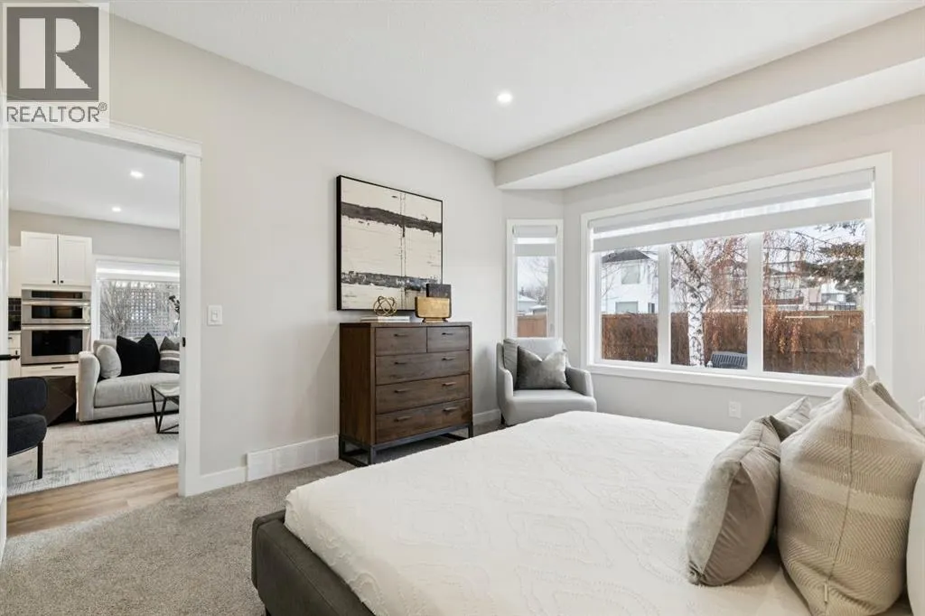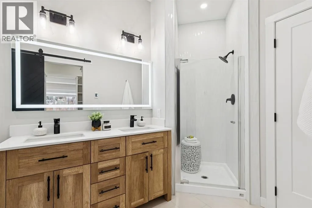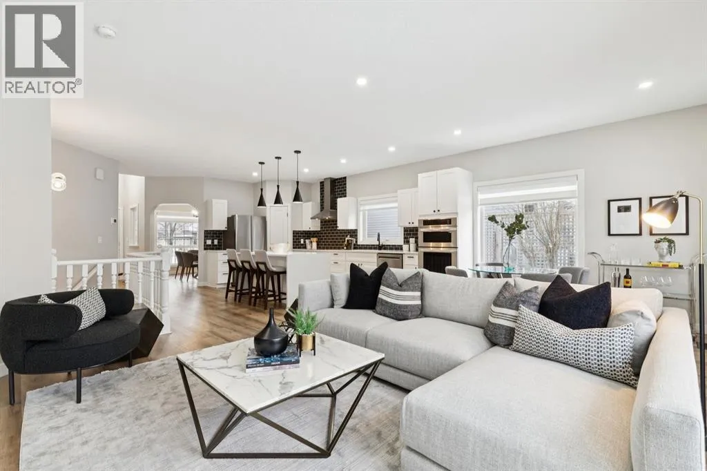 flooring that flows throughout the open-concept main floor. The kitchen is a true showpiece, featuring an abundance of cabinetry, a corner pantry, and a striking quartz waterfall island that offers generous seating. A suite of premium stainless steel appliances, including a built-in oven and a versatile convection oven/microwave, is complemented by stylish black subway tile and designer lighting, creating a sophisticated and functional space for both everyday living and entertaining. The main floor also hosts a large, bright formal dining room with charming bay windows overlooking the front porch, and a large private office/den that captures tranquil views of the adjacent green space. The owner’s retreat overlooks the backyard, complete with a walk-through closet leading to a luxurious en-suite bathroom. This spa-like space features a large soaker tub with a custom tile surround, a dual vanity, a separate shower, and the added comfort of heated flooring and a heated/LED vanity mirror. The main level is thoughtfully completed with a half bathroom, a laundry room with garage access, and ample closet space. Descend to the fully finished basement to find a vast living and recreation area, centered around a cozy gas fireplace. This level also includes three large (sound proofed) bedrooms with generous closet space and a full bathroom, providing ample room for family and guests. The home’s infrastructure has been meticulously updated, including new attic insulation, a new electrical panel, AC, a HE furnace, and a newer water tank, along with a precautionary radon fan reduction system for ultimate peace of mind. Step outside into the professionally landscaped, west-facing backyard, completed in the summer of 2025. A private gate provides direct access to a large green space, offering an idyllic setting for a walk while soaking in breathtaking views of the Rocky Mountains. This exceptional property offers a lifestyle of convenience and leisure, with four seasons of activities at the lake and easy access to Stoney Trail and the premier amenities at The Gates of Walden. This is more than a home, it’s an opportunity for a life of quiet luxury and natural beauty. (id:64429)