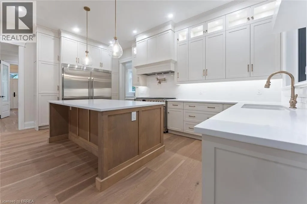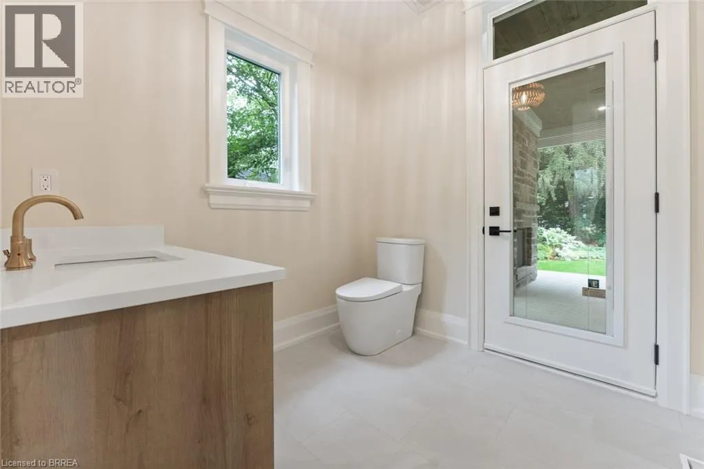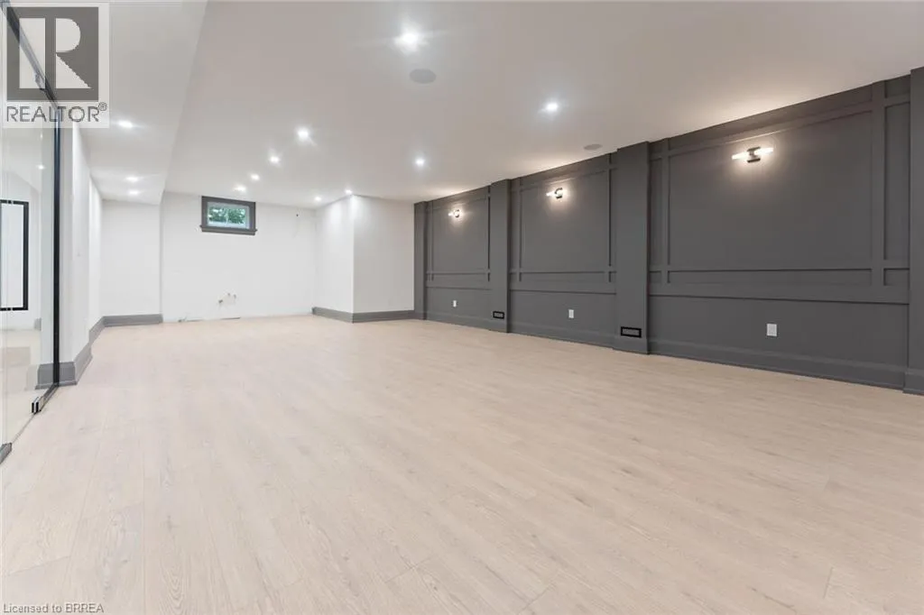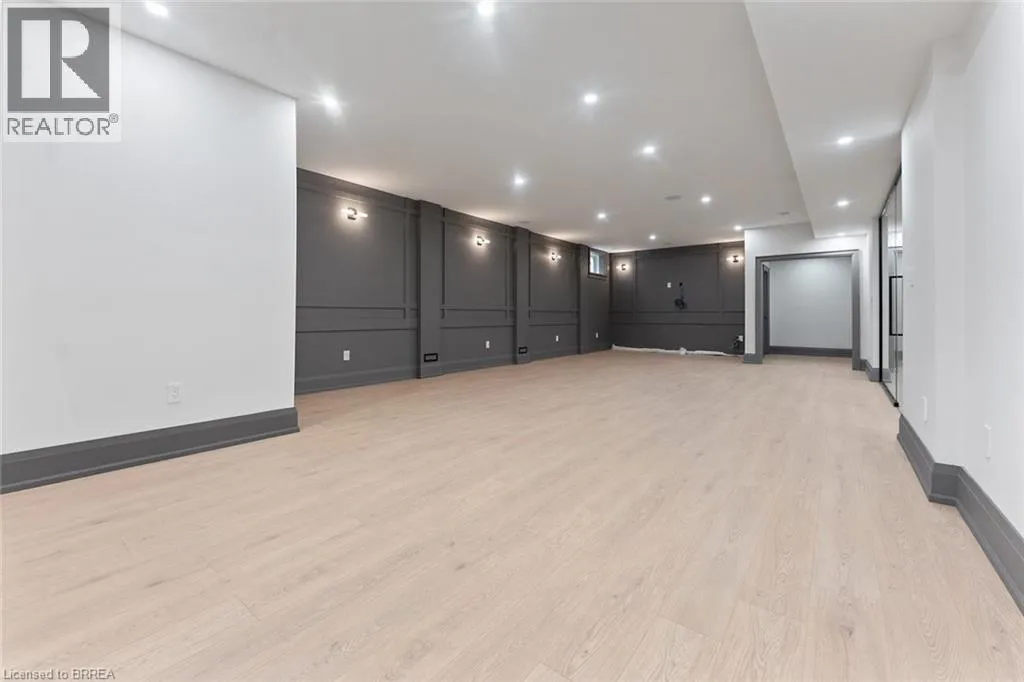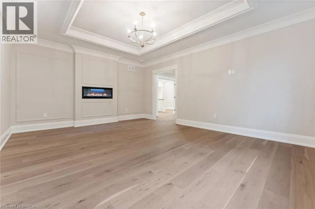 custom millwork, crown moulding, and wide-plank blonde oak flooring. The chef’s kitchen is the heart of the home, featuring custom cabinetry, high-end stainless steel appliances, and a full servery connecting to a walk-in pantry, glass-enclosed wine room, and formal dining room – ideal for entertaining. The inviting family room impresses with a coffered ceiling, gas fireplace, and views of the private backyard and covered patio. The main floor also includes a den/office/library, mudroom with secondary entrance, and two elegant bathrooms. Expansive windows flood the home with natural light. Upstairs are four spacious bedrooms, each with private ensuite and walk-in closet. The primary suite is a true retreat, complete with a fireplace, sitting area, custom walk-in closet, and luxurious 4-piece ensuite with double sinks and a freestanding soaker tub. A convenient laundry room serves the upper level. The finished lower level offers over 2,000 sq. ft. with 9-foot ceilings, a large recreation area, home gym, 4-piece bathroom, ample storage, and walk-up access to the oversized heated double garage with rear yard access. Step outside to a private backyard oasis with mature trees, covered patio, outdoor kitchen space, and stone fireplace – perfect for year-round enjoyment. This remarkable home delivers unmatched quality, luxury, and location in one of Ancaster’s most desirable settings. (id:62650)