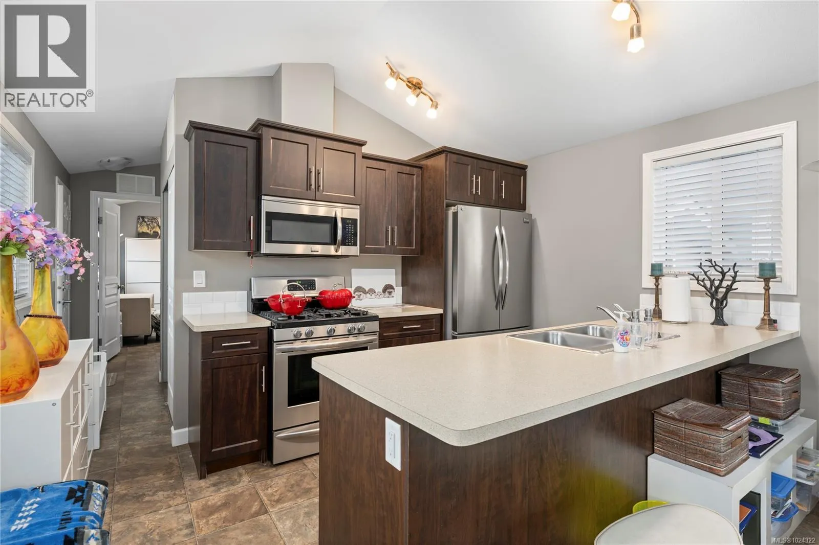 Best spot in Chemainus Gardens! This one bedroom, one bathroom park model manufactured home has everything you need in a wonderful location with a peaceful view. Great layout with an open kitchen, natural gas oven/stove, full appliance package including a washer & dryer, eating bar & slider to the deck. The cozy living area & open kitchen is on end