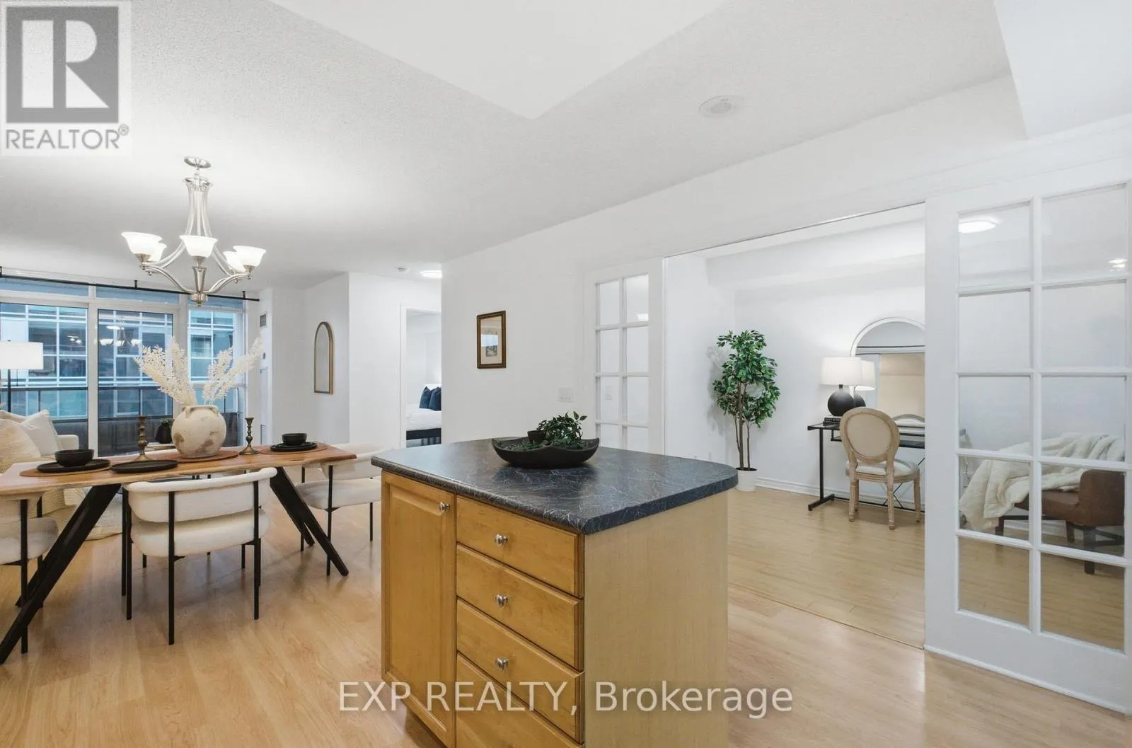 This bright and well-designed suite offers a functional open-concept layout with floor-to-ceiling windows, allowing for abundant natural light throughout. The contemporary kitchen features sleek cabinetry, quartz countertops, and integrated stainless steel appliances, seamlessly flowing into the living and dining area. The bedroom is well-sized with ample closet space, and the suite offers quality finishes throughout. Located in a highly sought-after