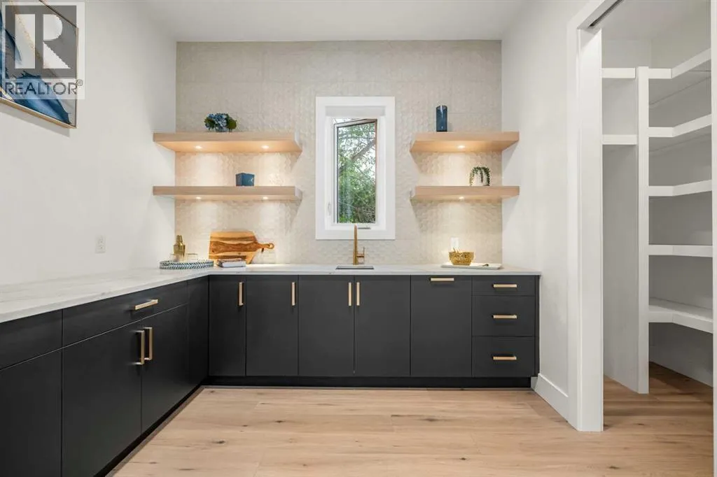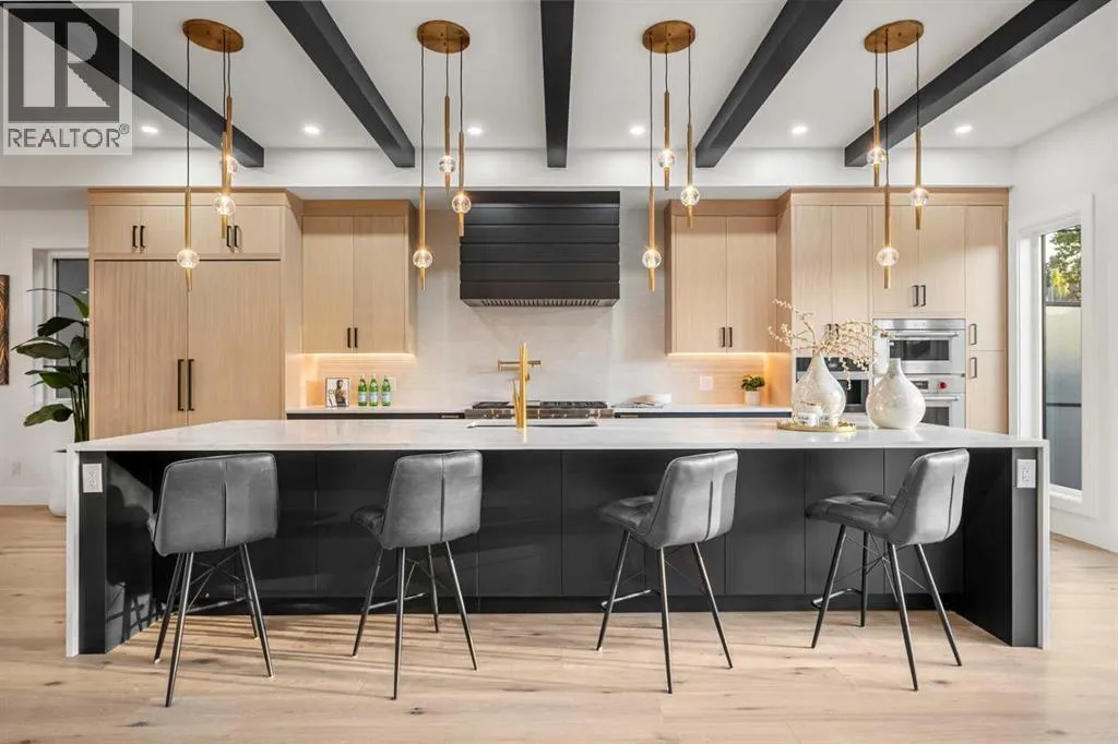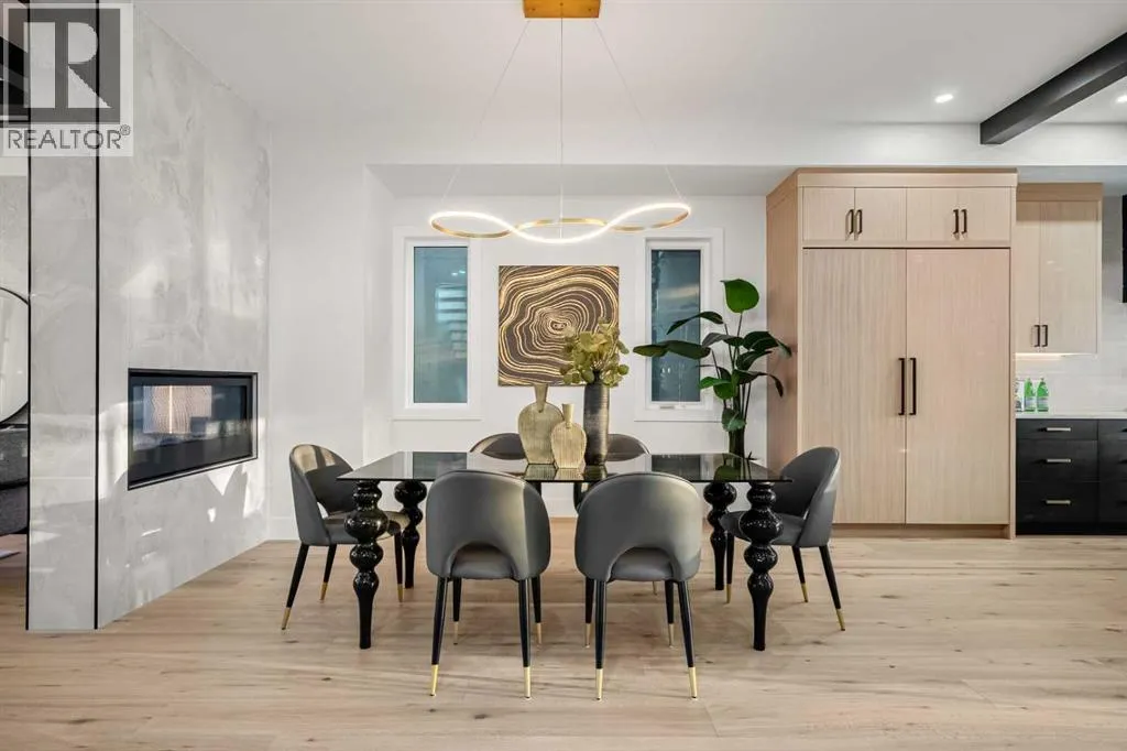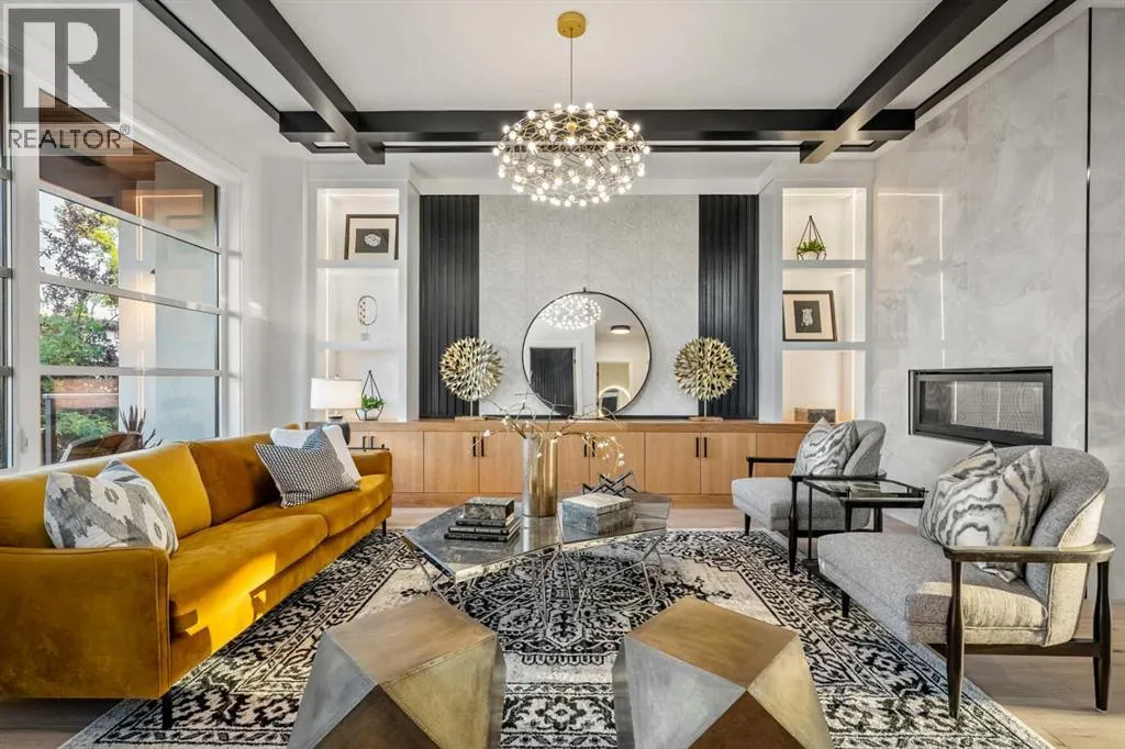 11 acre city park, complete with scenic pathways, tennis/basketball courts, skating/hockey rinks, dog park and an active community association that keeps the energy alive year-round. Step inside and prepare to be wowed by grand design, opulent finishes and thoughtful artistry throughout. From the soaring 10-foot vaulted ceilings to the natural light streaming through abundant walls of windows, every corner of this home exudes elegance and prestige. Picture cozy evenings in the spacious living room, anchored by a stunning double-sided gas fireplace, or hosting lavish dinners in the dining area, complete with a 48″ built-in wine wall cooler for your prized private collection. The chef-inspired kitchen is a culinary dream come true, boasting only the best: a 60″ SUB-ZERO refrigerator/freezer, a 48″ WOLF 6-burner gas cooktop with dual wall ovens, a MIELE coffee system and a BOSCH dishwasher. The walk-in butler’s servery plus pantry ensures seamless entertaining and organization, while patio sliders open to your outdoor deck—a perfect spot to soak up summer sunsets while overlooking your landscaped yard. Need space for work or play? The main floor provides two versatile flex rooms, ideal for an executive home office, craft/hobby space or a children’s playroom—tailored to suit any lifestyle. The floating staircase—framed by an elegant wall of marble tile—takes you upstairs to even more grandeur. The bonus room offers spectacular skyline views, while two additional bedrooms each feature private ensuites and walk-in closets. The pièce de résis tance is the owner’s retreat. The primary suite is a sanctuary of luxury, complete with a designer walk-in closet, a private west-facing balcony overlooking the park (sunsets and nightcaps, anyone?), and an unforgettable spa-like ensuite. This private bathroom features a double-sided gas fireplace, a freestanding black soaker tub, a separate glass steam shower, dual sinks and heated floors—a true oasis of relaxation. The lower level is designed for casual entertaining and comfort, offering a rec/media/games room and wet bar, a fourth bedroom, a den/flex/5th bedroom and a 4 piece bath. Access the attached heated double garage via the mudroom, or store your larger toys in the rear detached heated single garage, spacious enough for a pickup truck. This home is perfectly positioned to enjoy the best of Calgary—steps from the trendiest restaurants, boutique shops and social hubs of 17 Avenue, with only a 5 minute commute to downtown. Don’t miss your chance to make this incredible luxury home yours! (id:64429)