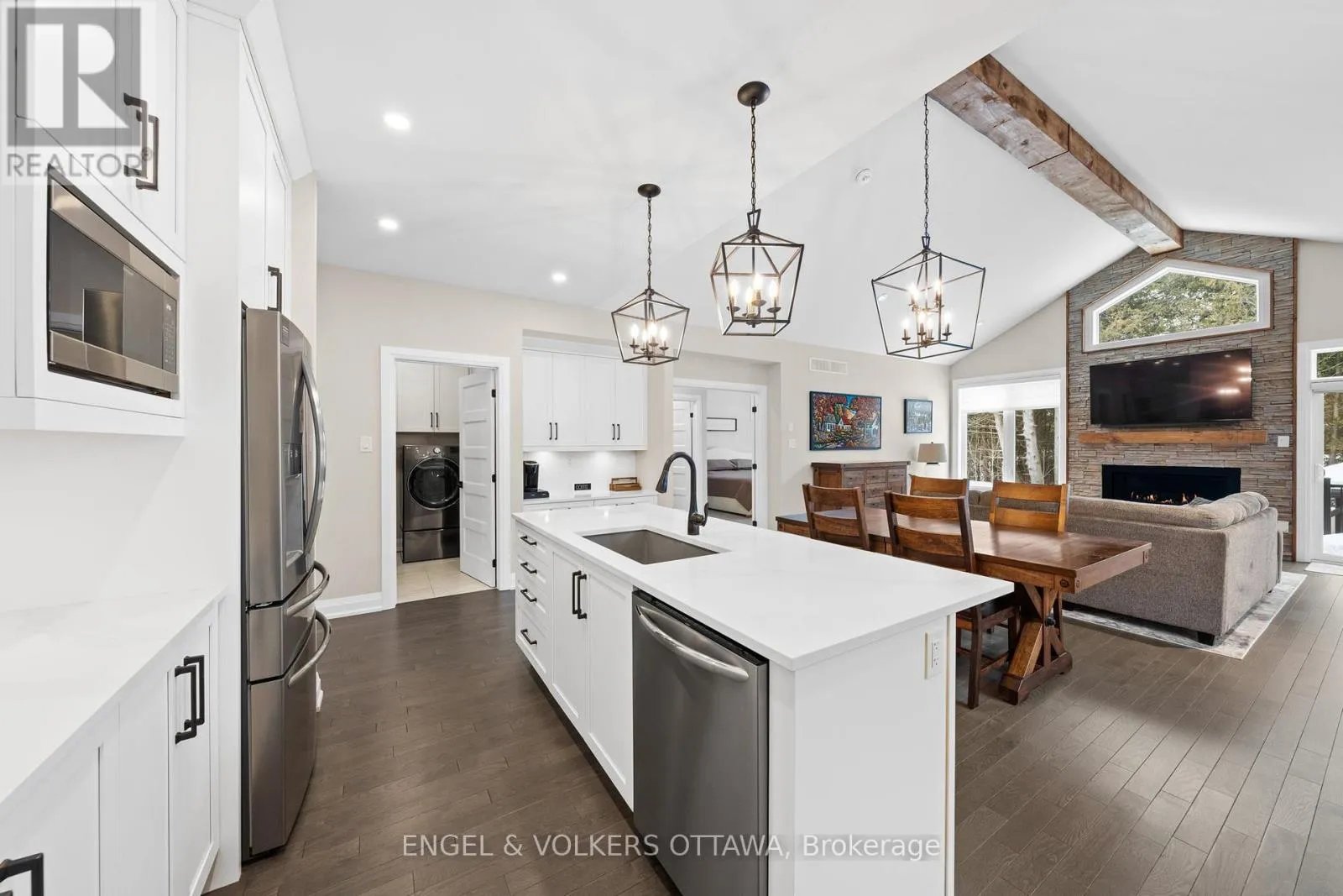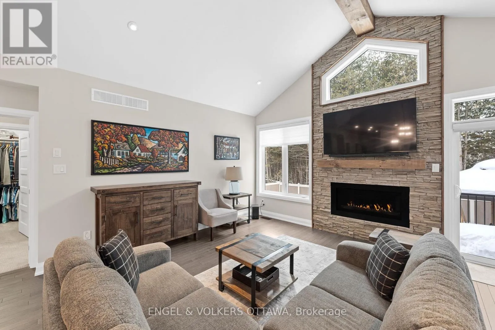 Welcome to this exceptional 2-bedroom, 2-bathroom home located in the award-winning Equinelle Golf Course and Community. Built by EQ Homes, the highly desirable Dumont model is loaded with countless upgrades and offers a warm, inviting atmosphere throughout. The impressive great room features a soaring vaulted ceiling with an exposed wood beam, a striking floor-to-ceiling stone feature wall, and an oversized