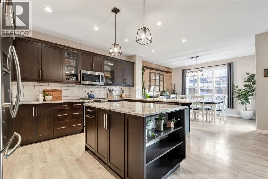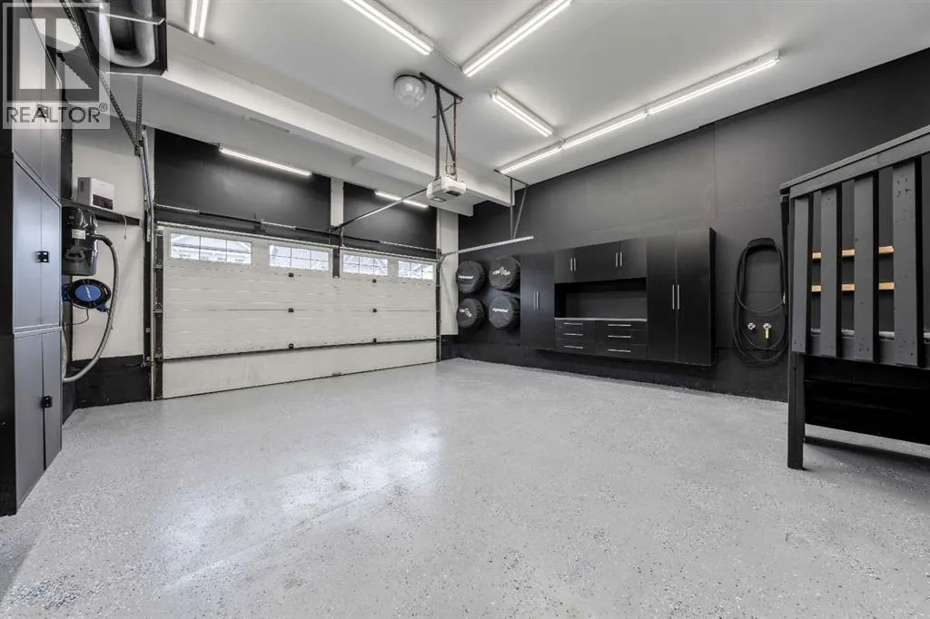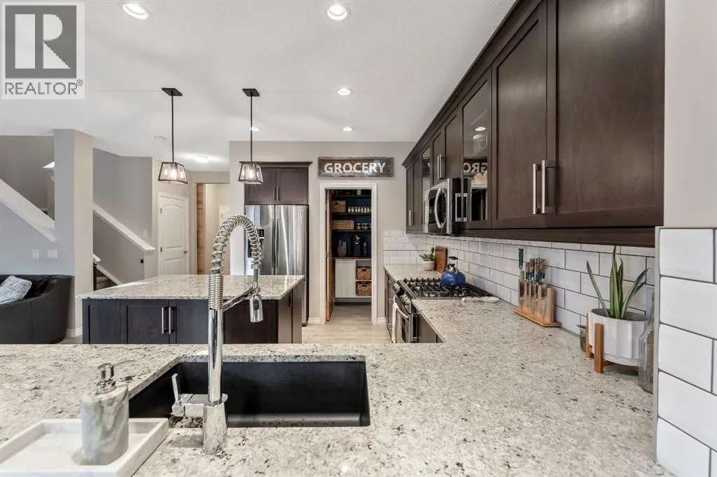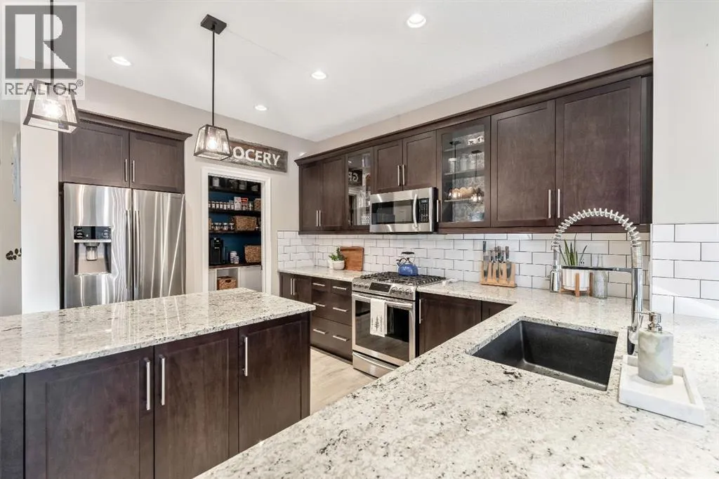 living come together seamlessly here. The main floor offers a warm and inviting living room highlighted by a gas-tiled fireplace, feature walls, custom shelving, and a charming custom barn door at the rear entry adding character and versatility. The kitchen is both stylish and practical, featuring granite countertops, a large island with built-in garbage and recycling pull-outs, espresso cabinetry with glass doors, stainless steel appliances, and a gas cooktop. A custom pantry door and electrical in the pantry complete the space. Upstairs, the spacious primary bedroom offers a relaxing retreat with a large soaker tub, his-and-hers sinks and vanity spaces, and his-and-hers walk-in closets. Two additional generous-sized bedrooms, a full four-piece bathroom, and convenient upper-floor laundry complete the upper level.The unfinished basement is ready for your design ideas and includes a bathroom rough-in and provides excellent potential for future customization. Additional highlights include a rough-in for air conditioning and a recently serviced tankless hot water heater.The oversized double attached garage is truly a standout feature, measuring approximately 20’ x 23’ with an impressive 15’ ceiling height. Professionally finished, this space has been extensively customized with an epoxy-coated floor, hot and cold water with additional shut-off valves conveniently located in the basement, and frost-free taps in the garage for added peace of mind. Heating is provided by a Schwank 40,000 BTU radiant tube heater with thermostat ($10k value), c omplete with a permitted fresh air intake. A dedicated 220V outlet on its own breaker has also been installed, offering excellent flexibility for future use. Tire hangers mounted beside the wall-mounted black cabinet are included. The backyard has been thoughtfully designed to create a private and inviting outdoor retreat, framed by mature trees for natural privacy. A custom cedar deck anchors the space, complemented by a covered pergola featuring substantial Douglas fir beams and a solid fir structure. Carefully planned landscaping and a structured drainage system enhance both the beauty and long-term functionality of the yard and a structured drainage system designed to prevent water issues. Additional features include reflective tint on all windows to help keep the home cool in summer months, and a transferable business permits. Riviera is the upscale community you will love to call home, just steps from the gorgeous Bow River and a short drive to Calgary and the Rocky Mountains. (id:62650)