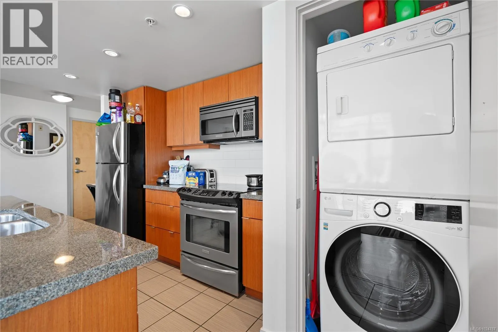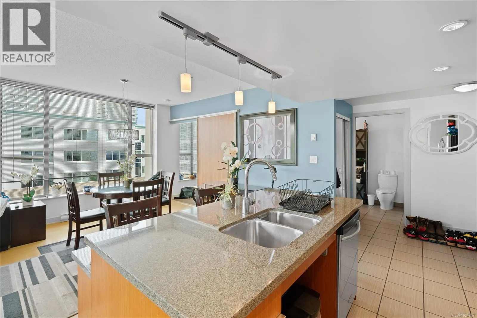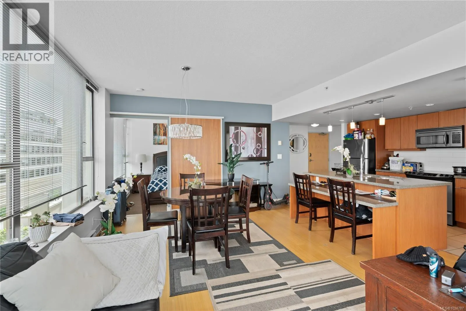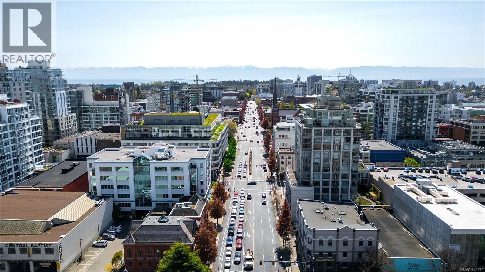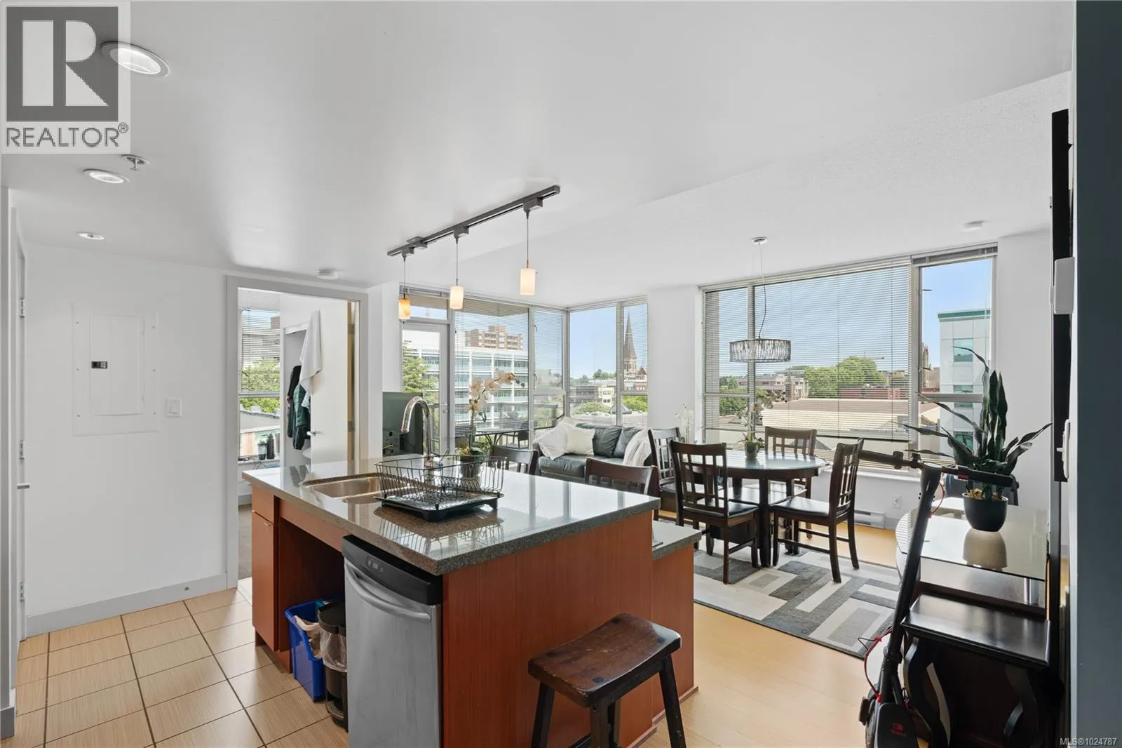 Welcome to a bright 2-bed, 1-bath condo in The Juliet, a sought-after steel and concrete building in the heart of Victoria. The floor-to-ceiling windows offer sweeping views of the city, which fill the space with natural light. The modern kitchen features ss appliances, quartz counters, a bi-level island with breakfast bar, and sleek bamboo flooring throughout. The primary bedroom includes