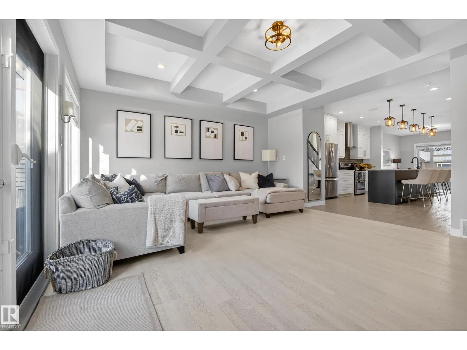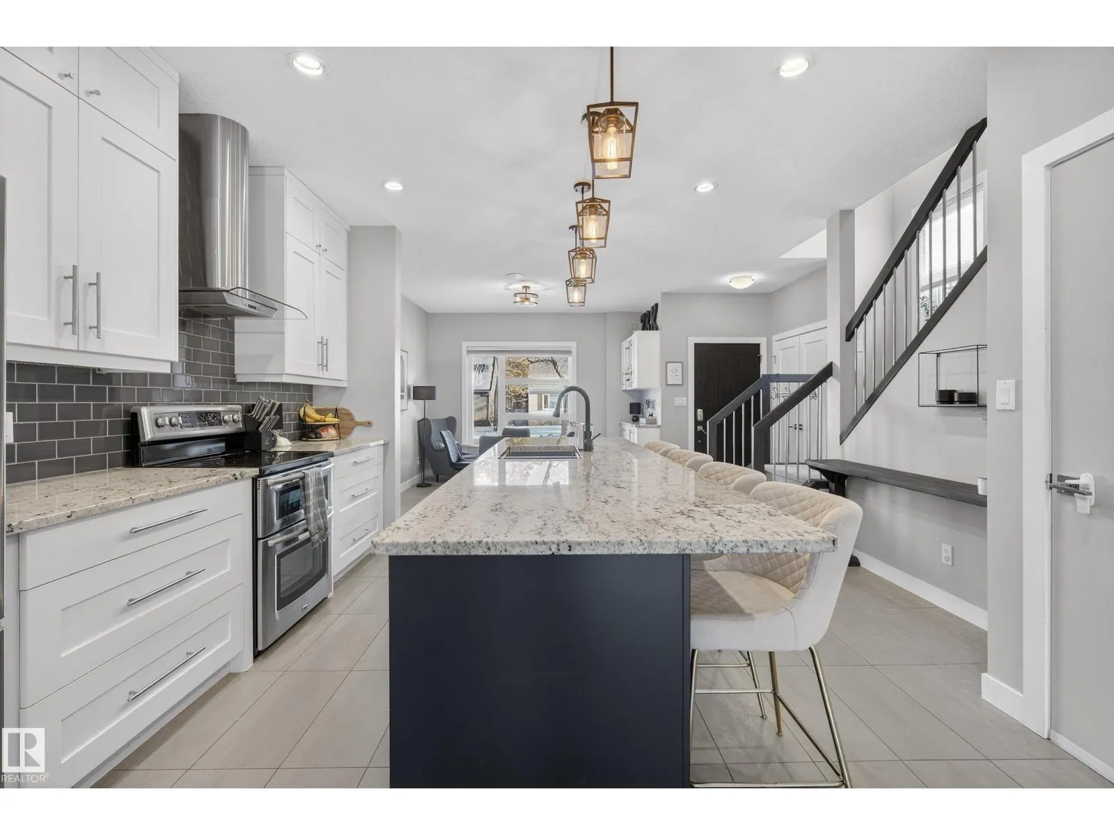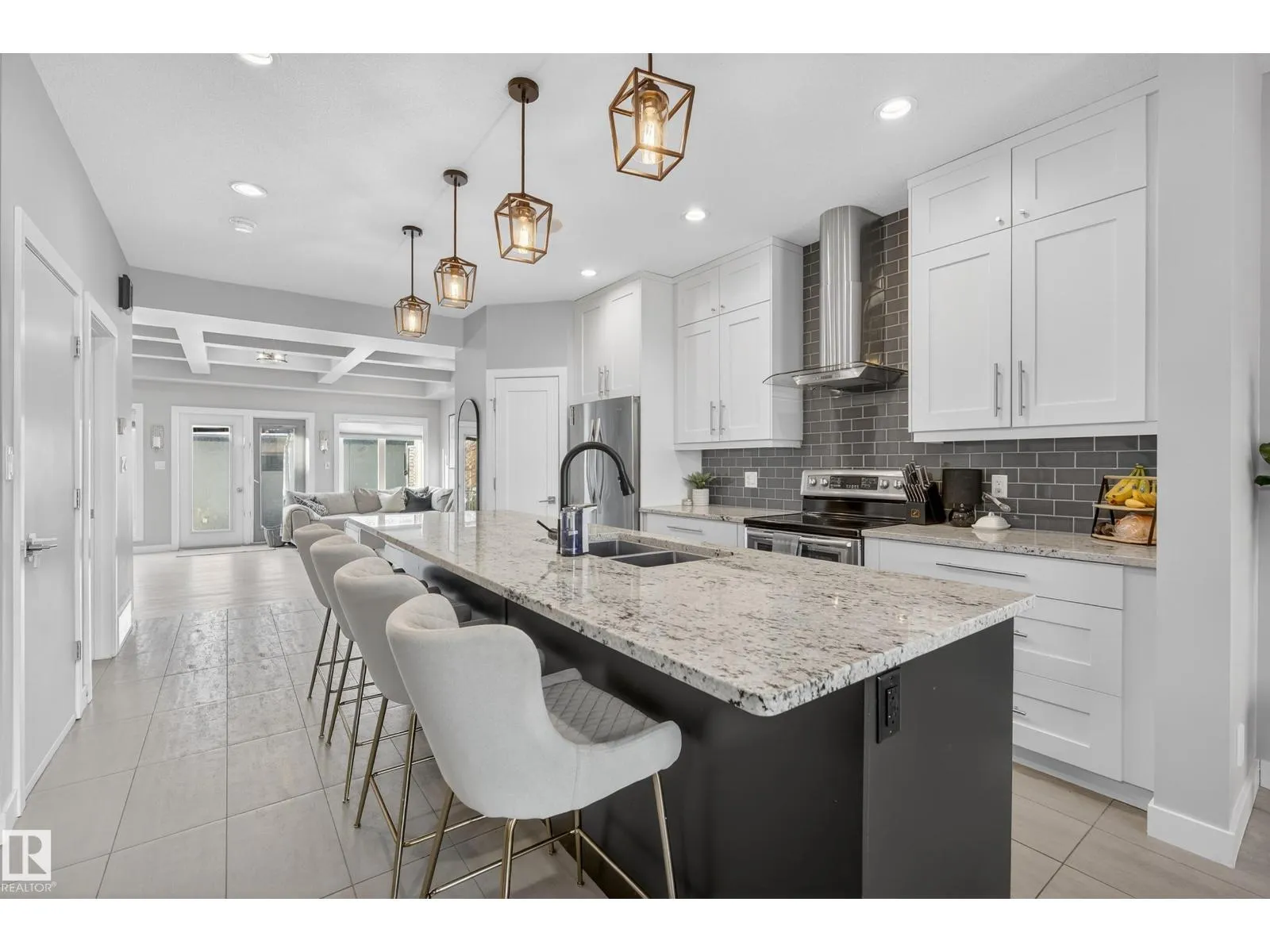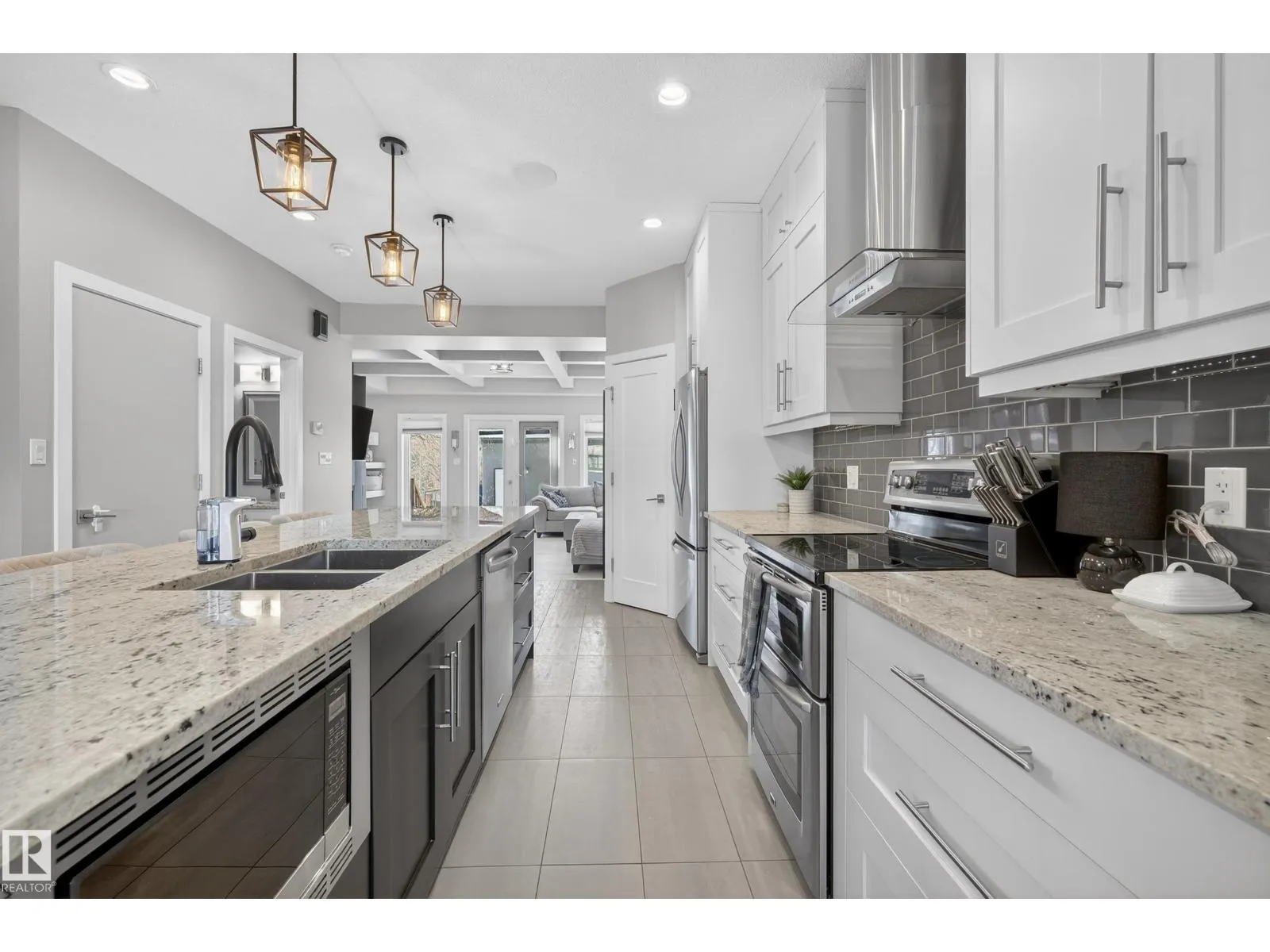 Turn-key, custom-built luxury infill (2014) with 1,822 sq ft above grade and 2,655 sq ft total living space, thoughtfully designed and not narrow like a typical skinny home. 9-ft ceilings throughout, stunning living room with custom coffered ceiling, feature-tile wall, gas fireplace, and integrated smartphone-controlled surround sound. Modern kitchen with granite (throughout house), 10-ft island, custom cabinetry, MDF shelving,