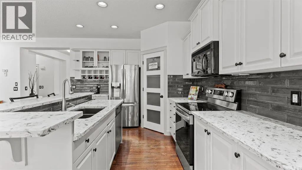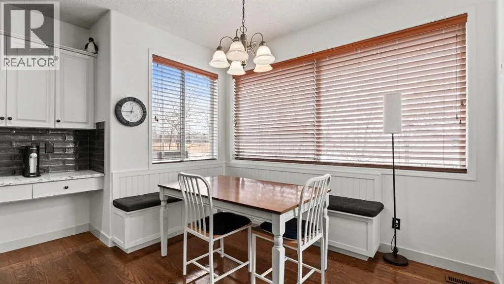 living. Inside, the main level is thoughtfully designed for both family life and entertaining, featuring warm hardwood floors, soaring ceilings, and an abundance of natural light throughout. A formal dining room welcomes you at the front of the home, providing an elegant space for gatherings and special occasions.At the heart of the home is the spacious kitchen, showcasing crisp white cabinetry, quartz countertops, stainless steel appliances, a large centre island with seating, and a walk-in pantry. The kitchen flows seamlessly into a bright breakfast nook, where expansive windows overlook the backyard and green space beyond — a perfect spot for morning coffee or casual meals.The adjacent living room is both inviting and impressive, anchored by a gas fireplace with architectural surround and open-to-above ceilings that enhance the sense of space and light. Oversized windows frame serene outdoor views while filling the room with sunshine. The main level is completed by a convenient laundry room, powder room, and a welcoming foyer that sets the tone for the rest of the home.Upstairs, the large primary suite serves as a true retreat. Generously sized to accommodate a king bed and additional seating, it offers a calm and comfortable atmosphere. The ensuite features dual vanities, a deep soaker tub, and a separate shower, while the walk-in closet provides excellent storage and organization. Two additional bedrooms on the upper level are well-proportioned and versatile, ideal for children, guests, or home office use, and are complemented by a full bathroom.The fully developed basement ad ds exceptional flexibility, featuring a spacious family and recreation area, perfect for movie nights, games, or a home gym. Two additional bedrooms and a full bathroom make this level ideal for guests, teenagers, or extended family living, while still offering ample storage space.Step outside to the beautifully landscaped backyard, where multiple outdoor living areas invite you to relax and entertain. A raised deck, lower patio, mature trees, and direct access to the green space and pathways create a private outdoor oasis — one of the sellers’ favourite features of the home.Offering 2,415 sq ft above grade plus an additional 1,189 sq ft in the fully developed basement, with three bedrooms upstairs and two more below, this home delivers exceptional space, privacy, and lifestyle in one of Calgary’s most sought-after communities. Close to schools, parks, pathways, amenities, and easy access to major routes, this is Cranston living at its best. (id:64429)