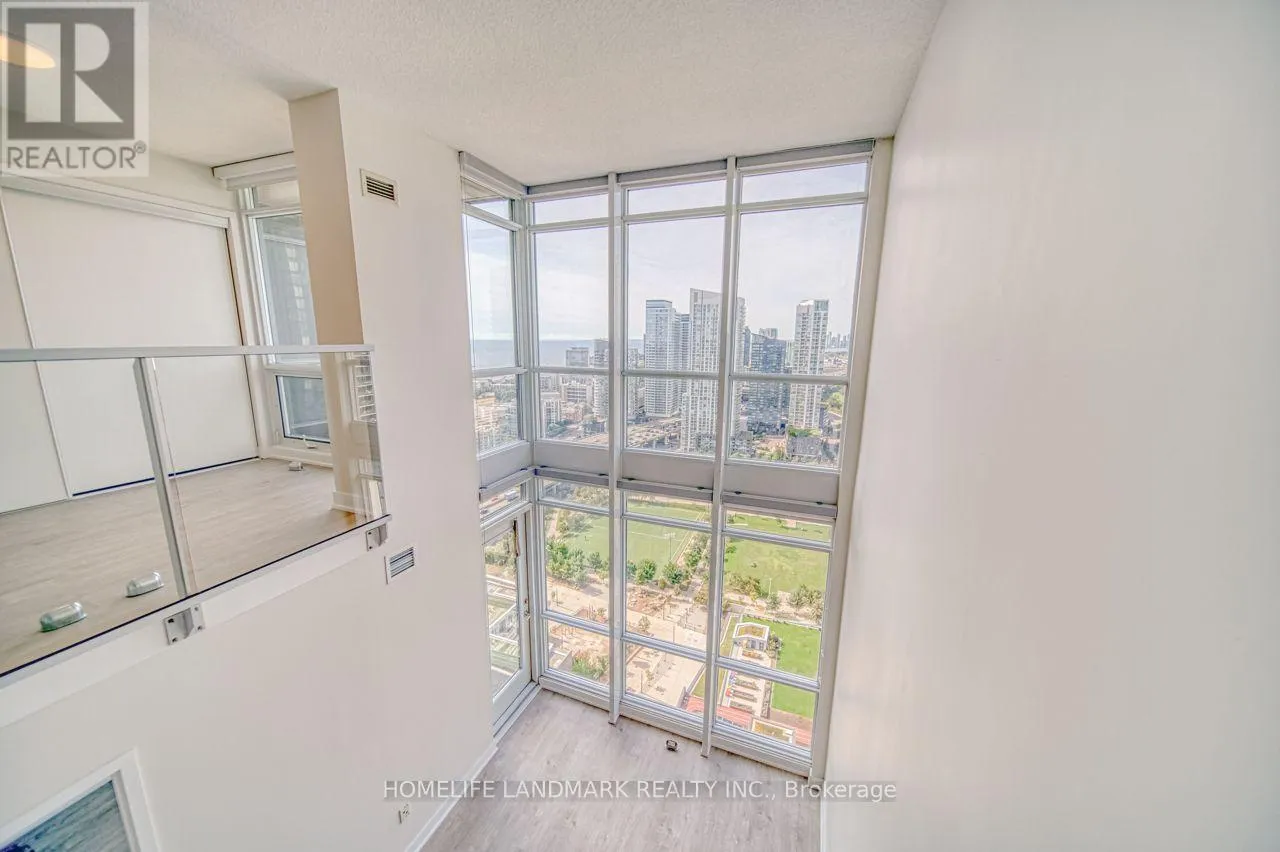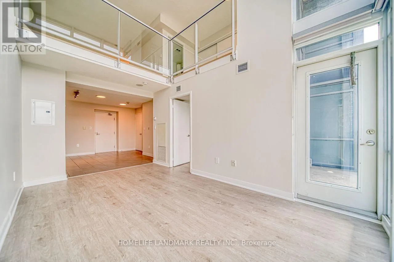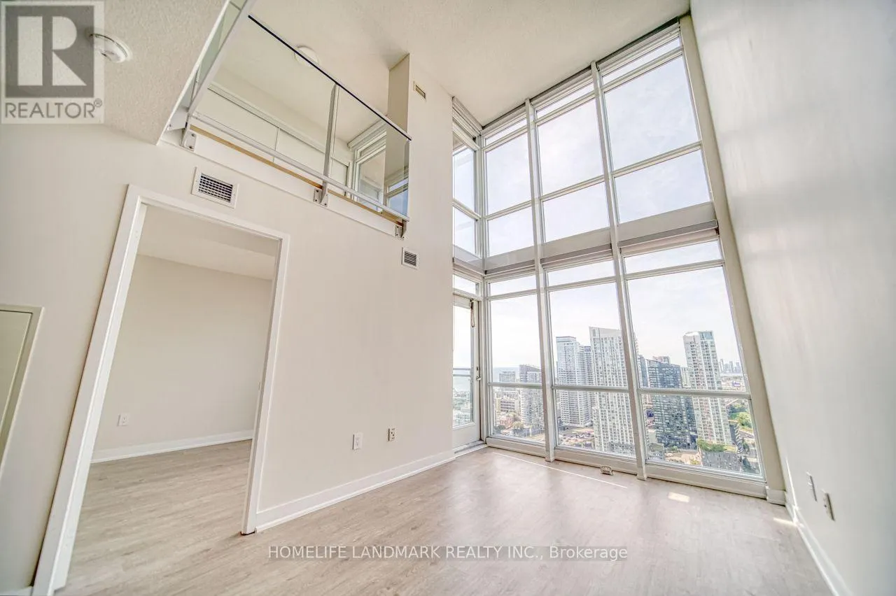 Spectacular fully upgraded 2-storey condo loft with unobstructed southwest city and lake views. Features 16-ft ceilings and floor-to-ceiling windows, offering approximately 1,032 sq ft of bright, open living space. Functional layout includes two spacious bedrooms, an open den ideal for a home office or walk-in closet, two full bathrooms, and ensuite laundry. Newly installed laminate flooring throughout. Excellent building amenities