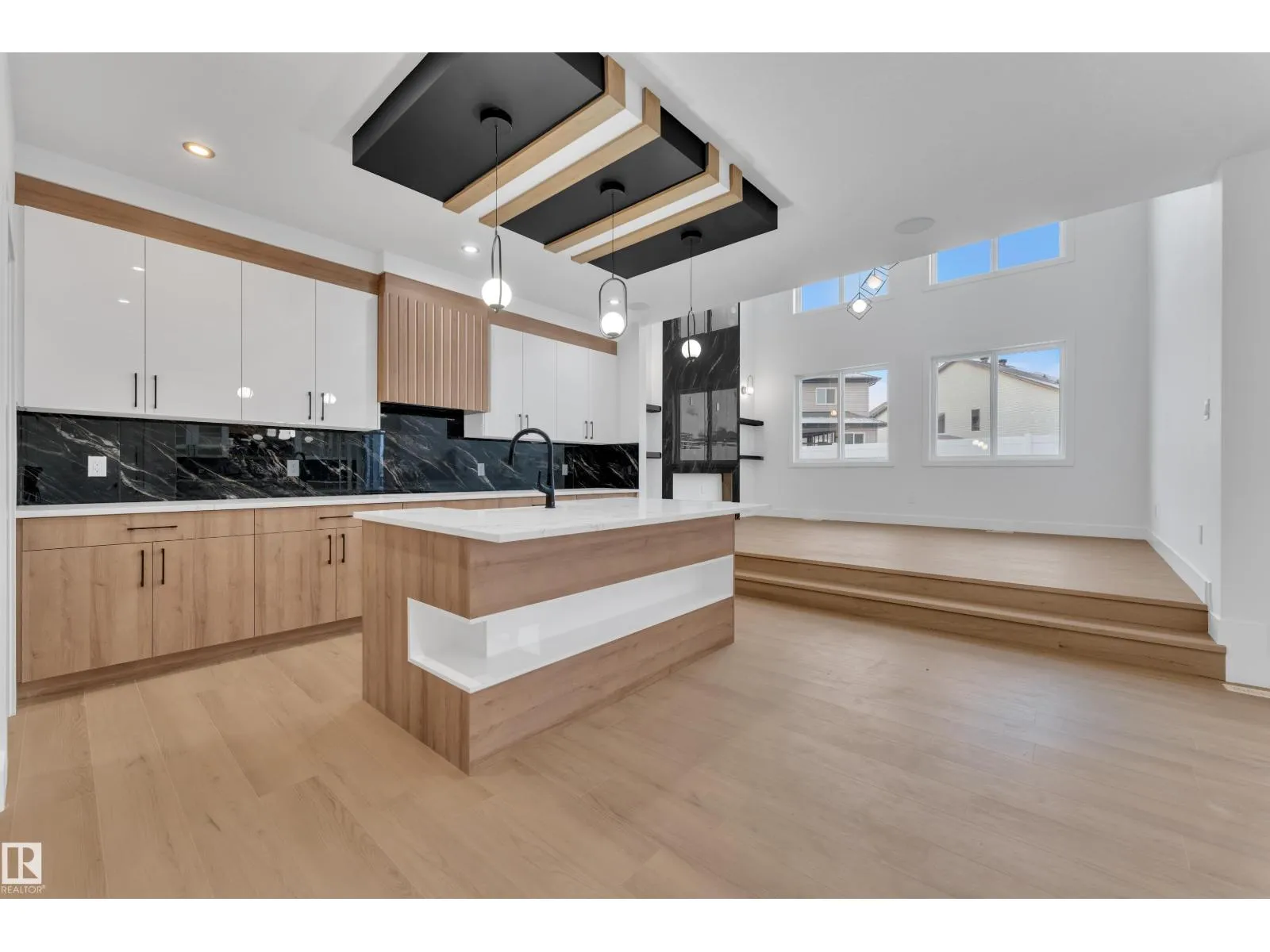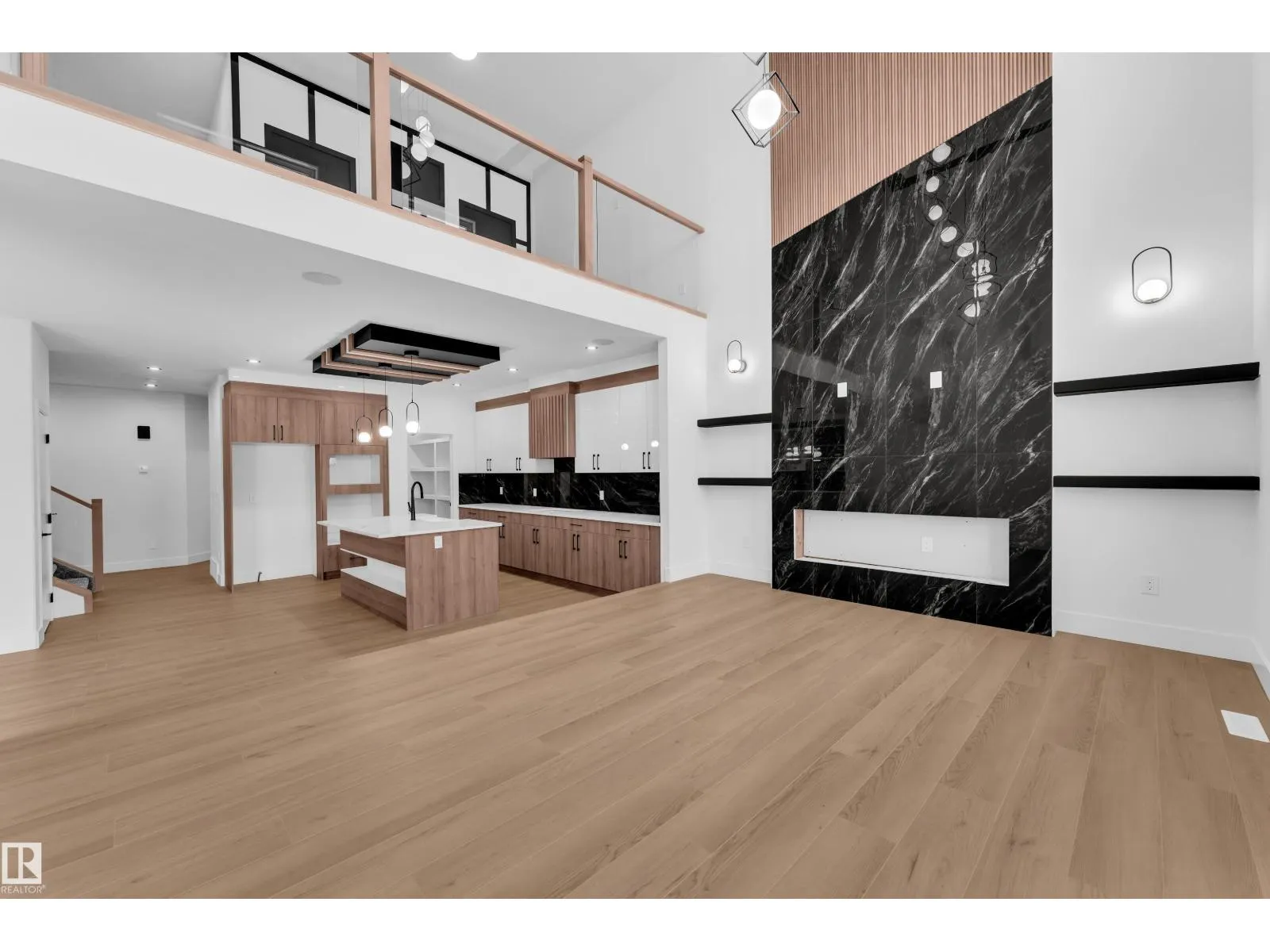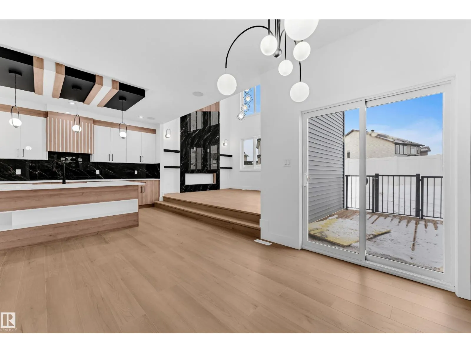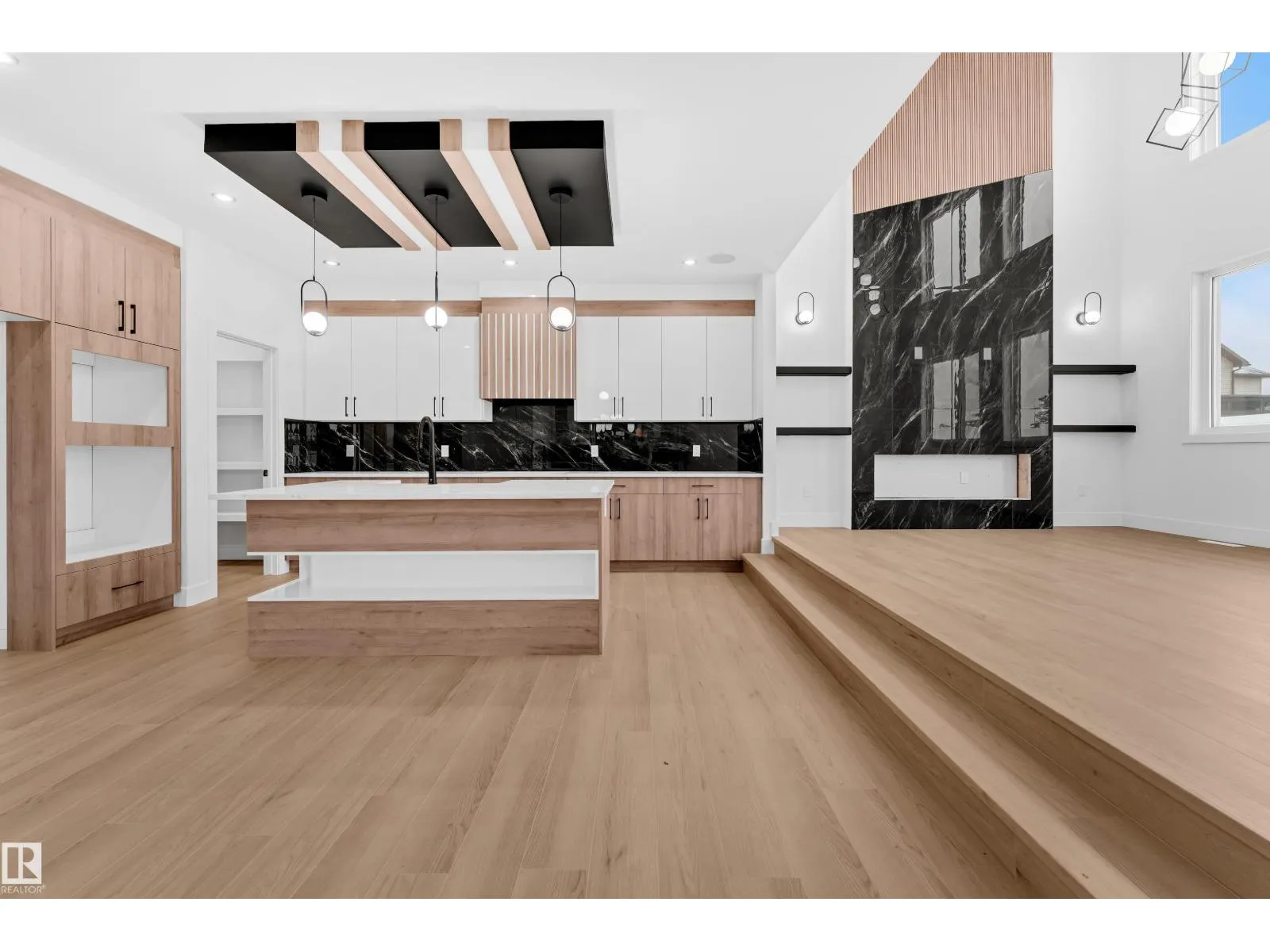 Step into luxury with this fully upgraded custom home. The main floor features a spacious bedroom and half bathroom for added convenience. The chef-inspired kitchen is a true masterpiece, complete with a unique center island and a pantry for ample storage. The step-up open-concept living area showcases a custom feature wall, while the adjacent dining space offers direct access to