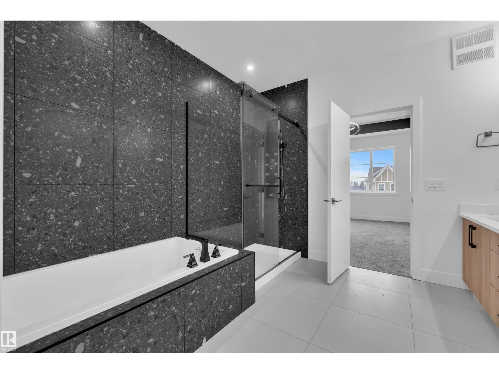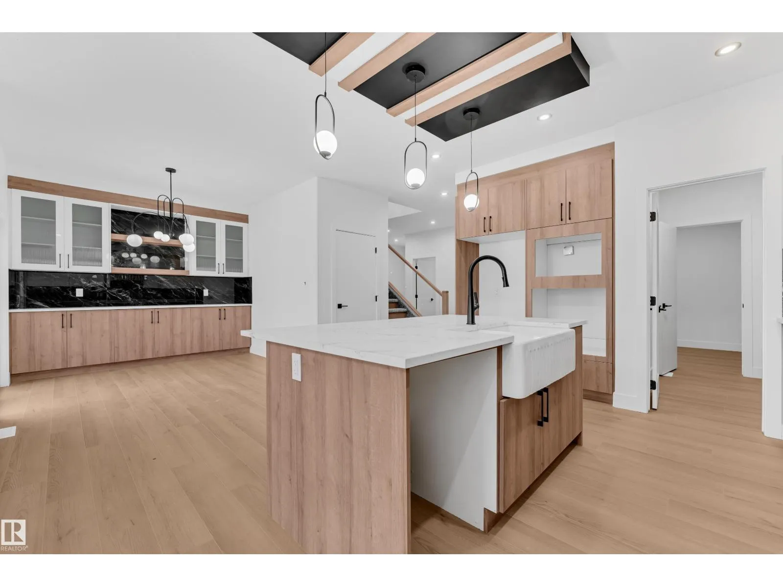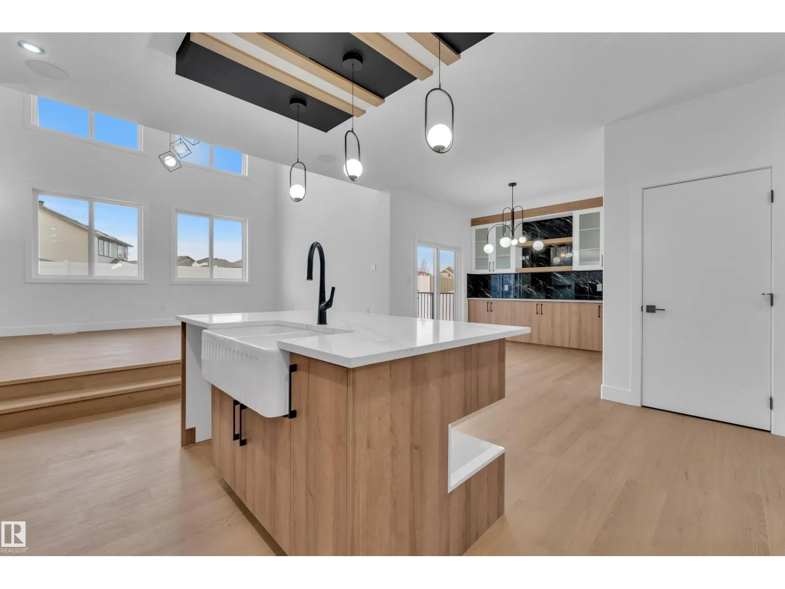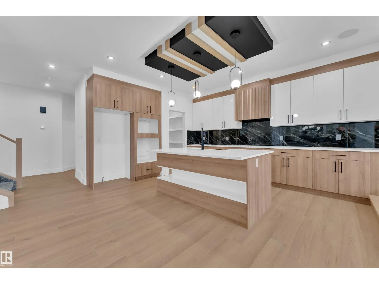Step into luxury with this fully upgraded custom home. The main floor features a spacious bedroom and half bathroom for added convenience. The chef-inspired kitchen is a true masterpiece, complete with a unique center island and a pantry for ample storage. The step-up open-concept living area showcases a custom feature wall, while the adjacent dining space offers direct access to