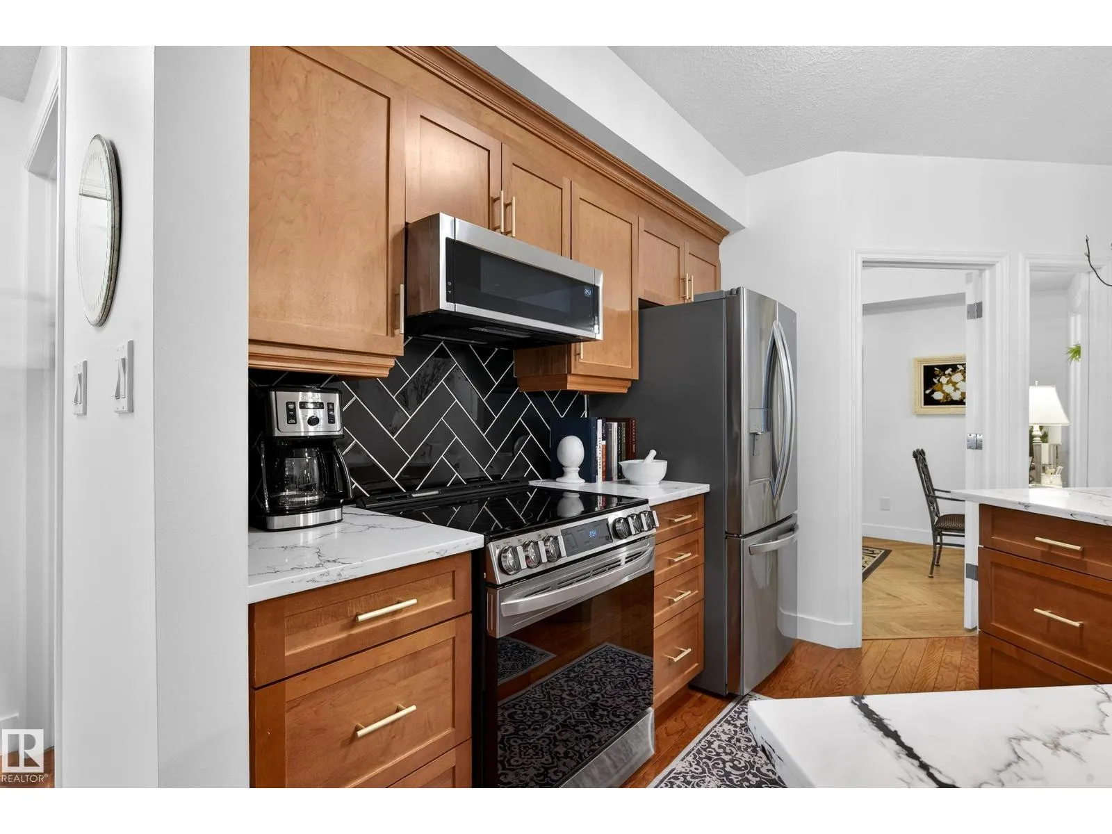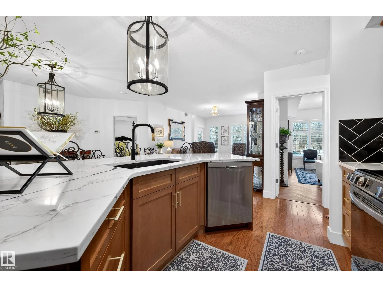 Located in the heart of the River Valley in Cloverdale. This beautifully renovated main floor condo features over 1,294 sq ft with quality upgrades throughout. The spacious primary includes a walk-through closet and 4-pc ensuite, 2nd bedroom is conveniently located next to another 4-pc bath. The updated kitchen is ideal for entertaining with a custom counter-height island, quartz countertops, new