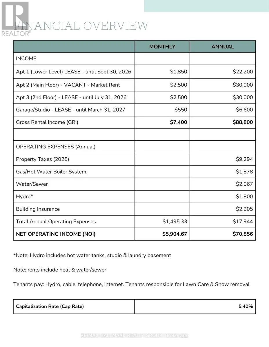 Exceptional Investment Opportunity – Turnkey Triplex + Studio in Prestigious New Edinburgh/Lindenlea. Strong income-producing asset with a 5.4% cap rate, gross income of $88,800, and NOI of $70,856, supporting approximately $1,250,000 in financing at current rates – a true money maker. Unit 1 is leased at $1,850/month + hydro, Unit 2 (vacant) offers market rent of approximately $2,500/month, Unit 3