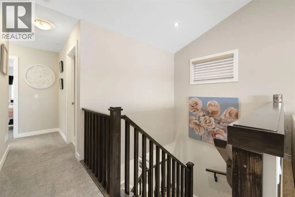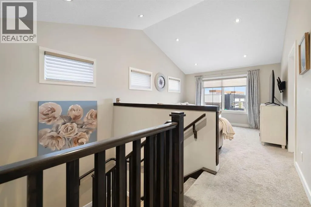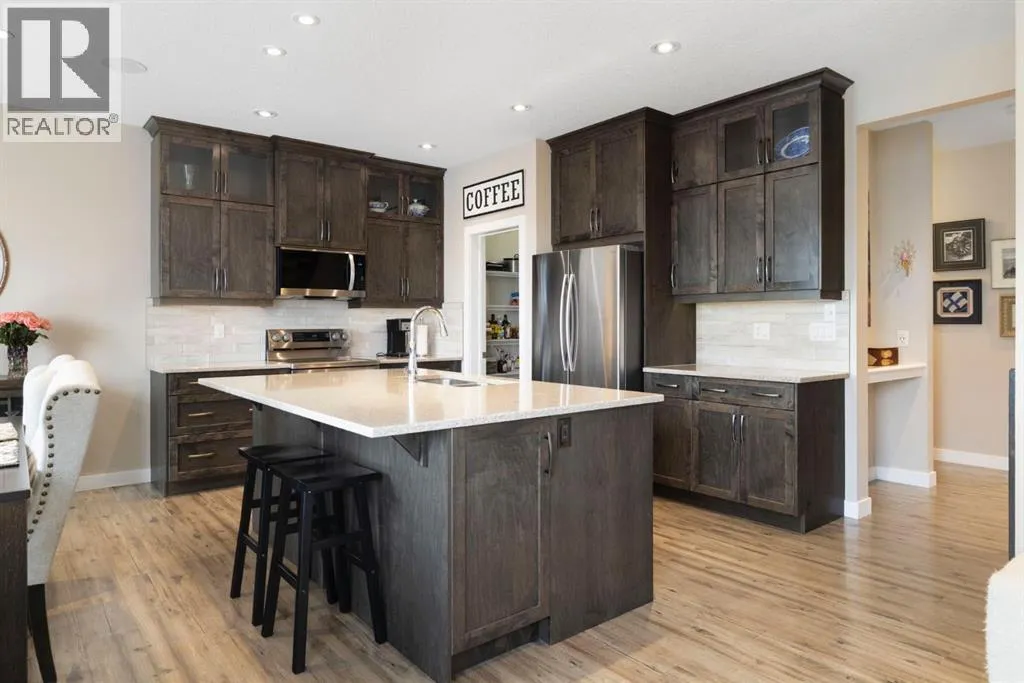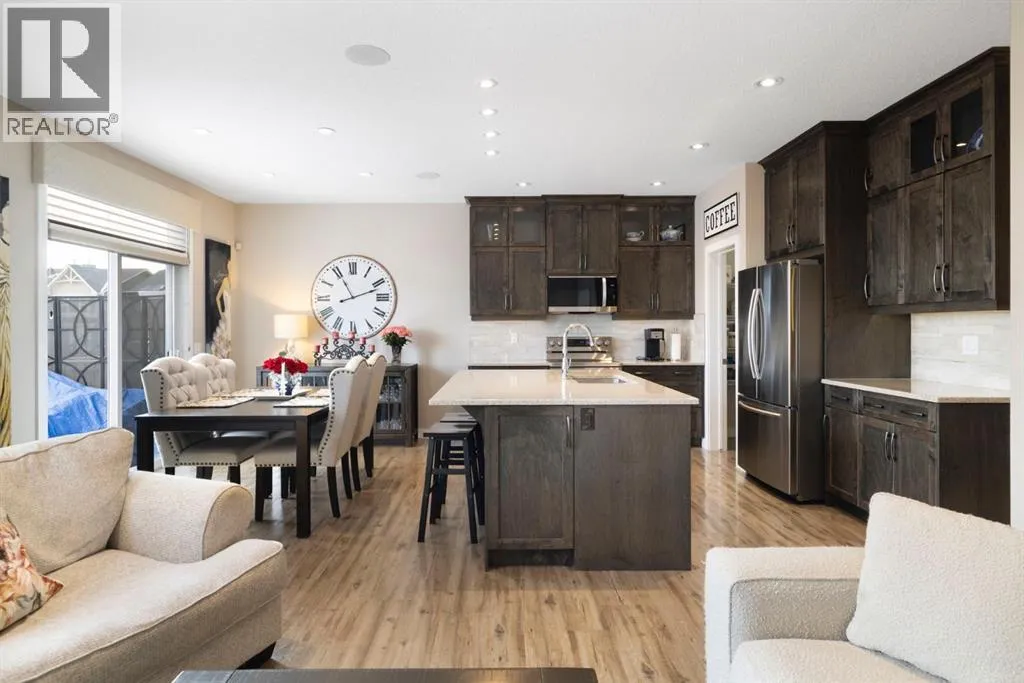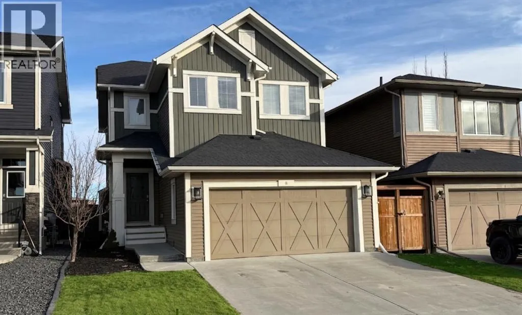 Welcome to 8 Emberside Glen! This beautifully finished two-storey FORMER SHOW HOME offers style, functionality, and an unbeatable family-friendly location backing directly onto the Holy Spirit Catholic School grounds. Stepping inside you are greeted by a spacious front entry and striking open-riser staircase that anchors the main level. The open-concept layout features durable hardwood flooring and a warm, inviting