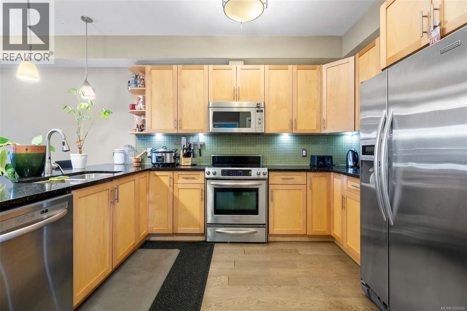 Welcome to Casa Bella. 201 is a must see, generously sized 2 bedroom 1 bathroom corner suite. Highlights include large master bedroom with walk in closet, engineered hardwood flooring, full in-suite laundry, plus a Murphy bed paired with custom office storage. Sunny patio space great for BBQ’s. A seamless open-concept design flows beautifully. Chef-inspired kitchen with stainless steel appliances, luxurious