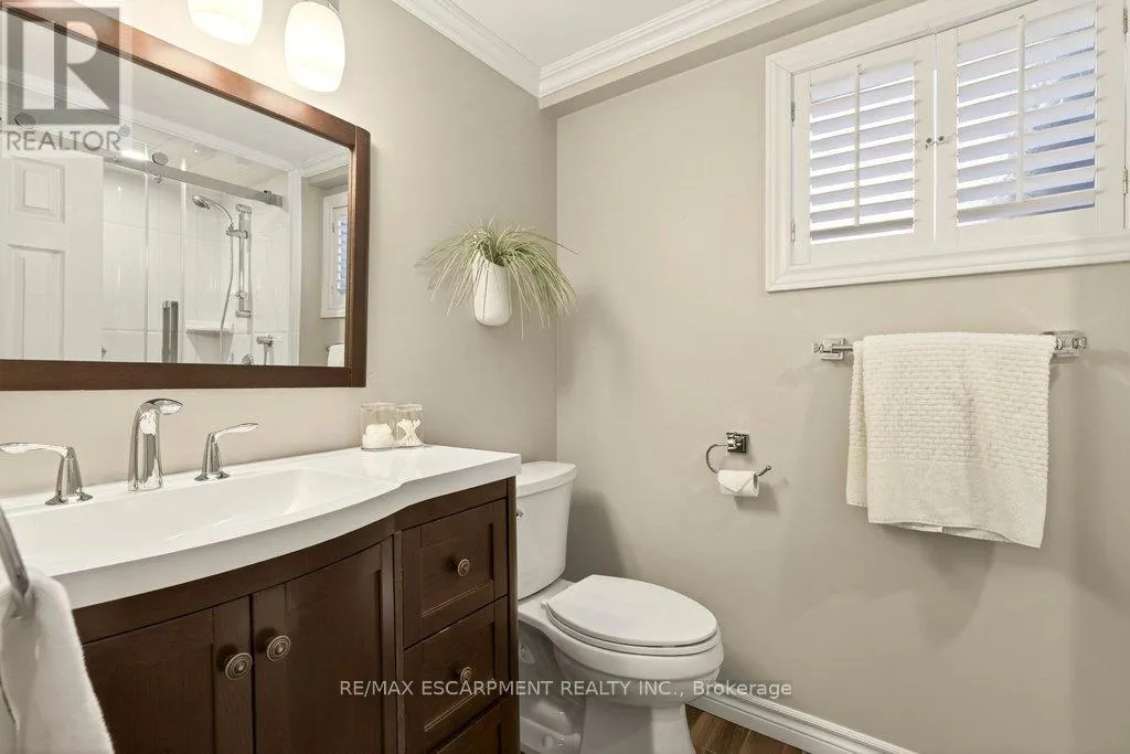 closets and a bedroom/den with walkout to deck/pool. The fully finished lower level has two additional bedrooms, a 3-piece bathroom, family room with gas fireplace and a spacious laundry room. Additional features include hardwood floors, crown moulding, wainscoting, skylight, California shutters, central vac, updated furnace (2024), inside entry from a single garage and a double drive with parking for 4 cars. (id:62650)