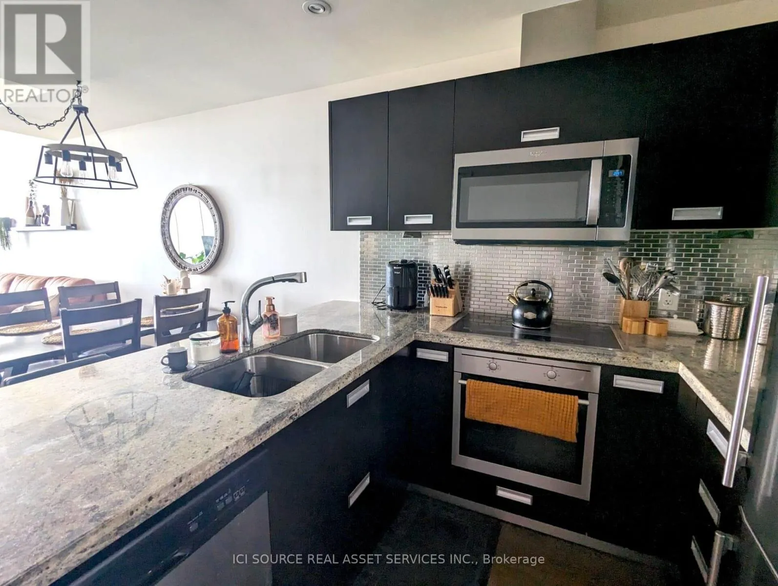 This unit features a one bedroom as well as a large sized den with a sliding door, perfect for an office or a guest bedroom. Tastefully finished and meticulously maintained upgraded unit featuring a functional, open-concept layout with no wasted space. The modern kitchen boasts a large island with double sink and floor-to-ceiling windows throughout, offering clear, unobstructed views. Spa-inspired