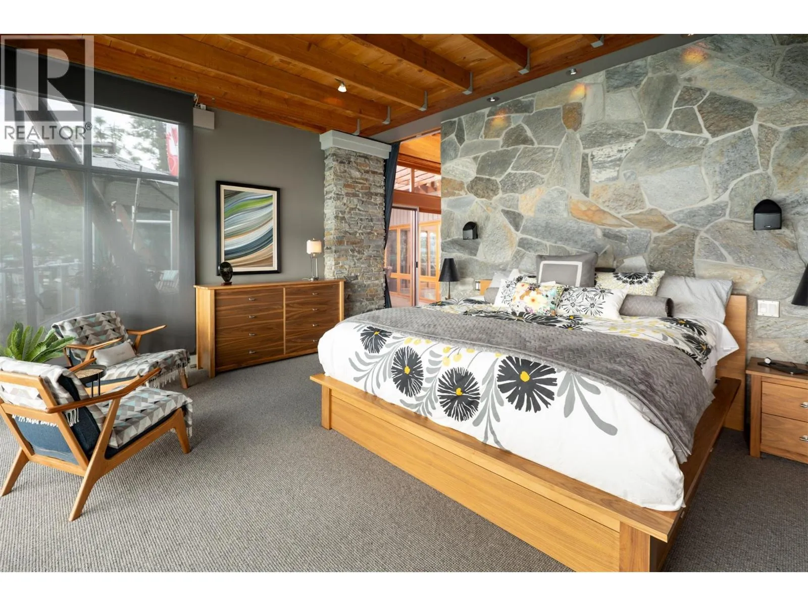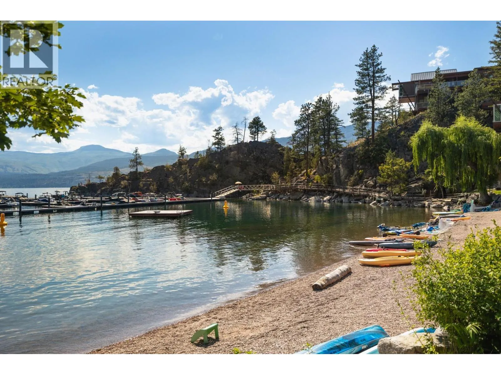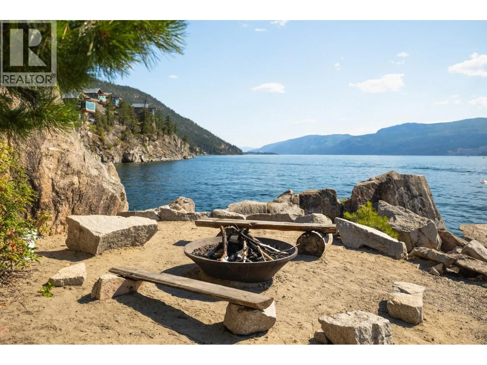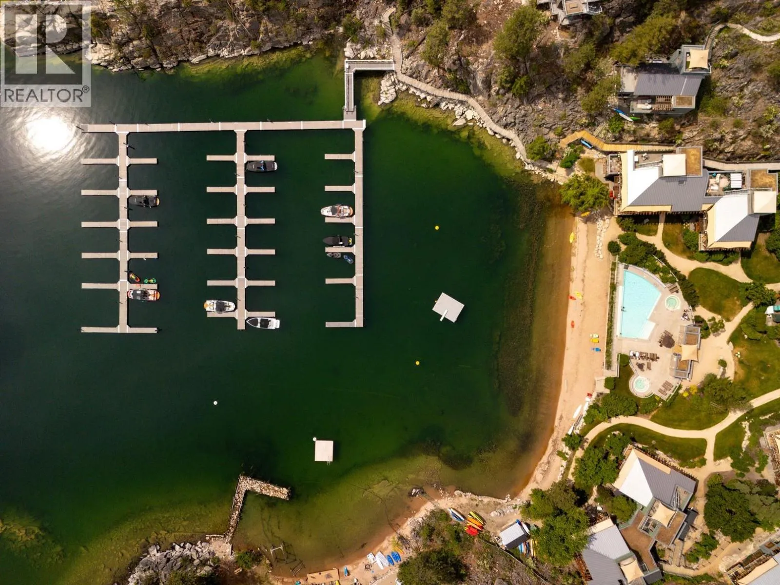Perched above the shoreline in the exclusive Outback community, this one-of-a-kind cantilevered lakefront home is a West Coast-inspired masterpiece that blends bold architecture with the serenity of nature. Crafted into the rocky knoll, the 5 bedroom, 4 bathroom custom residence offers 3,423 sq.ft. of thoughtfully designed living space and over 1,200 sq.ft. of multilevel outdoor terraces, all with panoramic lake