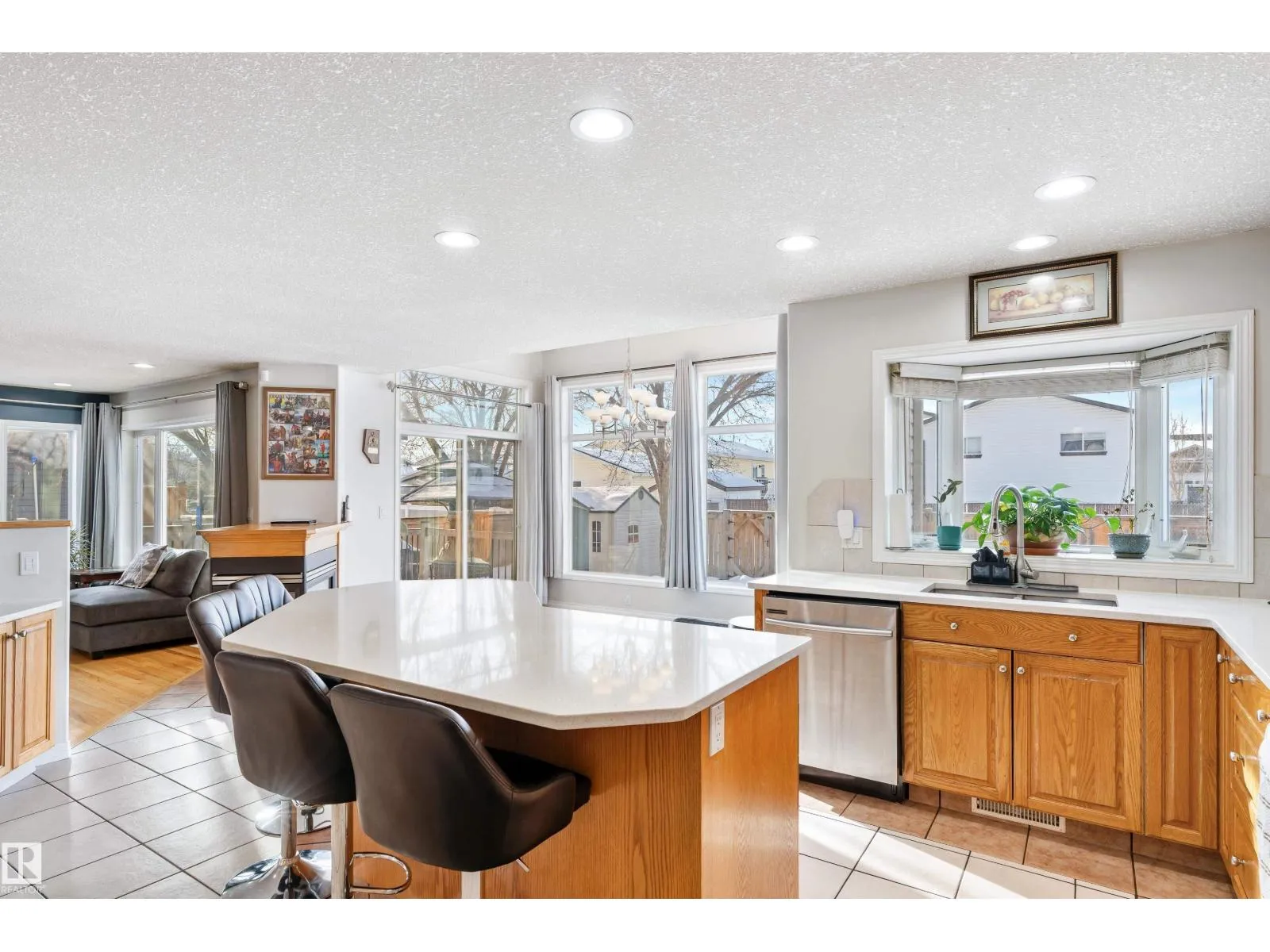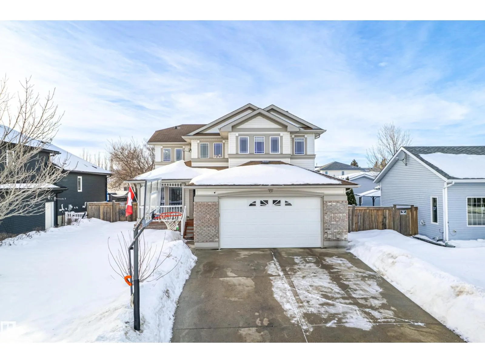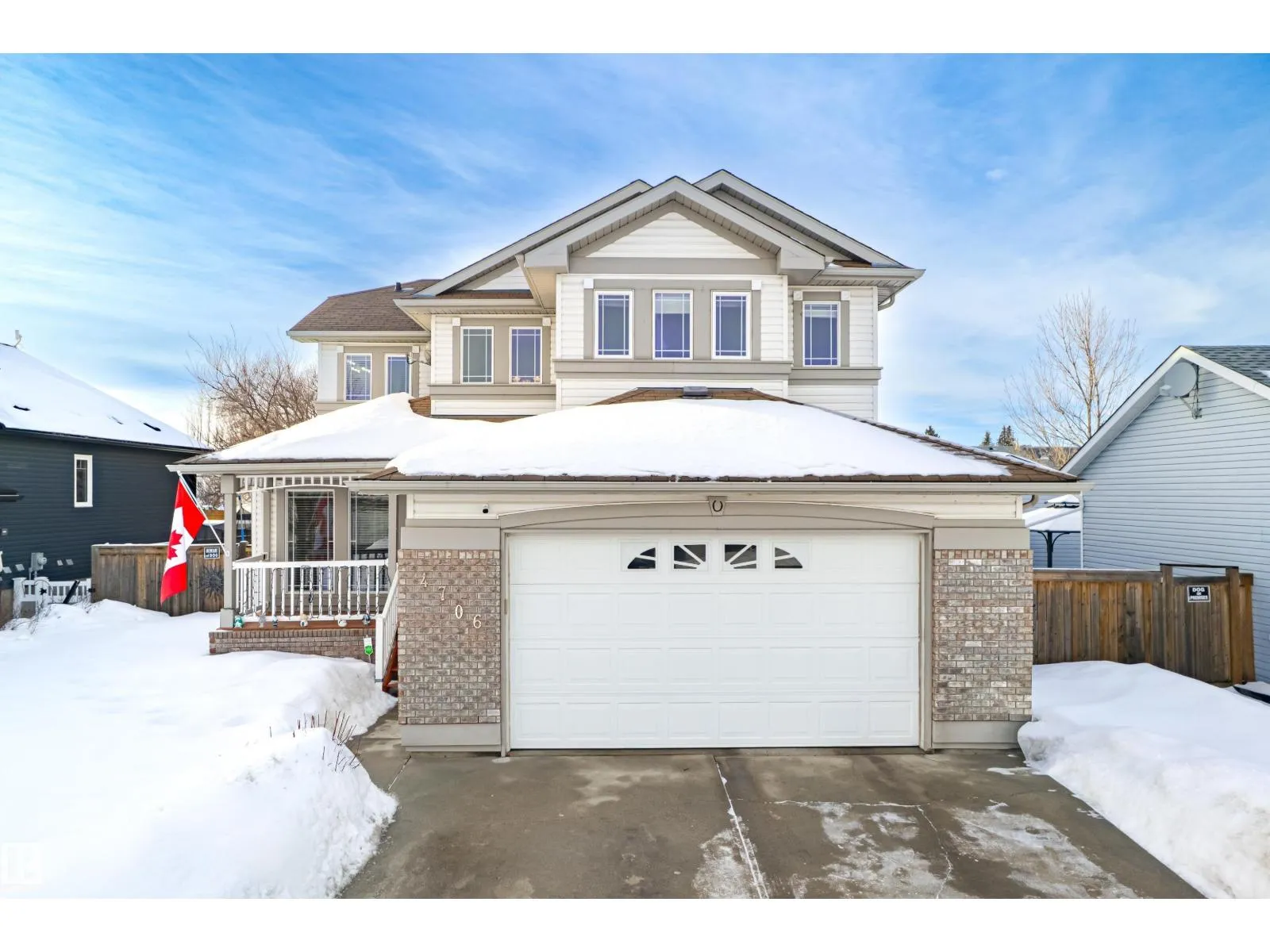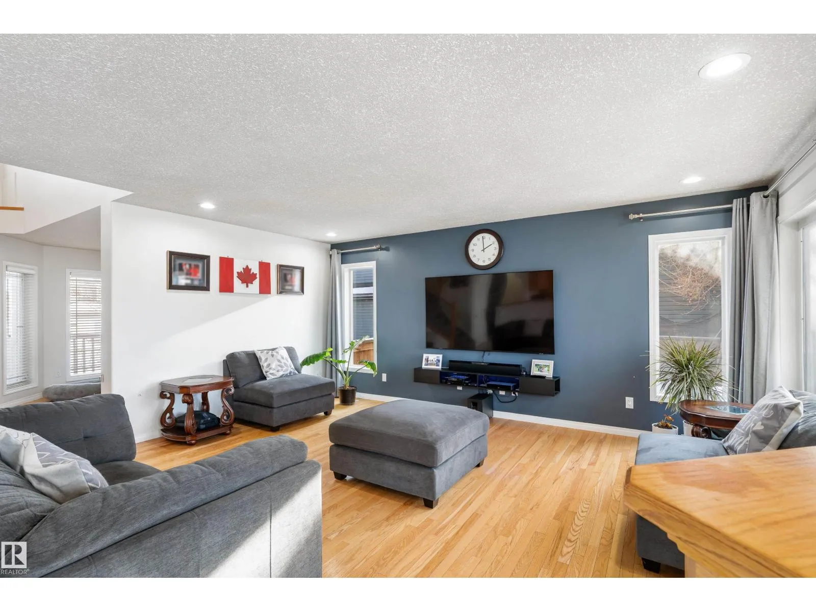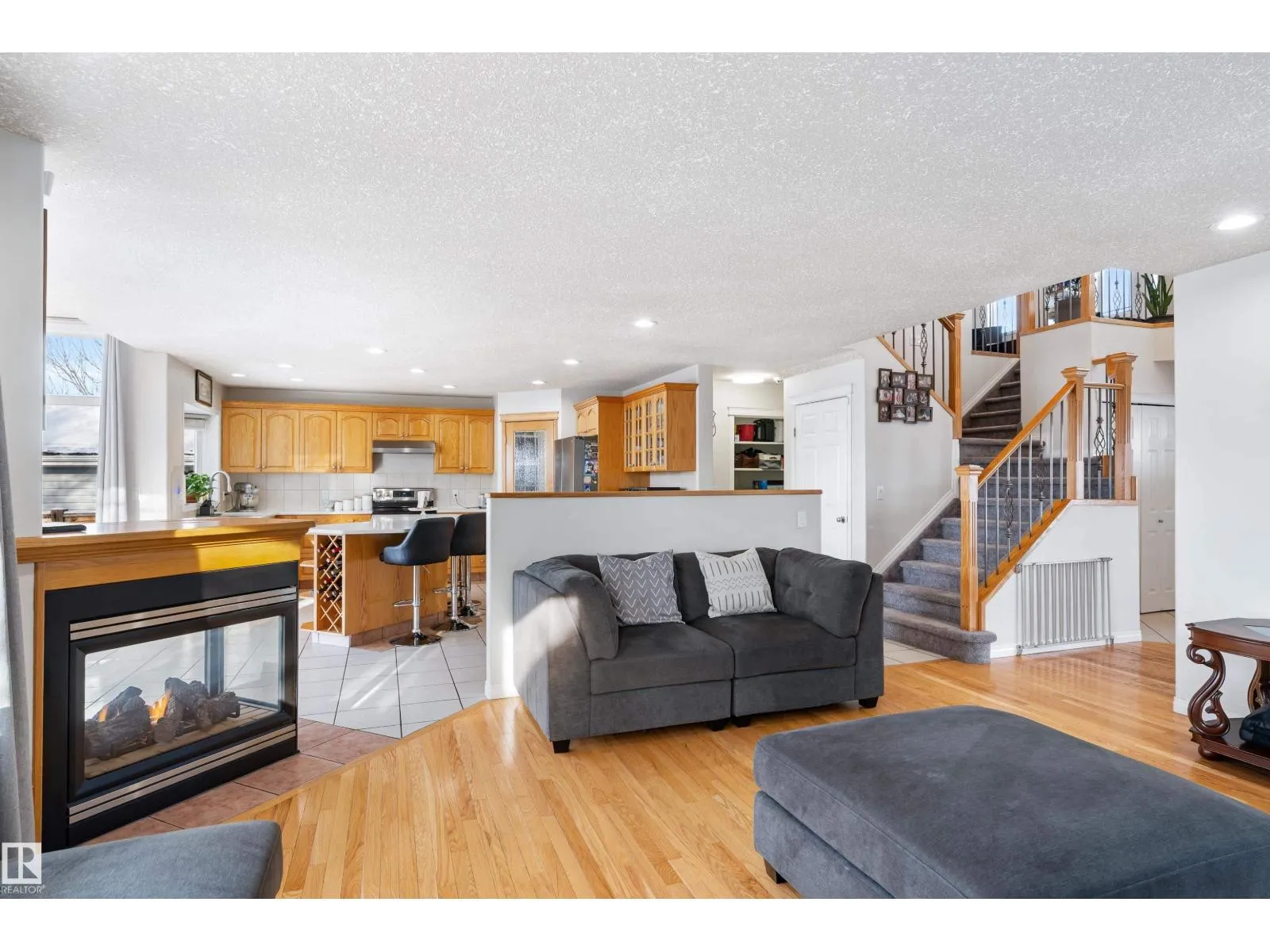 Welcome to this stunning two-storey family home featuring exceptional space and comfort. The main level showcases hardwood floors, a spacious living room with striking navy accent wall, and abundant natural light. The gourmet kitchen boasts rich oak cabinetry, center island with wine storage, stainless steel appliances, and breakfast nook overlooking the backyard. Enjoy the cozy double-sided fireplace connecting the kitchen