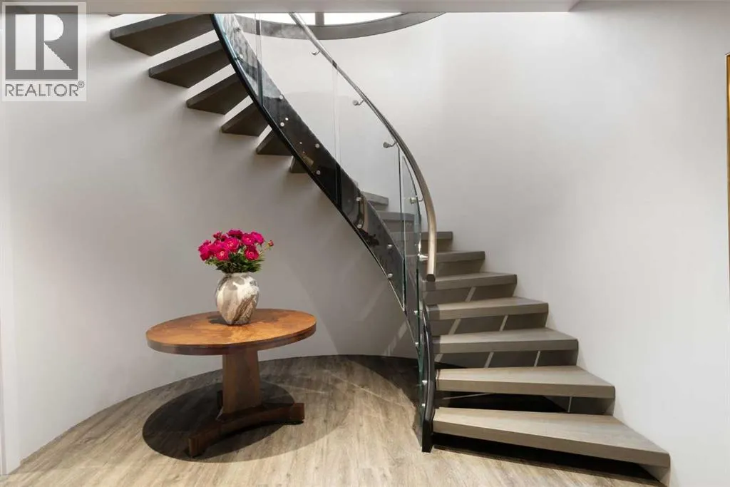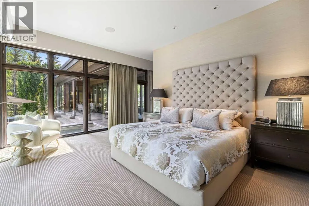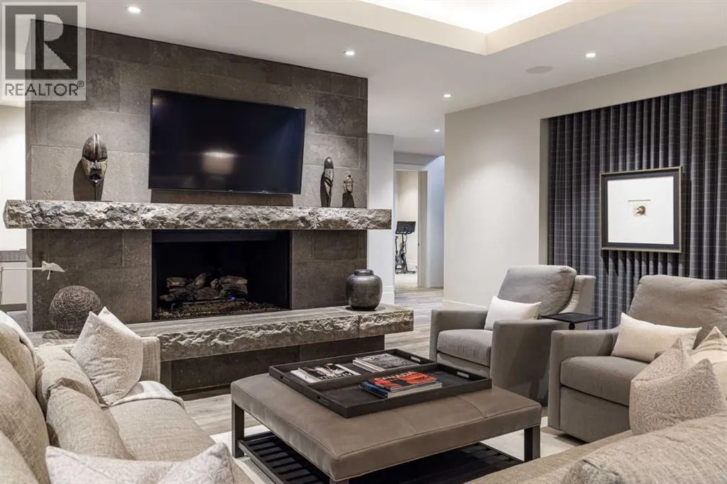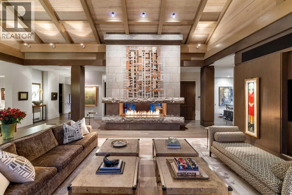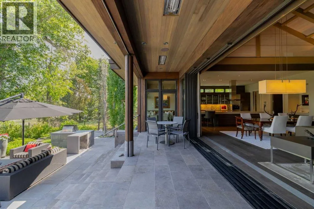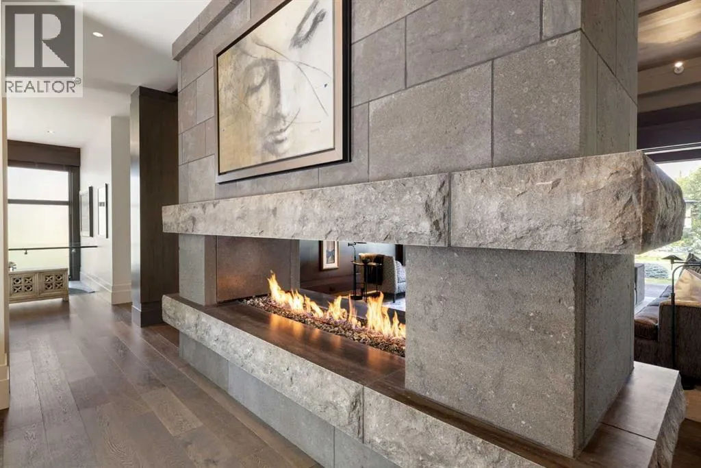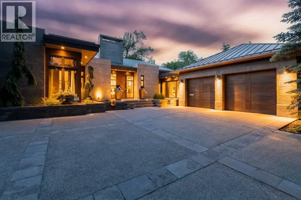 designed by award winning architect Mark Burkart and custom built by Mission Custom Homes, this extraordinary residence offers over 6,600 sq ft of refined living space. The design is quietly sophisticated, blending natural materials & light-filled spaces to create a home of remarkable beauty & comfort. The exterior, clad in warm silver-to-charcoal Saint Marc limestone, copper roofing, and Meranti hardwood soffits lends a sense of permanence and quiet strength evoking the spirit of a small modern museum. A front courtyard with a tranquil reflecting pool invites you into the home, while the rear terrace creates a serene outdoor retreat overlooking the Elbow River. Inside, elegant proportions and rich finishes create an atmosphere of understated luxury. Soaring 19′ ceilings define the great room, where a monumental limestone fireplace serves as a stunning focal point. A 30′ retractable glass wall opens entirely to a heated limestone terrace with phantom screens, infrared heaters, & built-in speakers, perfect for year-round enjoyment and effortless indoor-outdoor living. The chef’s kitchen is both functional & striking, featuring custom tigerwood cabinetry, a cantilevered 13’ Caesarstone island, and top-of-the-line Gaggenau and Miele appliances. A walk-in pantry, wet bar, & seamless flow to the dining area make the space ideal for entertaining or everyday living. The primary suite is a private riverside sanctuary with floor-to-ceiling windows, silk wall coverings, & heated marble floors. Its spa-caliber ensuite offers Bianca Carrera marble, a steam show er, a freestanding tub & a walk-in closet with custom cabinetry. Two exceptional home offices, a beautifully appointed laundry room, & an exquisite powder room complete the main floor. The lower level continues the home’s thoughtful design with a floating oak staircase, spacious family/rec room anchored by a stunning four-sided limestone fireplace, three bedrooms each with a full ensuite, a professional-grade gym, a custom wine room & a 12-foot wet bar. Radiant in-floor heating & elevator access ensure comfort & convenience on every level. Advanced mechanical and smart home systems provide comfort & security, Crestron AV, Lutron lighting, triple-pane Lowen windows, a heated driveway, Viessmann boilers, a water filtration system, & backup generator. Professionally landscaped, the outdoor living spaces include three distinct patio areas: a limestone-encased hot tub, a rundle stone firepit patio surrounded by lush perennial gardens & built-in BBQ area. More than a home, this residence is about a lifestyle. (id:62650)