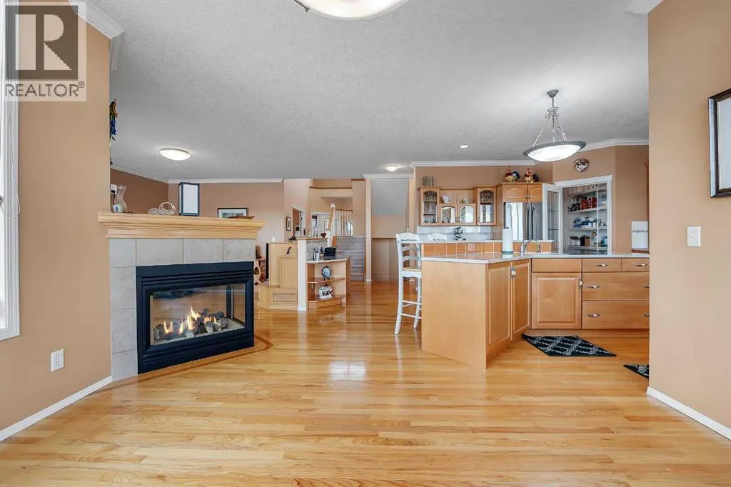 mountains, the sun rise & sun sets, your scenery changes constantly. The sunny south exposure back yard looks out to the green space/walking path. Park benches, park/play areas along the paths for you to enjoy as well. A triple car garage at the front of the home, with a drive through to an exterior parking pad, the buyer looking for the dream garage, this is it. A deck on the front of the home, a wrap around deck at the back & patios, this is a great home for the outdoor family. Professional landscaping from front to back is easy to maintain. There is a storage shed built into the home, not free standing. Inside the home you will see the immaculate care. Throughout the years this original owner has repaired and updated, using quality items. A list of upgrades is available for the interested buyer. Nothing to do but move in ! You will love the retreat /flex space in the master bedroom. The master bedroom is huge. Three bedrooms on the upper level, one bedroom in the basement plus another room (with no closet) that could be used for an additional bedroom. The master and the lower bedroom both have walk in closets. The laundry room is on the main level, a large walk in pantry and a beautiful kitchen with ample cabinets & tons of counter space. Take note of the beautiful Premium Naica polished quartzite granite counter tops. The cook will enjoy this space. The cozy sitting area on the main level has a 3 sided fireplace and a build in cabinet for your TV. The main floor office/den area comes ready with a large desk and cabinets. Going down stairs you will see the family room with another fireplace and lots of built-in cabinets. With tons of windows from top to bottom and natural light this home is very bright. The furnace/utility room has ample storage available. Flooring is hardwood, carpet & tile. All the appliances, furnaces, tankless water system & the shingles on the roof are a few of the upgrades. Windows as well have been upgraded. Call your favorite realtor today for a private viewing. (id:62650)
