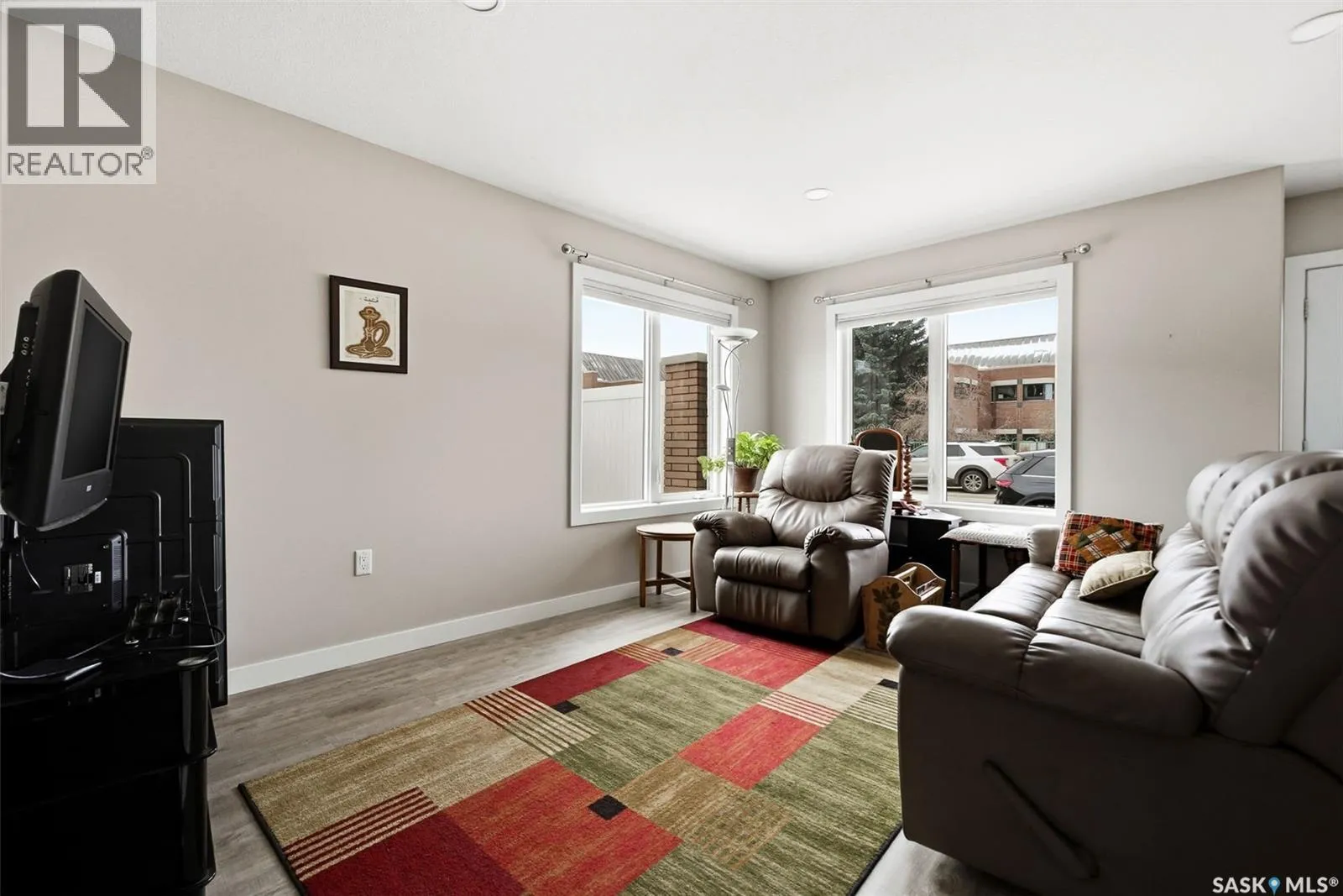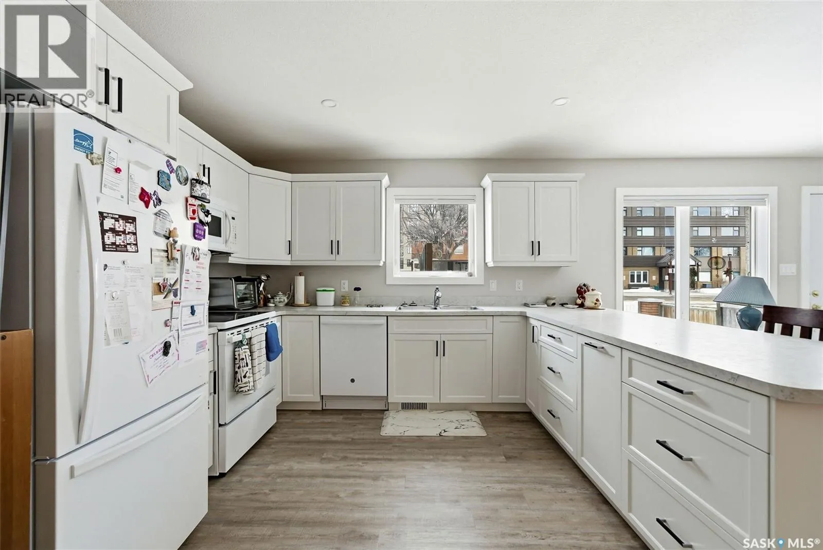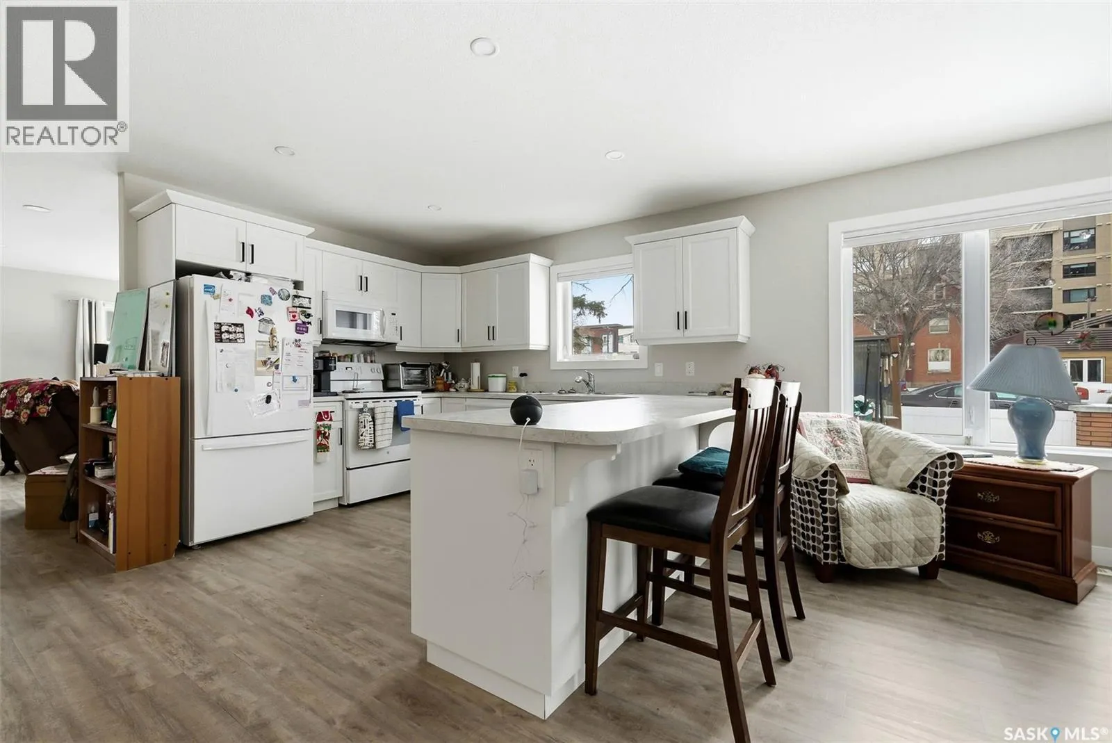 Truly one of a kind, this custom-built, all-brick, bungalow-style duplex offers 2,460 sq. ft. total of single-level, open-concept living and is fully wheelchair accessible to code. The bright living room features large windows with window treatments throughout. A functional open-concept kitchen with modern white cabinetry and ample storage flows seamlessly into the dining area, with garden doors leading to a
