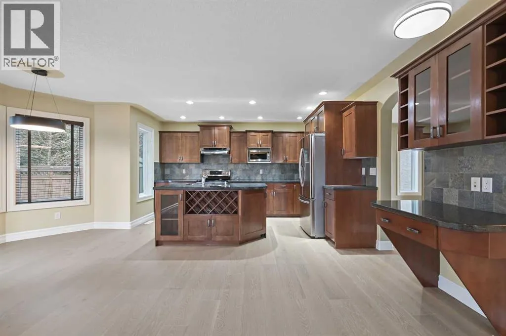 ready and filled with natural light.The main floor, with newly laid engineered hardwood throughout, is open and airy with oversized windows and a bright front living room. French doors lead directly to a large front balcony, providing a private outdoor space for morning coffee or watching the Stampede fireworks. The kitchen blends warmth and function with solid wood cabinetry, a built-in pantry, granite countertops, and stainless steel appliances. The layout connects effortlessly to the breakfast nook, formal dining area, and family room, making it an ideal setup for both entertaining and daily family life.Upstairs, the primary suite takes advantage of the private surroundings and includes a large walk-in closet and a relaxing 4-piece ensuite with a deep jetted tub. Two additional bedrooms, an upgraded 3-piece bathroom with a large walk-in shower, and a sunny flex space with views ensure there is plenty of room for everyone to spread out. The finished lower level offers a versatile space for a recreation room or guest area, featuring a fireplace, a full 4-piece bathroom, ample storage, and the flexibility to easily add a fourth bedroom if desired.The outdoor living space is meticulously landscaped with a large concrete patio, grassy areas, and mature trees, offering a private retreat backing onto the ridge. Practical upgrades include an EV-ready double garage, programmable Gemstone exterior lighting, a newer roof (2025), and central air conditioning (2025). The home also features an updated (2024) high-efficiency furnace, brand new engineered hardwood flooring, modern lighting, newer carpet, and fre sh interior and exterior paint.Located just minutes from the Westside Rec Centre, schools, the LRT, and downtown, this property offers a quick commute while maintaining easy access to the mountains. This home combines a quiet, connected location with extensive recent upgrades, representing exceptional value in one of Coach Hill’s most desirable pockets. (id:64429)