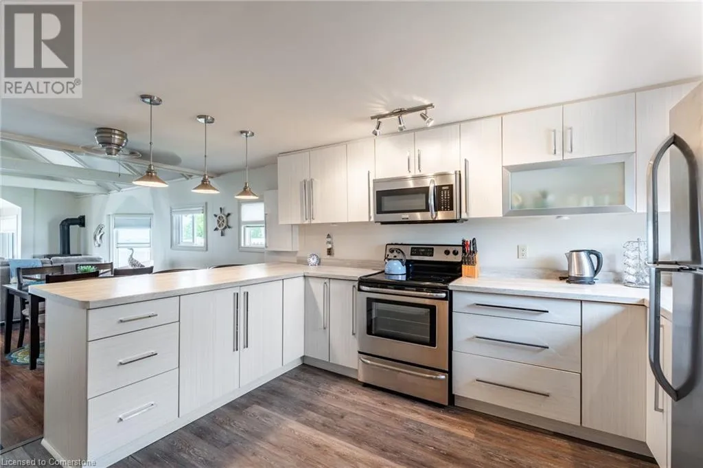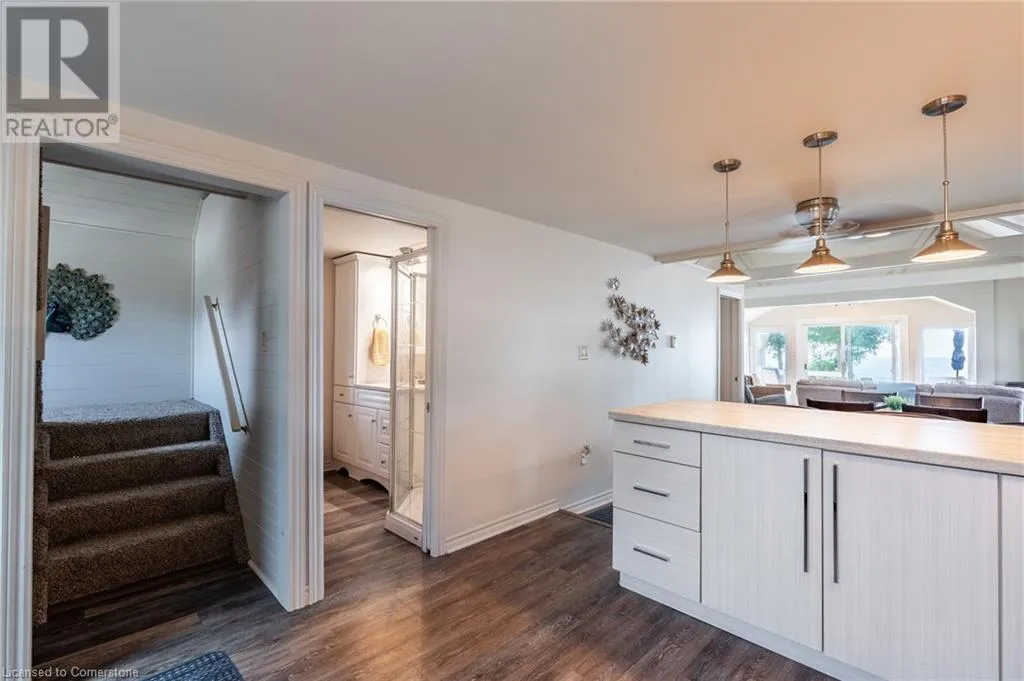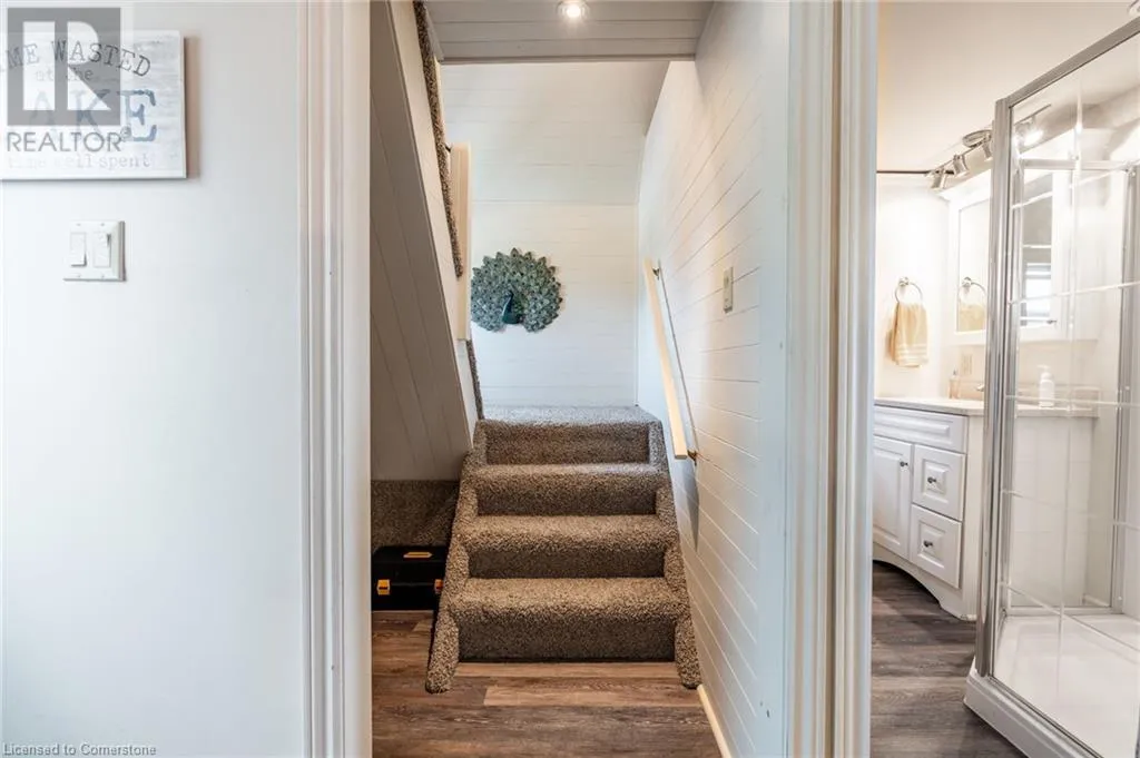 +"PublicRemarks": "COME HOME TO THE LAKE! 3 Wilcox is a nicely appointed corner lot in Peacock Point with Lake Erie views from all sides of the oversized patio. Parking for four, hot tub, firepit, 12X12 workshop and quaint rustic cedar storage shed complement the very well positioned lot. Indoors has been masterfully updated including a kitchen with high end appliances and quartz counters, bathroom with walk in glass shower, custom live edge woodwork and heated floor, family room with professionally installed in-ceiling Dolby Atmos 7 speaker system and accent wall, modern glass railings and door, custom shelving and so much more. The full basement offers two more bedrooms and a family room awaiting your creativity. Year round living, a vacation home, or investment, this home has many possibilities. (id:62650)"