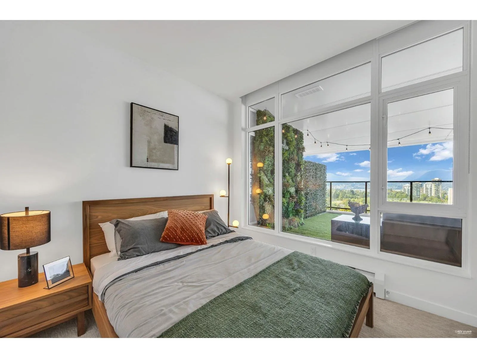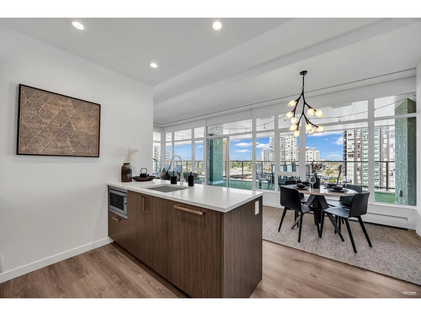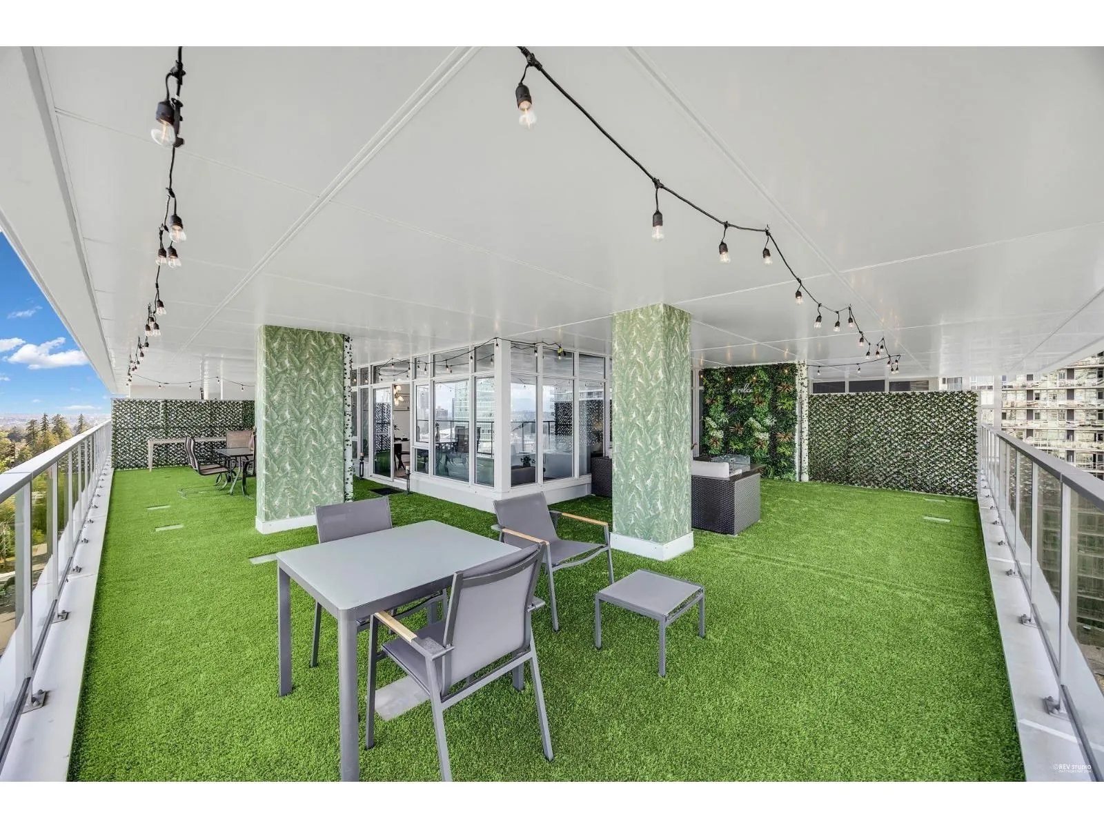 Presenting one of the most exceptional 2-bedroom, 2-bath residences in the heart of Downtown Surrey. This luxurious home offers soaring 12-ft ceilings and an expansive 1,200+ sq ft covered patio with premium artificial turf-perfect for year-round outdoor living. Positioned on the northeast corner, enjoy breathtaking panoramic views of the city skyline and Mount Baker. Truly one of a kind, with