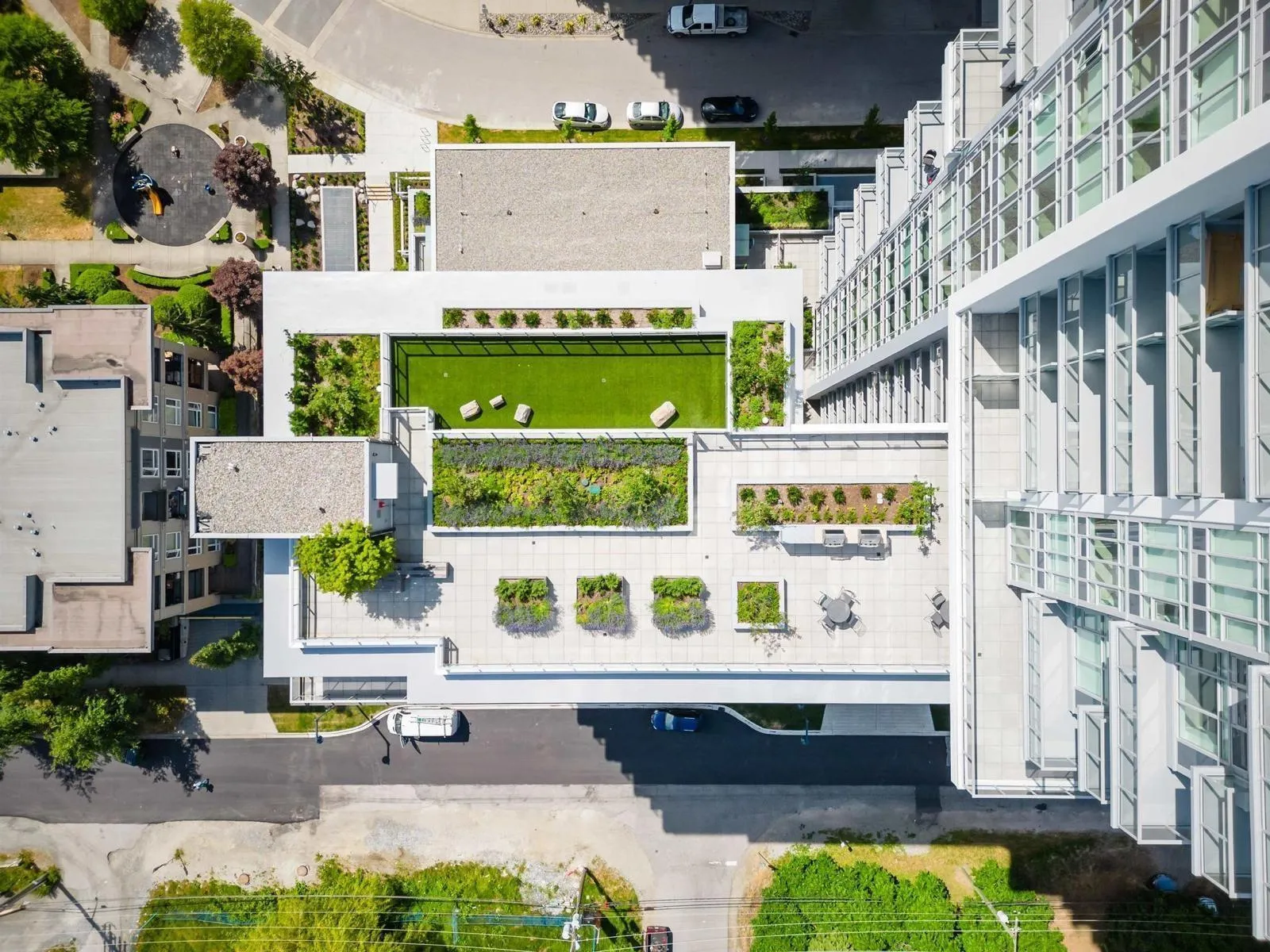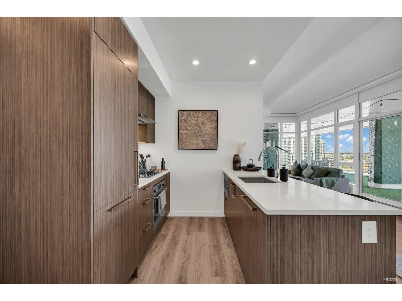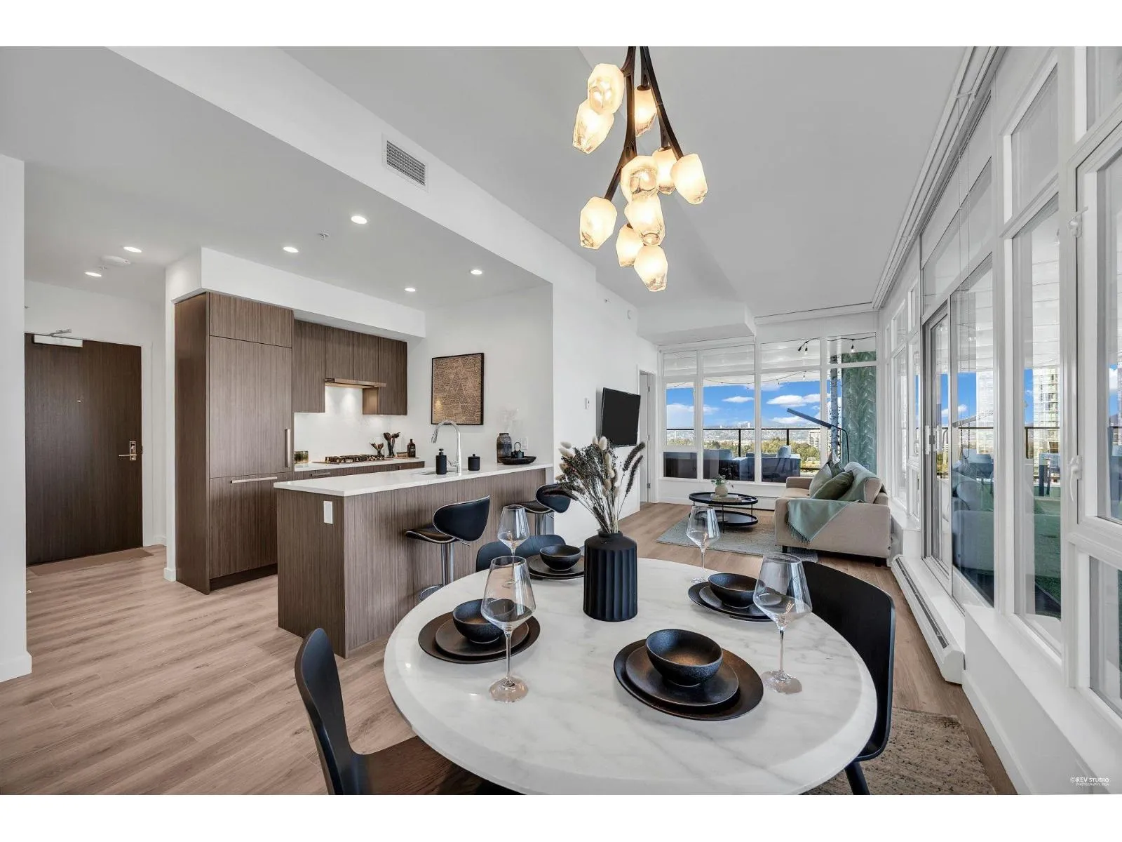 Presenting one of the most exceptional 2-bedroom, 2-bath residences in the heart of Downtown Surrey. This luxurious home offers soaring 12-ft ceilings and an expansive 1,200+ sq ft covered patio with premium artificial turf-perfect for year-round outdoor living. Positioned on the northeast corner, enjoy breathtaking panoramic views of the city skyline and Mount Baker. Truly one of a kind, with